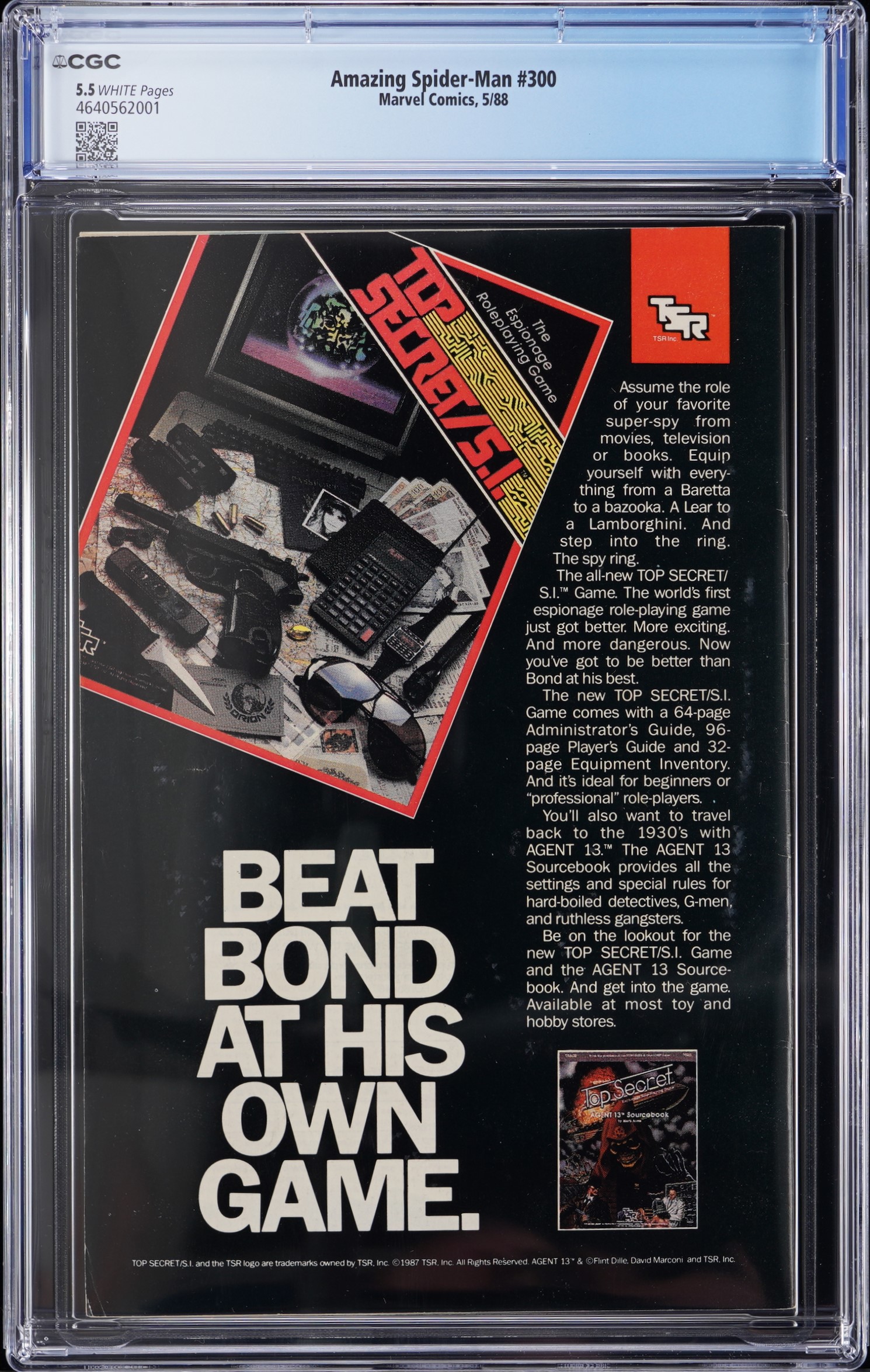A time-honored classic makes the scene, with the offering of this 5/88 Marvel Amazing Spider-Man #300 issue. One of Todd McFarlane's earliest works on this title, this famous key issue is fronted by iconic cover, featuring Spider-Man wearing the black suit for the last time. More importantly, this Copper Age classic boasts the first full appearance of alien symbiote Venom. Since his introduction nearly forty years ago, the sometimes villain, sometimes anti-hero Venom has proven wildly popular with readers, and to collectors he is pure comic book gold. The offered example of this always in demand issue is graded 5.5, White Pages by CGC. Label notes are "David Michelinie story, Todd McFarlane cover & art. Origin & 1st full appearance of Venom (Eddie Brock). Thing appearance. Last black costume.".