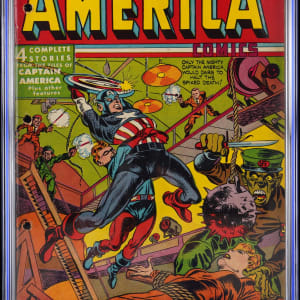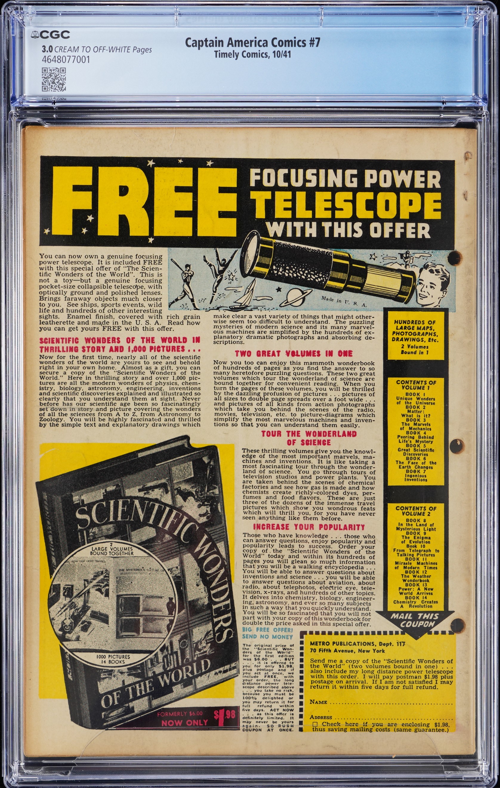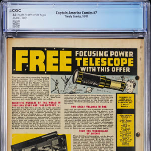 Dream team Stan Lee, Joe Simon and Jack Kirby are the creators that gave us this 10/41 Timely Comics Captain America Comics #7 issue. A blockbuster title during the WWII era, Captain America Comics was Timely Comics' front-runner during the 1940s, and eighty years later surviving copies from the title's Golden Age run are prime targets for advanced collectors. Advance your collection with the addition of this #7 issue from the first year of the run, which is highly regarded for its classic cover featuring Captain America and his loyal sidekick Bucky Barnes swooping into a bondage scene, with bound woman facing the "Spiked Death", Appearing in this issue, is Cap's arch enemy, the Red Skull. This comic is graded 3.0, Cream to Off-White Pages due to hole punches near the spine. Otherwise, it likely would have graded VG-FN, or perhaps slightly higher. This book was examined prior to grading submission, and the hole punches affect the border only, not the art panels. Label notes are "Stan Lee, Joe Simon & Jack Kirby stories, Jack Kirby & Joe Simon art, Jack Kirby & Syd Shores cover. Red Skull appearance. Hurricane & Father Time backup stories. Classic cover. Bondage cover.".