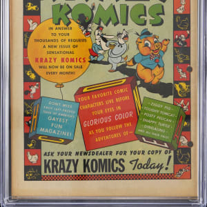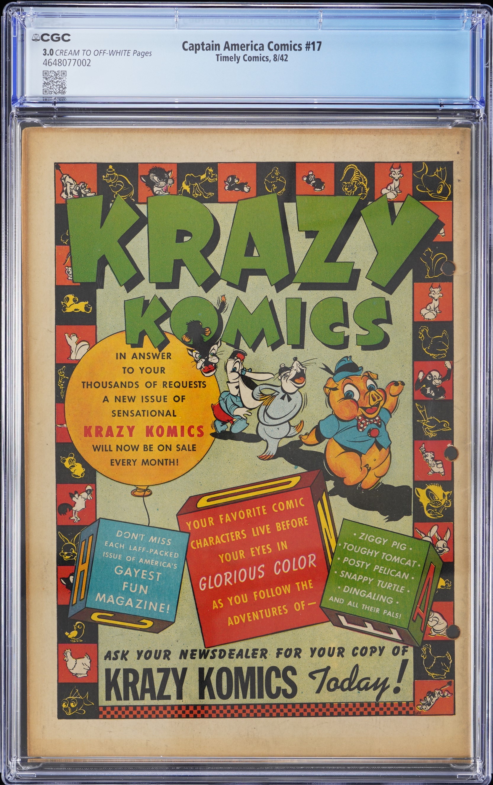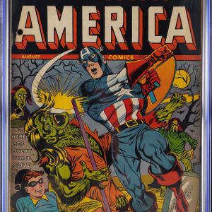 The Star-Spangled Avenger KOs a ghoul to prevent him from burying his trusty sidekick Bucky Barnes alive, on the front cover of this 8/42 Timely Comics Captain America Comics #17 issue. Cap was in his prime when this early Golden Age gem was published, and he looks pretty buff on this Al Avison cover, as he delivers his life saving right cross to the head of a fanged and furry green demon. Bucky is tied and chained at bottom left, and the tombstone he's leaning on proclaims the fate the demon intended for him. Best in the grading business CGC has rated this precious WWII era comic 3.0, Cream to Off-White Pages. If it weren't for three binder holes along the spine, this attractive book would likely have graded FN, or maybe even better. This book was examined prior to grading submission, and the hole punches affect the border only, not the art panels. Label notes are "Jimmy Thompson and Don Rico art, Al Avison cover and art. Fighting Yank backup story.".