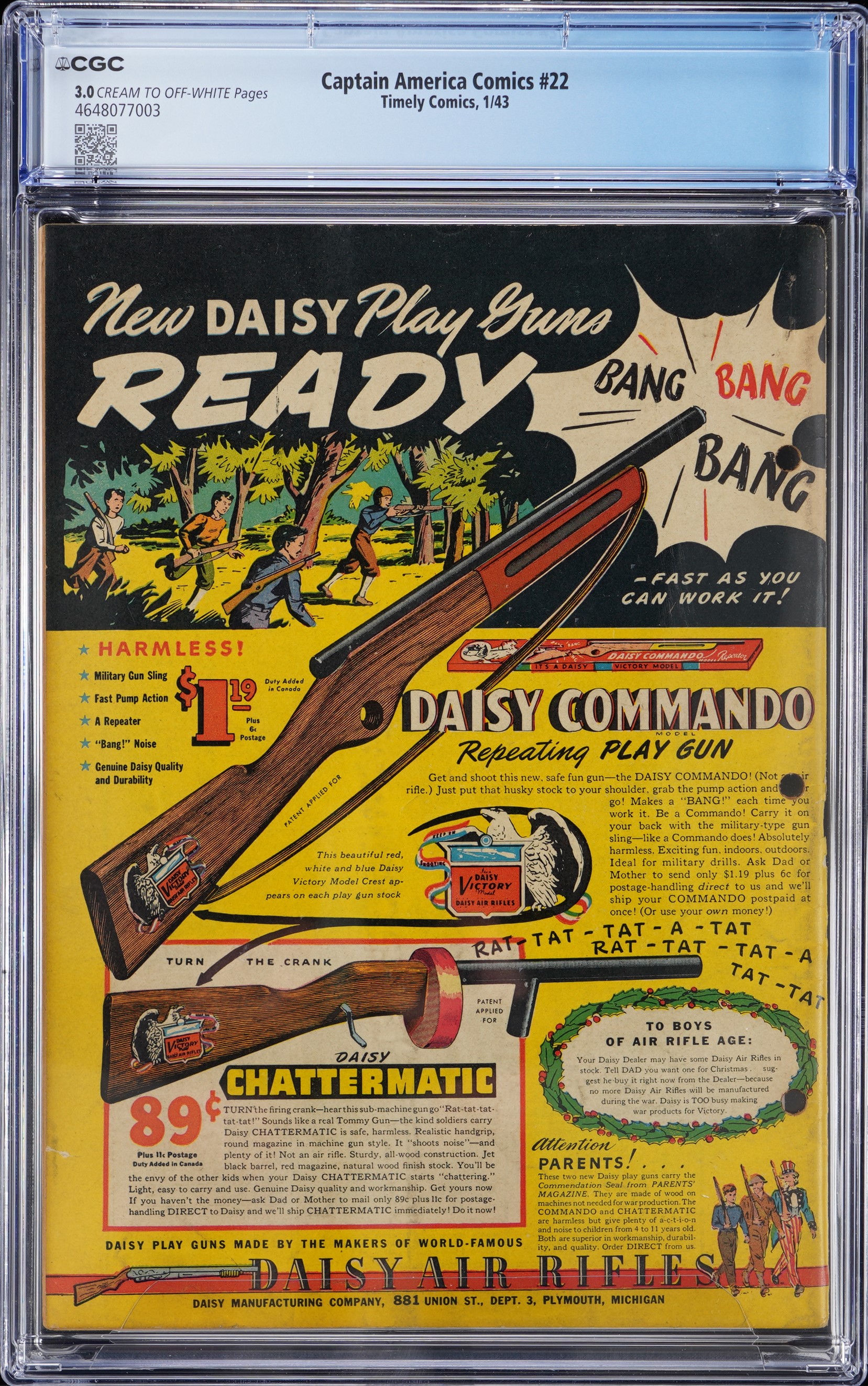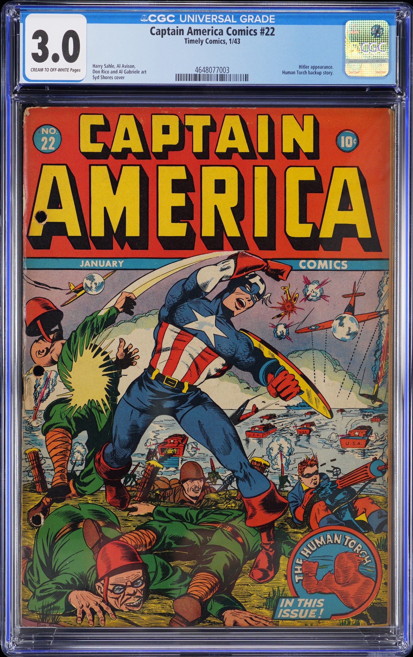 Captain America makes a timely appearance, with this 1/43 Timely Comics Captain America Comics #22 issue. It doesn't get much better for WWII era comics, than the front cover provided by master Syd Shores for this triumphant Golden Age issue. Cap is a star-spangled fury at the center of the action, as he leads U.S. Marines on an invasion of a Pacific island held by Japanese forces. Trusty sidekick Bucky is manning a machine gun at right, and the issue promises more action with a backup story featuring the Human Torch, who makes a cover appearance in a bottom right inset. CGC has graded this fantastic battle issue 3.0, Cream to Off-White Pages. If not for binder hole punches along the spine, this comic looks as though it would have graded VG+. This book was examined prior to grading submission, and the hole punches affect the border only, not the art panels. Label notes are "Harry Sahle, Al Avison, Don Rico and Al Gabriele art, Syd Shores cover. Hitler appearance. Human Torch backup story.".
