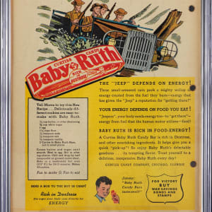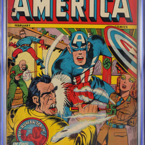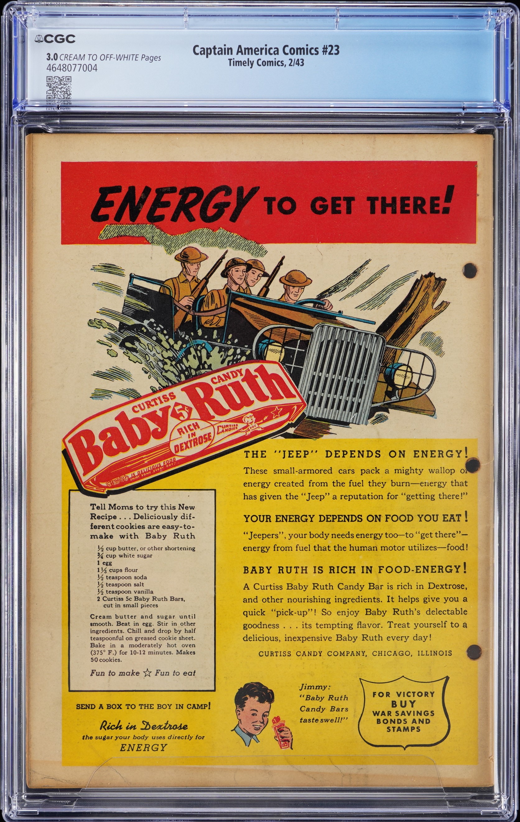 DC had Superman and Batman, Fawcett had Captain Marvel and The Marvel Family, and Timely Comics countered with its "Big Three", Captain America, Sub-Mariner and Human Torch. The foremost of these Golden Age Timely heroes makes the scene, with this 2/43 Captain America Comics #23 issue. The bad guys get their due form the shield-wielding Captain America and his johnny-on-the-spot sidekick Bucky, in the action-packed front cover scene rendered by Syd Shores. Cap's Throwing a haymaker, and Bucky's making a leap from above, to tackle a Nazi gunman taking aim at his heroic partner. An inset at bottom left touts a backup story starring another Big Three hero, the Human Torch. Binder holes along the spine limit the grade provided by CGC to 3.0, Cream to Off-White Pages, for this otherwise attractive WWII era comic. This book was examined prior to grading submission, and the hole punches affect the border only, not the art panels. Label notes are "Otto Binder story, Al Avison art, Syd Shores cover. Human Torch backup story.".