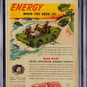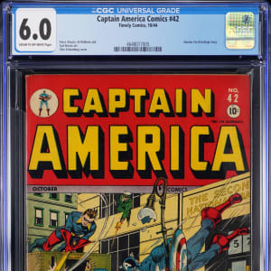 Before he went into a deep freeze, Captain America was the star attraction for Timely Comics during the 1940s. The red, white and blue super-soldier swoops into action, with this 10/44 Timely Comics Captain America Comics #42 issue. The brand of mayhem charging up Alex Schomburg's front cover, is the epitome of the wild frontier that was the pre-code era. Bullets are flying, uniform guards are sprawled on the pavement, and Bucky is eagerly bashing the face of a bank robber with a baseball bat. If the cover thrills don't get you, the desirable 6.0, Cream to Off-White Pages grade from leading certification CGC surely will. As noted at bottom right of this incredibly vibrant Golden Age comic, the Human Torch appears in a backup story. Label notes are "Vince Alascia, Al Bellman and Syd Shores art, Alex Schomburg cover. Human Torch backup story.".