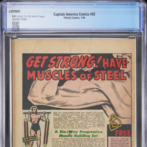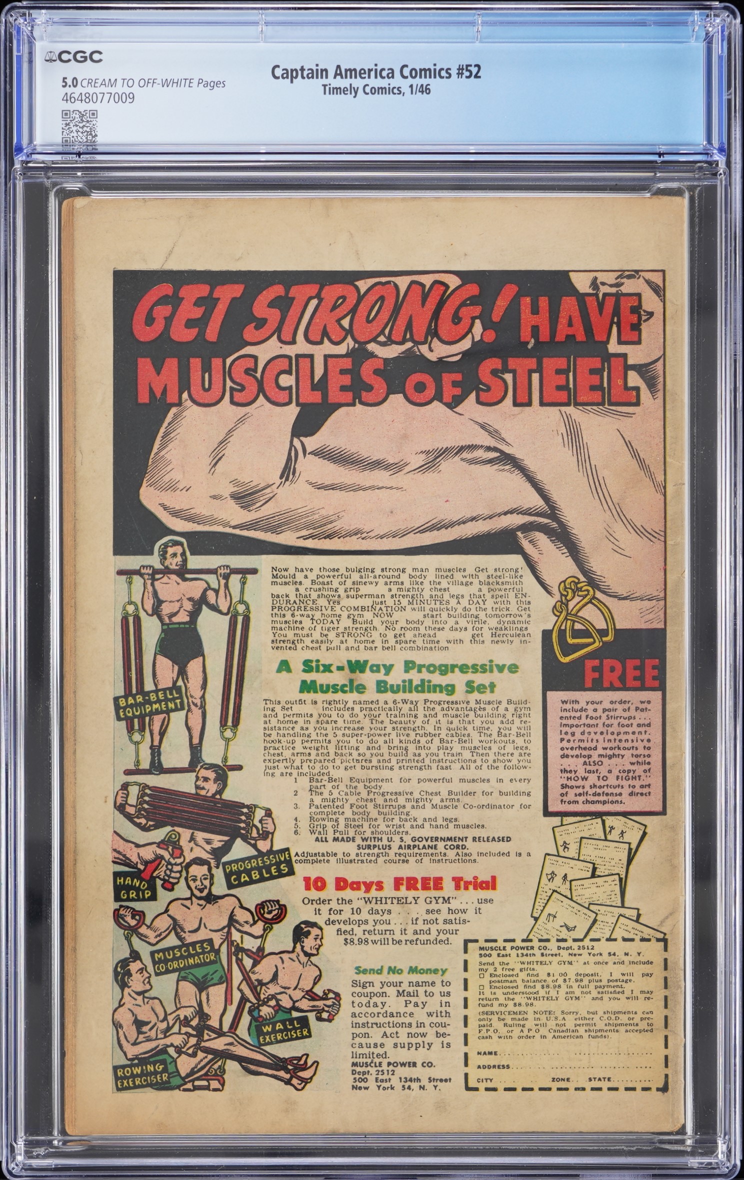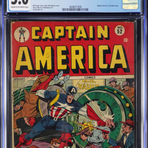 The first Avenger saves the day, with this 1/46 Timely Comics Captain America Comics #52 issue. Actually, Captain America and his loyal sidekick Bucky Barnes save a whole lot of days, as they battle it out to foil an atomic bomb heist. Published shortly after the bombing of Hiroshima and Nagasaki, this issue is fronted with a harrowing cover by legendary artist Alex Schomburg, as an early presentation of a theme that remains prevalent in spy thrillers to this day. A nicely preserved example, this historic Golden Age comic has scored a favorable grade of 5.0, Cream to Off-White Pages from CGC. Appearing in backup story in this "must-have" Atom Bomb issue, are the Human Torch and Cat-Man. Label notes are "Bill Finger story, Alex Schomburg cover, Vince Alascia, Al Bellman and Al Gabriele art. Human Torch vs. Cat-Man story.".