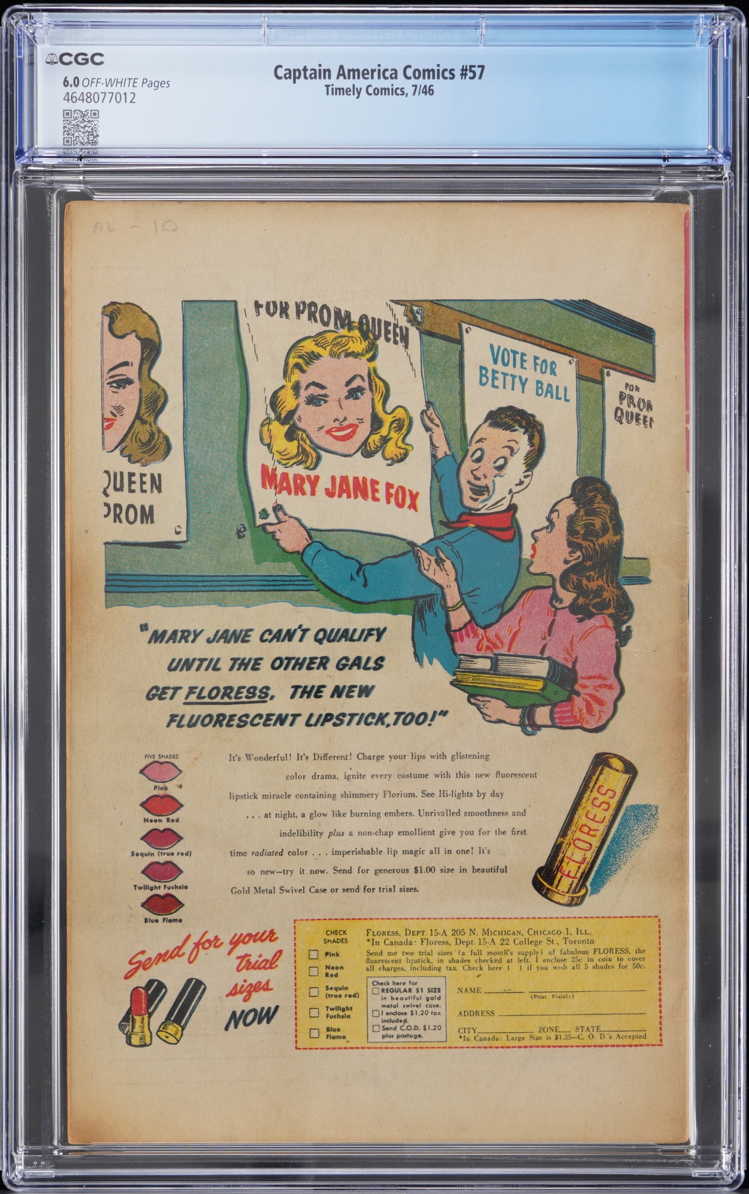 An iconic cover fronts this 7/46 Timely Comics Captain America Comics #57 issue, and an inviting grade designation backs it up. Vince Alascia deserves high praise for his glorious front cover artwork. Bill Finger is credited with the story, and legend Carmine Infantino got into the act as one of several artists who contributed to the creation of this Golden Age issue. Alascia's masterpiece cover speaks for itself, as seen below. The very pleasing 6.0, Off-White Pages grade has been freshly delivered by CGC. Label notes are "Bill Finger story, Vince Alascia cover, Al Avison, Vince Alascia, Jim Mooney and Carmine Infantino art. Human Torch story.".