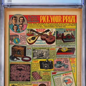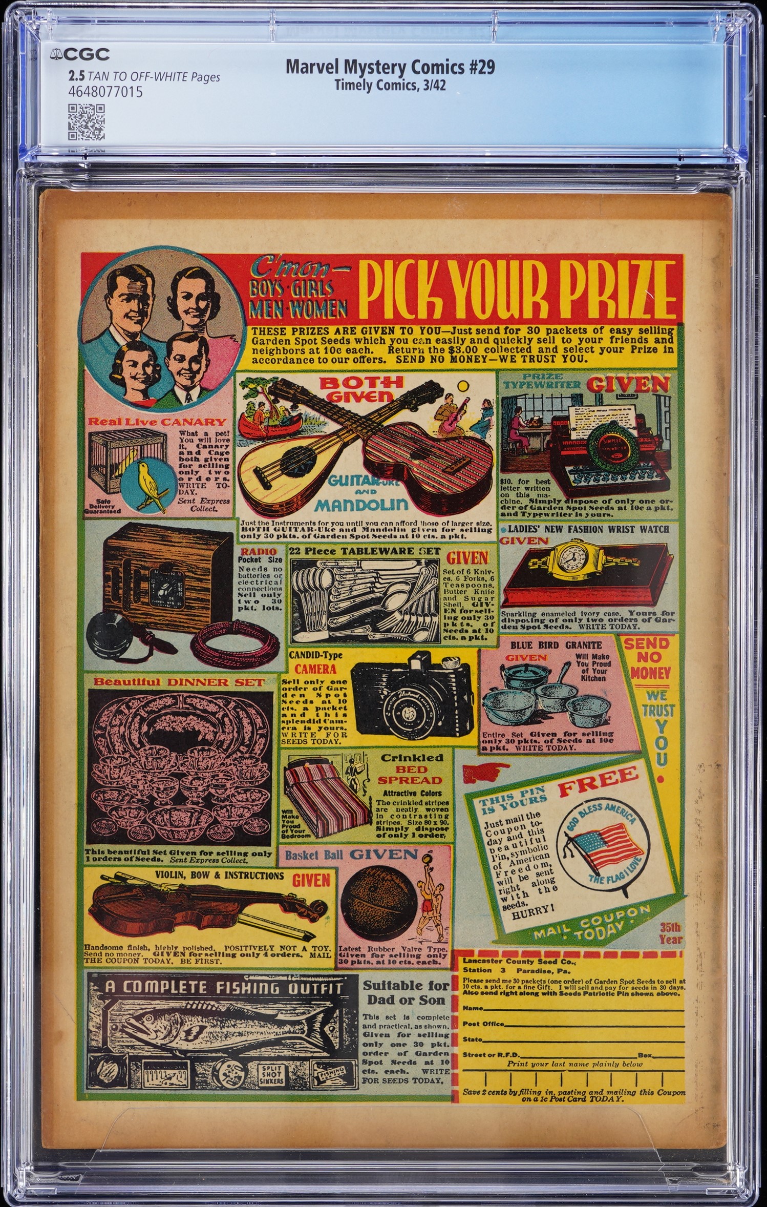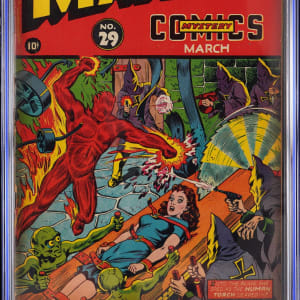 Turn up the heat when you bring home this 3/42 Timely Comics Marvel Mystery Comics #29 issue, featuring the Human Torch. This prized WWII era comic has a heck of a lot going for it, including a cover scene with a beauty in bondage about to be buzzsawed down the middle at the hands of hooded Nazis in iron cross robes, and their demonic green imps. Fear not, because the Human Torch is coming to the rescue of the bound lady in distress. Beyond this compelling cover by Alex Schomburg, this Golden Age pre-code issue is prized for a decapitation panel, and a text story by renowned crime novelist Mickey Spillane. CGC has just returned this thriller with a grade of 2.5, Tan to Off-White Pages. Label notes are "Carl Burgos & Bill Everett story & art, Ray Gill story, Syd Shores, Bob Oksner & Al Fagaly art, Alex Schomburg cover. Mickey Spillane text story. Bondage cover. Decapitated head panel.".