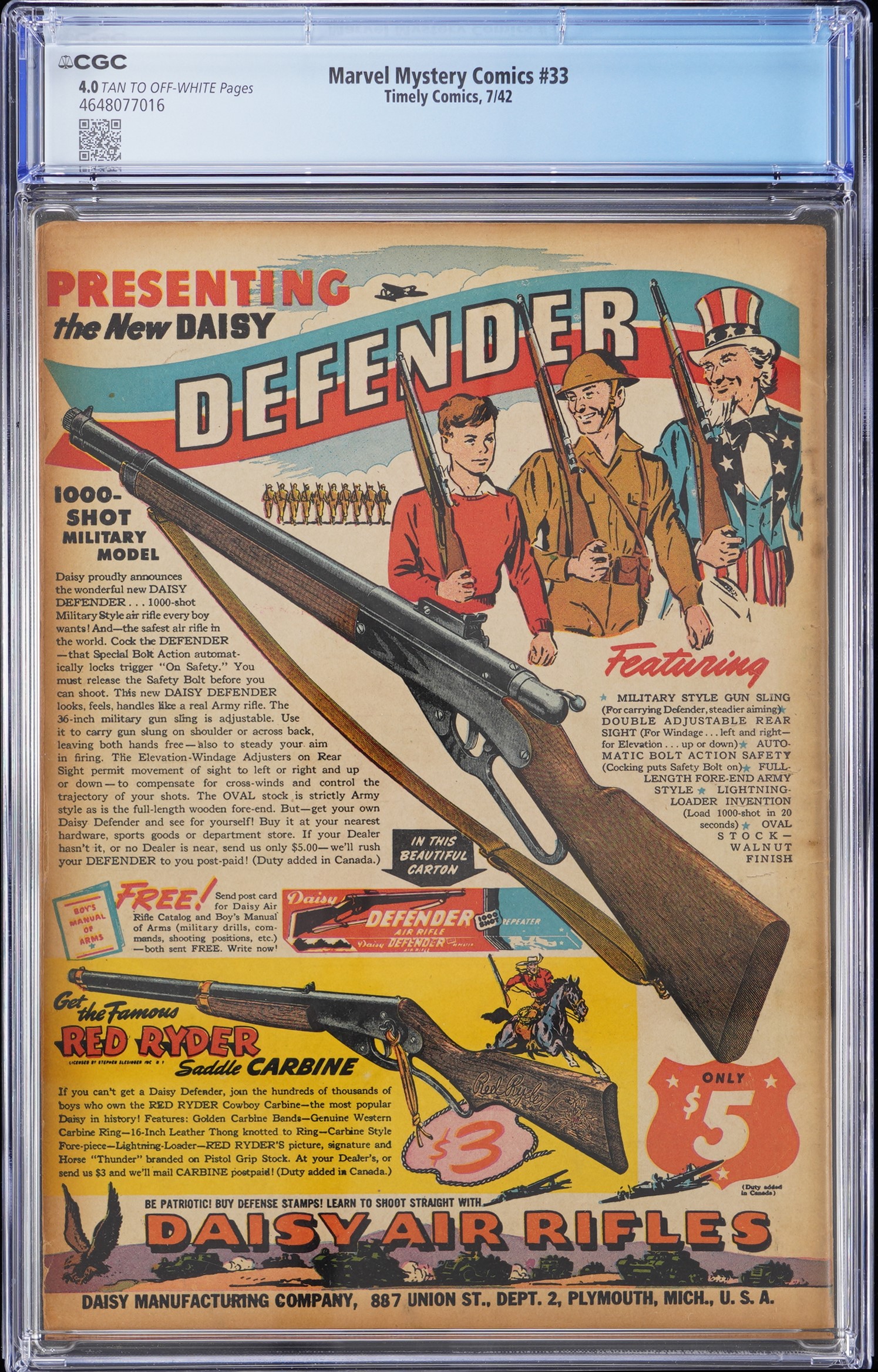 A WWII battle to save New York City rages in this 7/42 Timely Comics Marvel Mystery Comics #33 issue. Alex Schomburg's incredible cover sees the fire and water combo Human Torch and Sub-Mariner join forces, to thwart a deadly invasion by "Jap Hordes" bent on a "Terror Air-Raid!". Schomburg went all in on this gripping cover, with guns blazing, fists flying, and two of Timely's "Big Three" Golden Age super-heroes teaming-up to save "The Big Apple". Seen on the header, the Timely Shield mini-logo makes it third appearance. Also found in this dynamic issue, is a text story from best in the business crime novelist Mickey Spillane. CGC has graded this nicely preserved comic 4.0, Tan to Off-White Pages. Label notes are "Ray Gill story, Alex Schomburg cover, Carl Burgos, Bob Oksner, Carl Pfeufer, Syd Shores and Al Gabriele art. 3rd "Timely Shield (Mini)" logo. Text story by Mickey Spillane.".