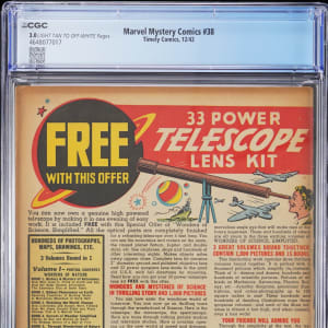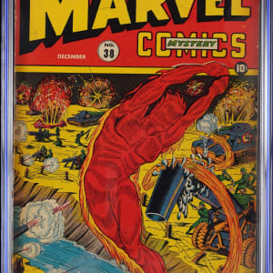 Long before Johnny Storm "flamed-on" for this first time, there was the Timely android version of the Human Torch. See this Golden Age super-hero do his thing, with the viewing of this 12/42 Timely Comics Marvel Mystery Comics #38 issue. Legend Syd Shores drew the cover assignment, and he came through in a big way, with a dynamic WWII battle scene dominated by the fiery Torch, who is scorching the Nazi forces. Fresh back from CGC grading submission, this ancient comic has earned a rating of 3.0, Light Tan to Off-White Pages. Label notes are "Bob Oskner and Harry Sahle art, Syd Shores cover and art.".
