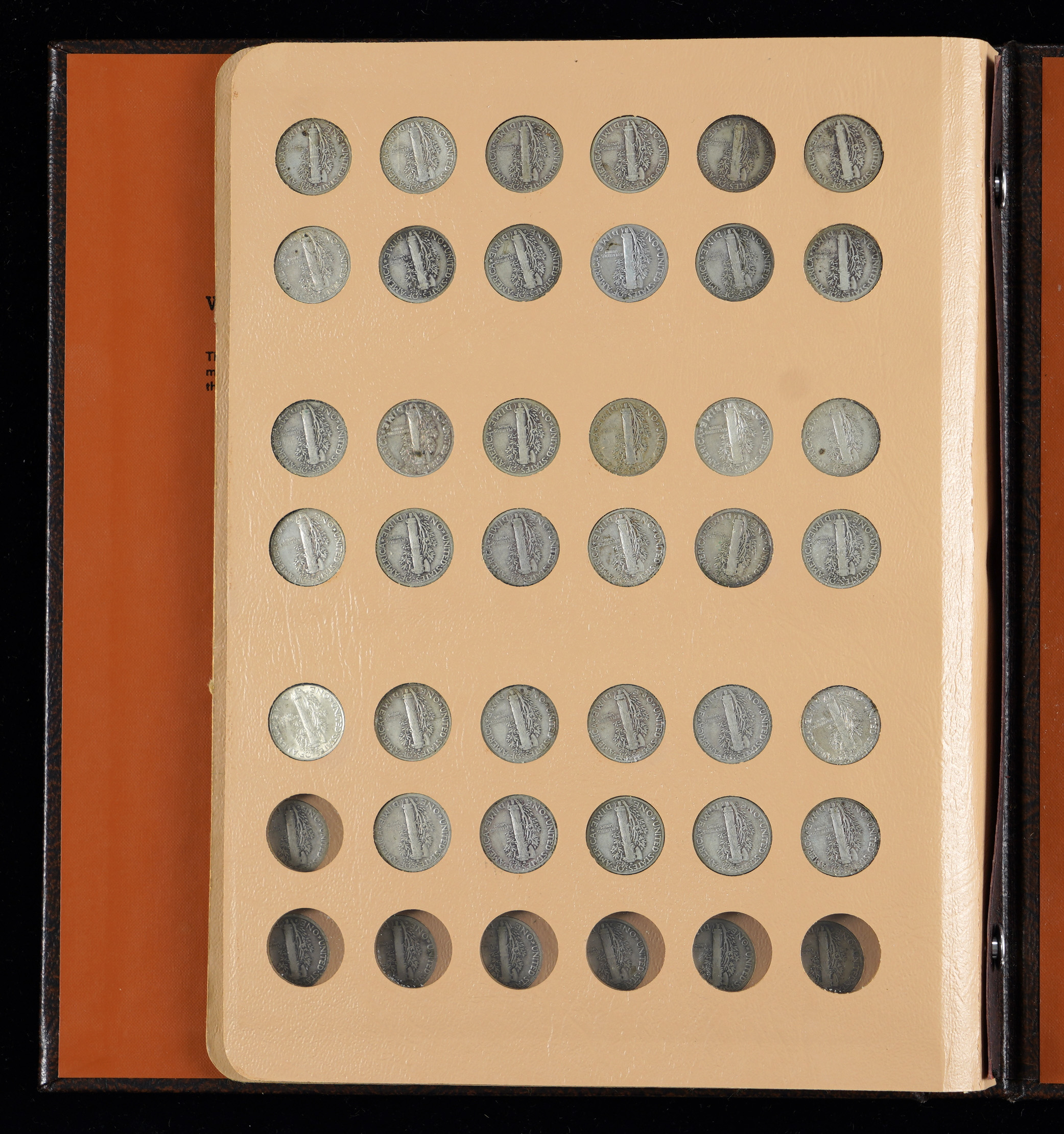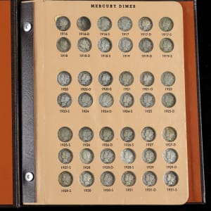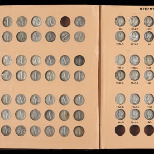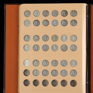 A popular coin type is showcased with the presentation of this 1916-1945 Mercury Dime near-complete set (76/77). This set of silver dimes is housed in a deluxe Dansco album, and condition is average to better. Graced with an elegant design, the Mercury dime has been out of circulation for a full seventy years now, and most collectors view the type as an essential inclusion for their collections. The lone absent coin is the elusive 1916-D. All other coins for this series are present and accounted for, including the semi-keys 1921 and 1921-D, which both rate as GD. The balance range 80% VG to VF+, 20% GD. The 1944 coin stands out as a pleasing exception, in XF+ condition.