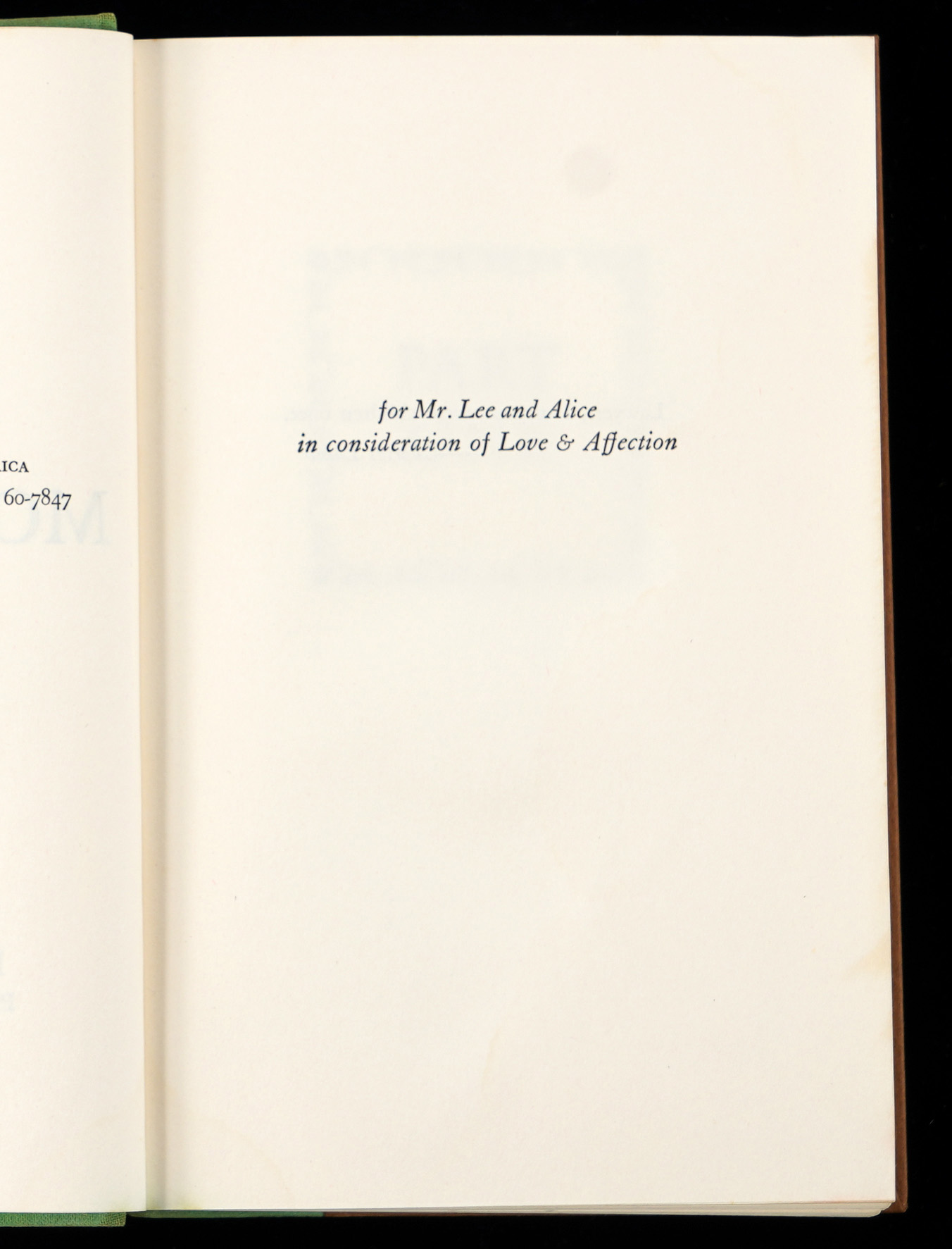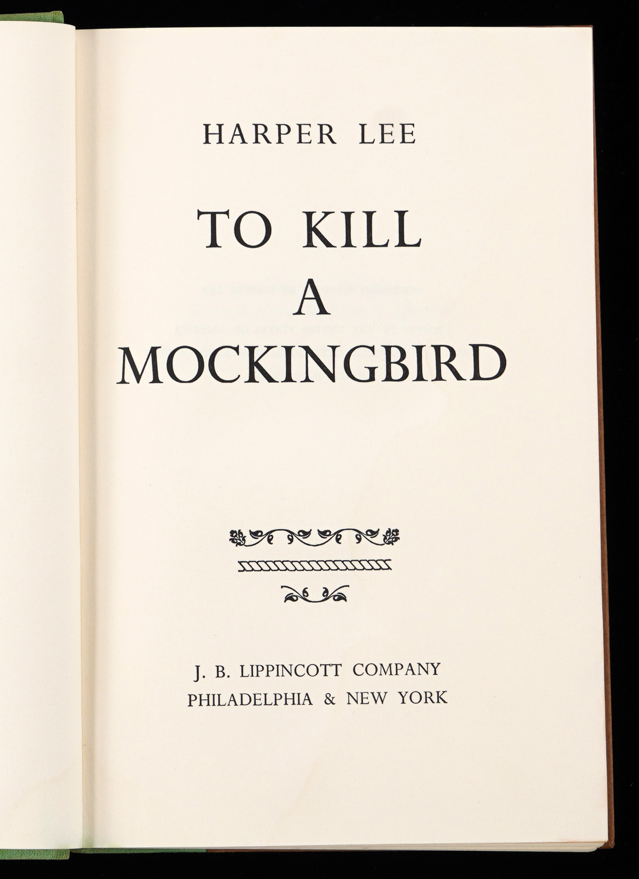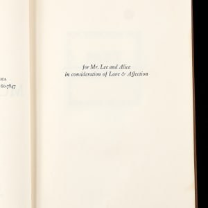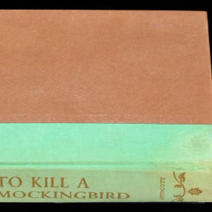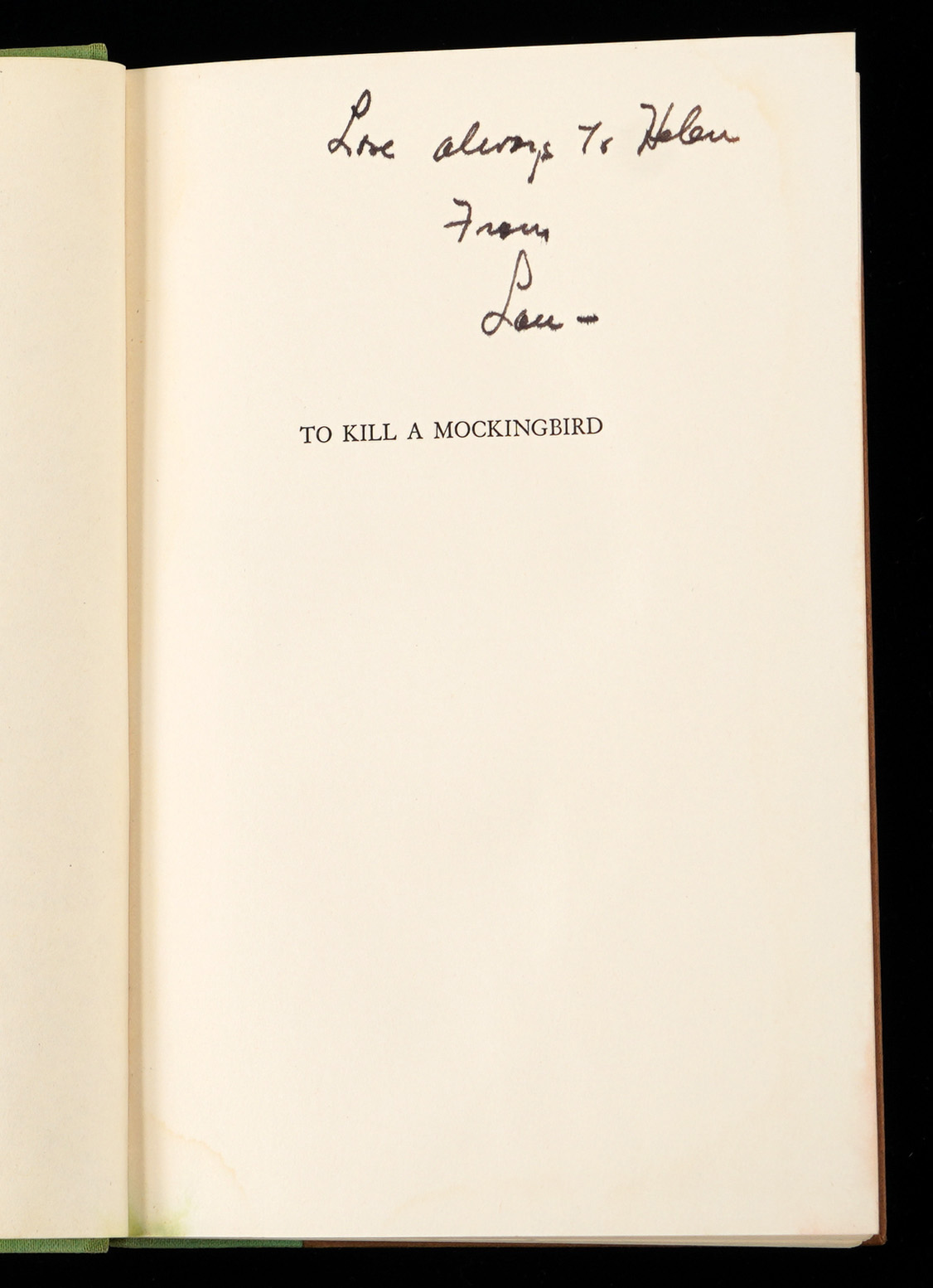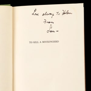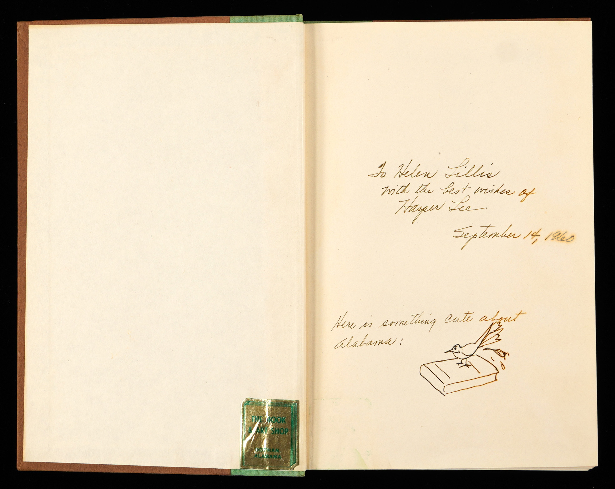 This fourth printing book is stated as being a “Fourth Impression” example, with standard brown cover boards, and a green spine. The spine is sturdy, though moderately faded, while the spine lettering and graphics retain a strong degree of integrity. Fledgling author Lee has signed gracefully on the flyleaf page, and she has included the gracious personalization “To Helen Lillis with the best wishes of Harper Lee”, along with the date inscription “September 14, 1960”, and a sketch of a mockingbird accompanied by another inscription which reads “Here is something cute about Alabama”. Opposite the signed page, the inside of the front cover is affixed with a gold foil bookseller label that reads “The Book & Art Shop, Dothan, Alabama”. Located on the title page, is a gifting presentation note that reads “Love always to Helen From Lou –“, suggesting Lou had Lee sign this book for the object of his affection, Helen.