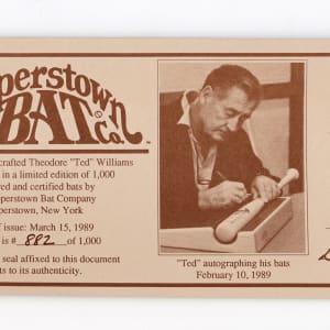 A handsome example of Ted Williams signature arrives with this signed limited-edition 1989 Cooperstown Bat Co. Famous Player Series bat. This slick, like-new bat comes with a Cooperstown Bat Co. COA numbered "882/1,000", matching the digits impressed into the knob. Barrel labeling includes a brand logo, a Williams portrait photograph, and career highlights/stats. Williams has nicely spotted a first-rate blue felt-tip pen signature between the logo and the portrait.