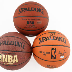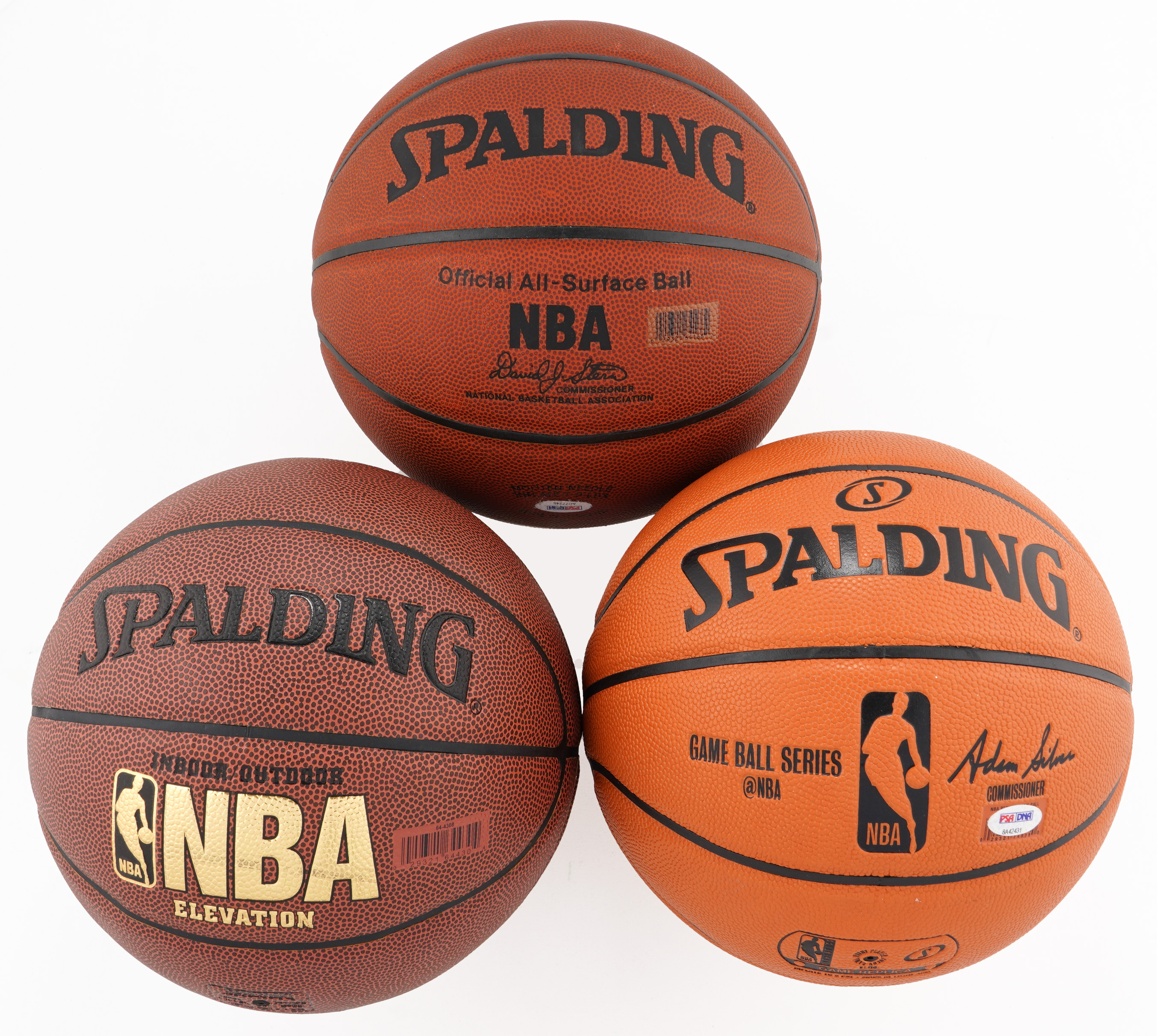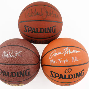 Collection of three single-signed basketballs signed, respectively, by legendary Hall of Famers Kareem Abdul-Jabbar, Magic Johnson, and Oscar Robertson. All three balls have been boldly signed, with the Abdul-Jabbar signature faded slightly, and have been individually authenticated (basic certifications with stickers on the balls) by PSA/DNA. This trio consists of the following: Abdul-Jabbar (black ink, Spalding Official All-Surface NBA basketball), Johnson (silver ink, Spalding Indoor/Outdoor Elevation NBA basketball), and Robertson ("Mr. Triple Dbl" inscription, silver ink, Spalding Game Ball Series basketball). Please note that these basketballs are currently slightly deflated, which does not detract from the presentation of the signatures. Additionally, the PSA/DNA certification sticker on the Abdul-Jabbar signed ball was placed over the air valve and has two small puncture holes, presumably as a result of an attempt to add air previously. This lot would make a worthy addition to any autograph or Hall of Fame basketball collection. The size/weight of this item requires that there will be an additional shipping charge for this lot. Total: 3 signed basketballs.