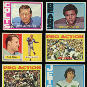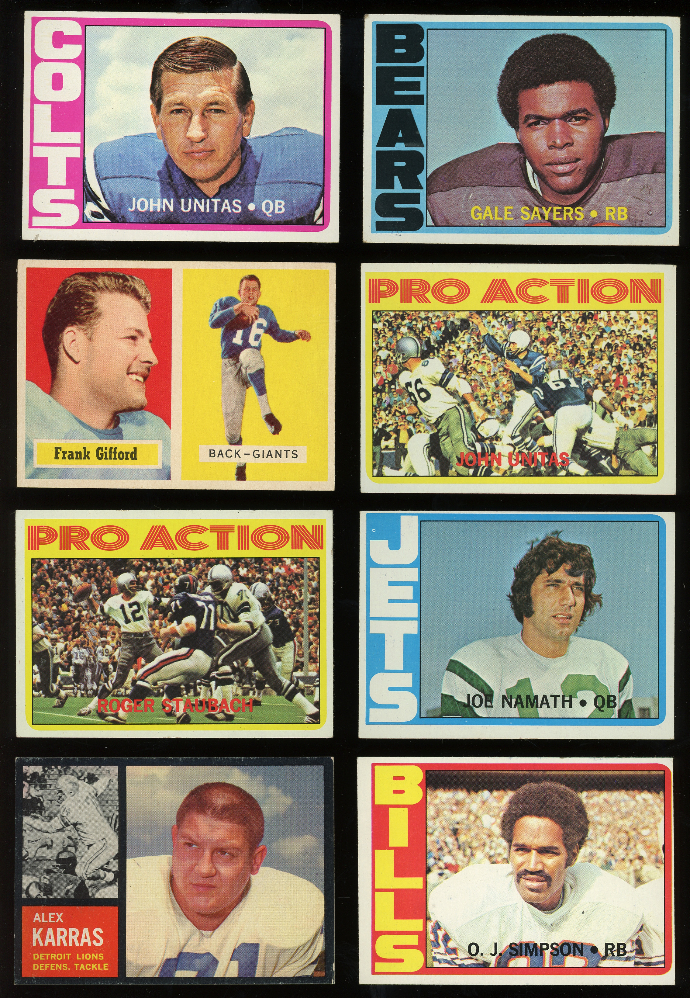 1972 Topps: (20 stars, average EX to EX-MT, includes one high number) with #65 Plunkett RC (VG-EX), #100 Namath (VG-EX), #110 Sayers (VG), #120 Bradshaw IA (VG-EX), #122 Staubach IA (VG-EX), #150 Bradshaw (VG-EX), #160 Simpson (VG-EX), #165 Unitas (EX), #251 Unitas IA (EX), #300 Page (NM);