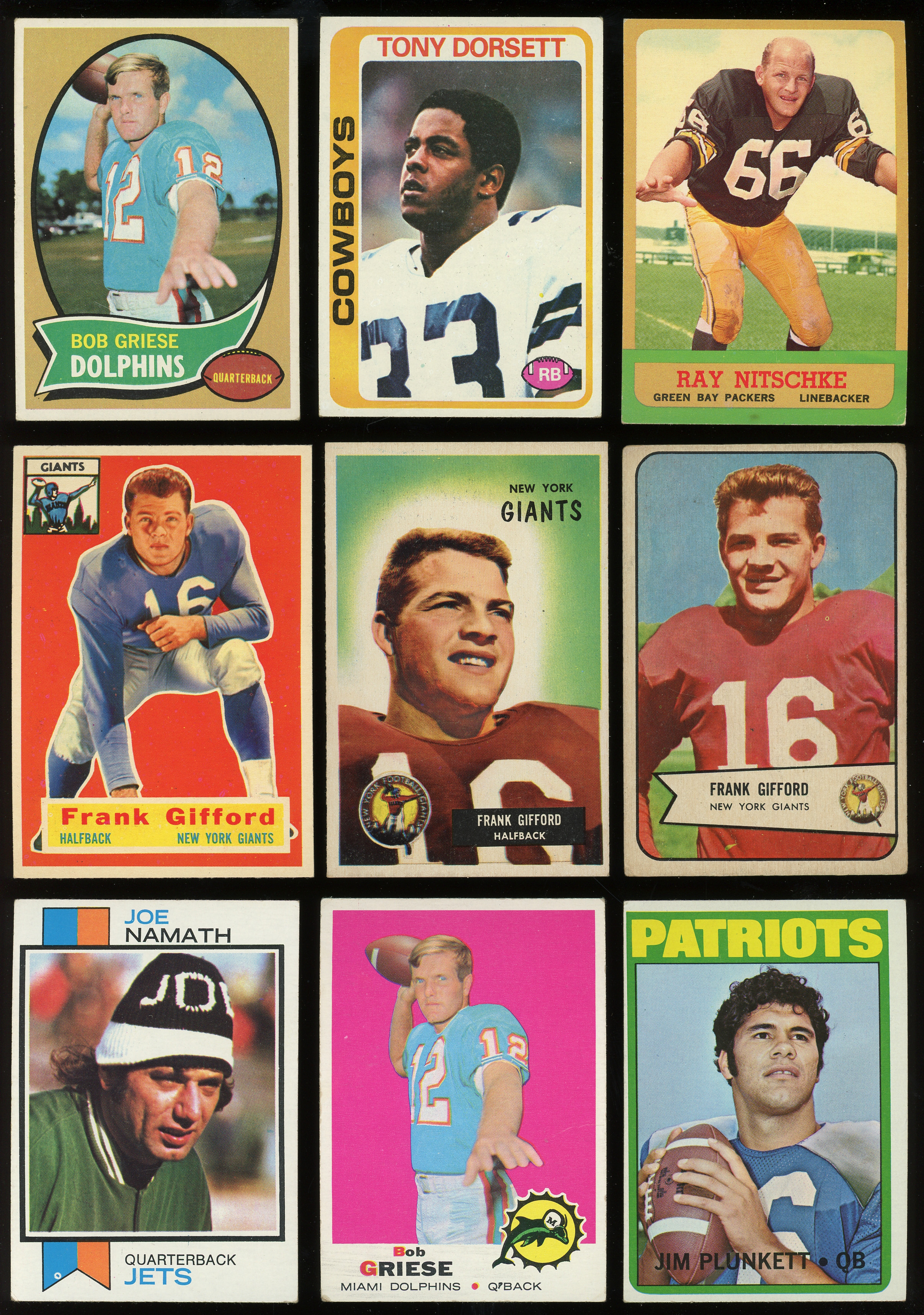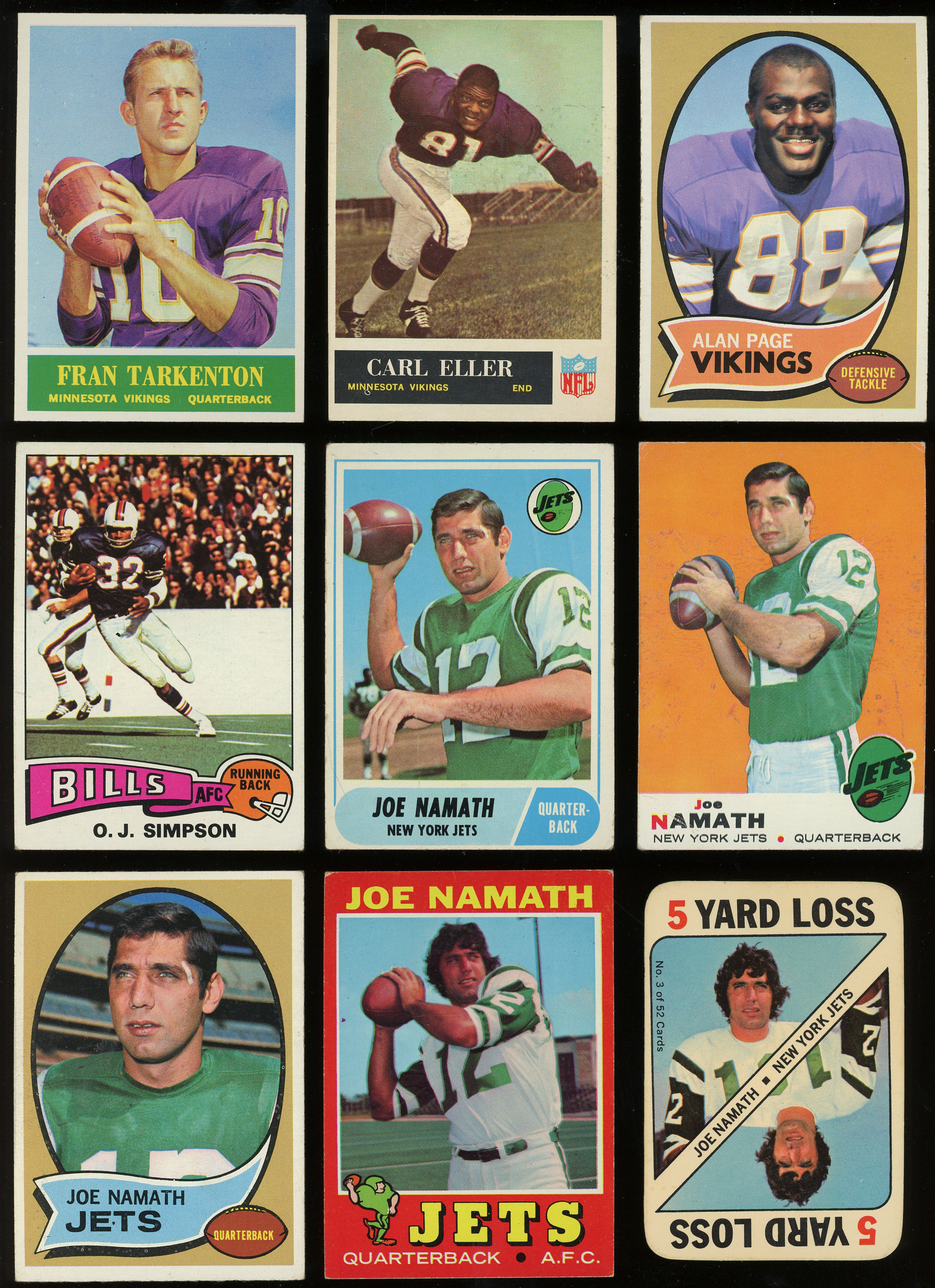 1970 Topps: (13 stars, average VG-EX) with #10 Griese (VG-EX), #59 Page RC (EX), #70 Sayers (EX-MT), #80 Tarkenton (VG-EX), #90 Simpson RC (GD), #150 Namath (VG-EX), #180 Unitas (VG-EX);