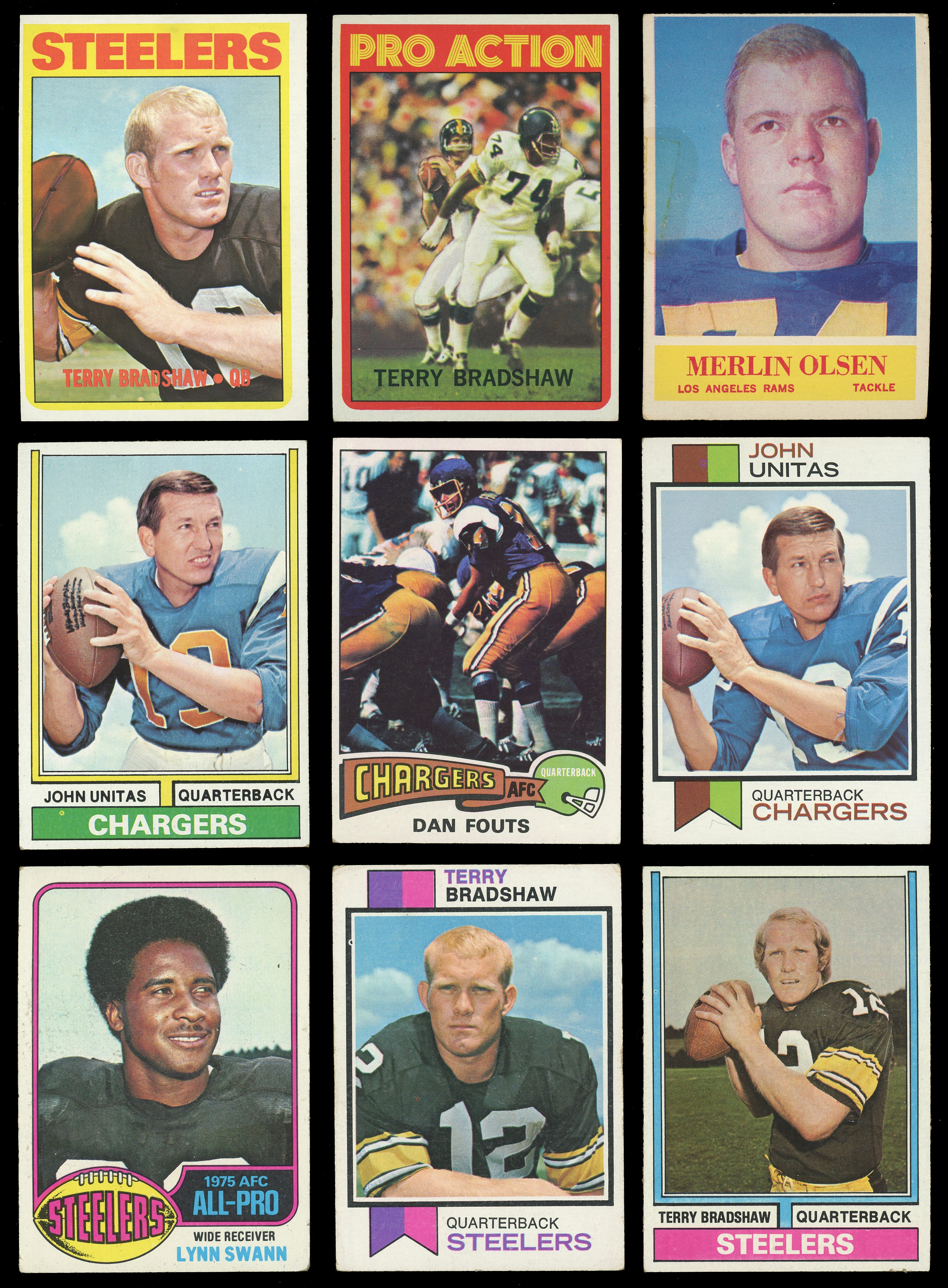 1974 Topps: (13 stars, average VG to VG-EX) with #150 Unitas (EX), signed #230 Butkus (“7”, card EX), #451 Stabler (GD), #470 Bradshaw (VG-EX);