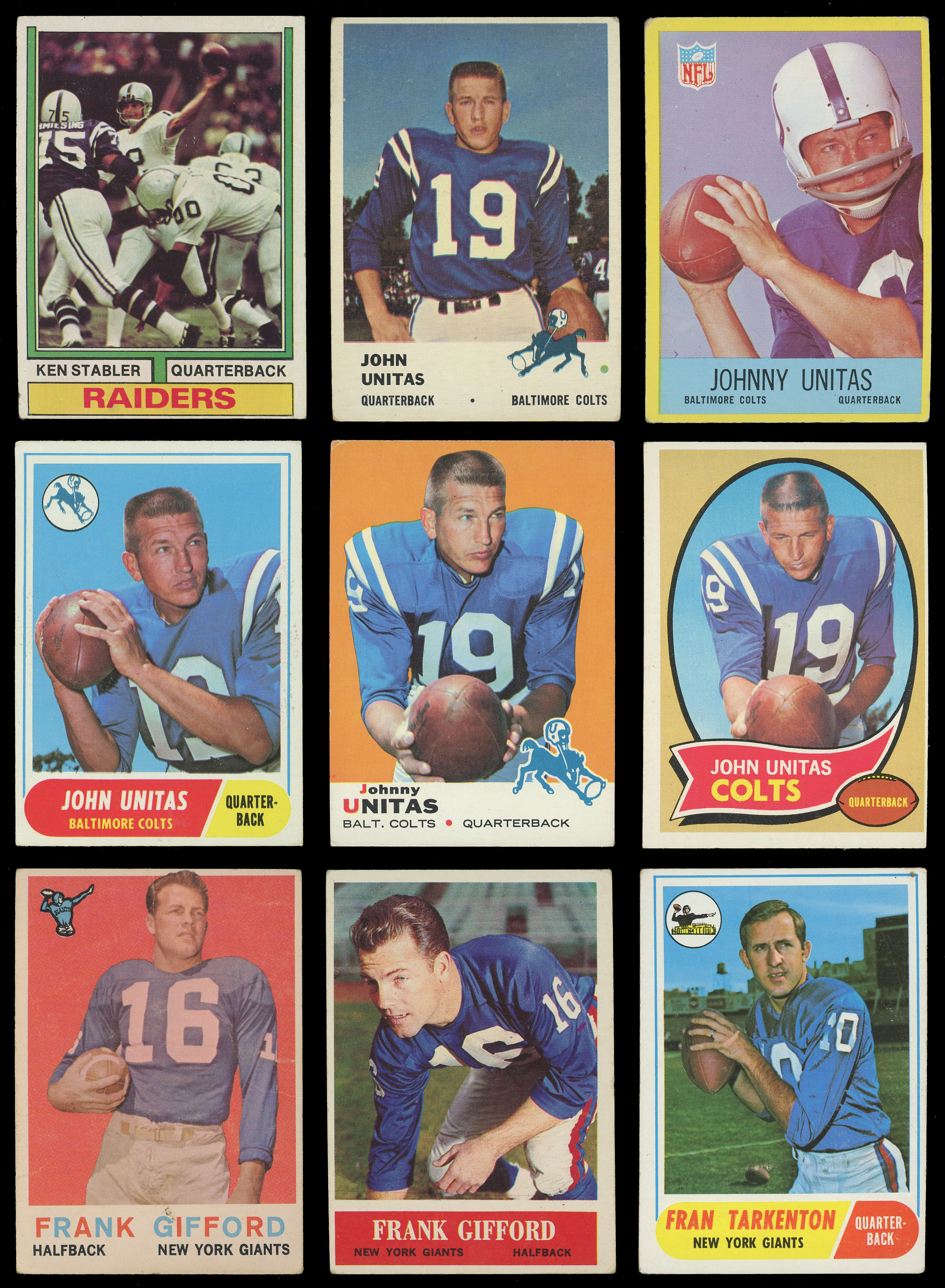 1960 Topps: (3 stars) with #1 Unitas (VG), #51 Starr (EX), #74 Gifford (VG-EX);