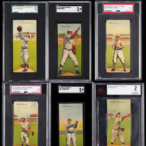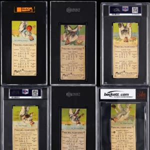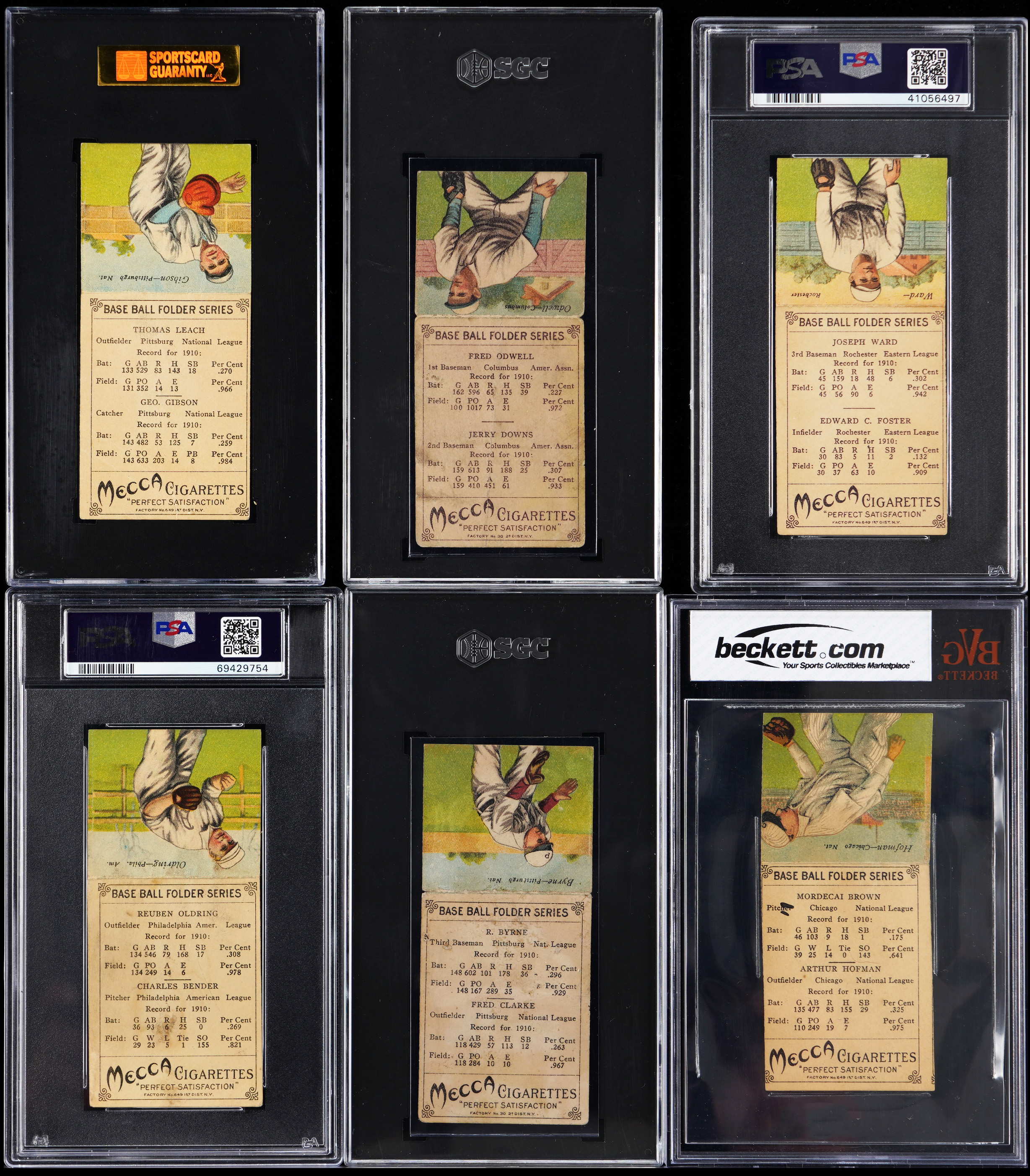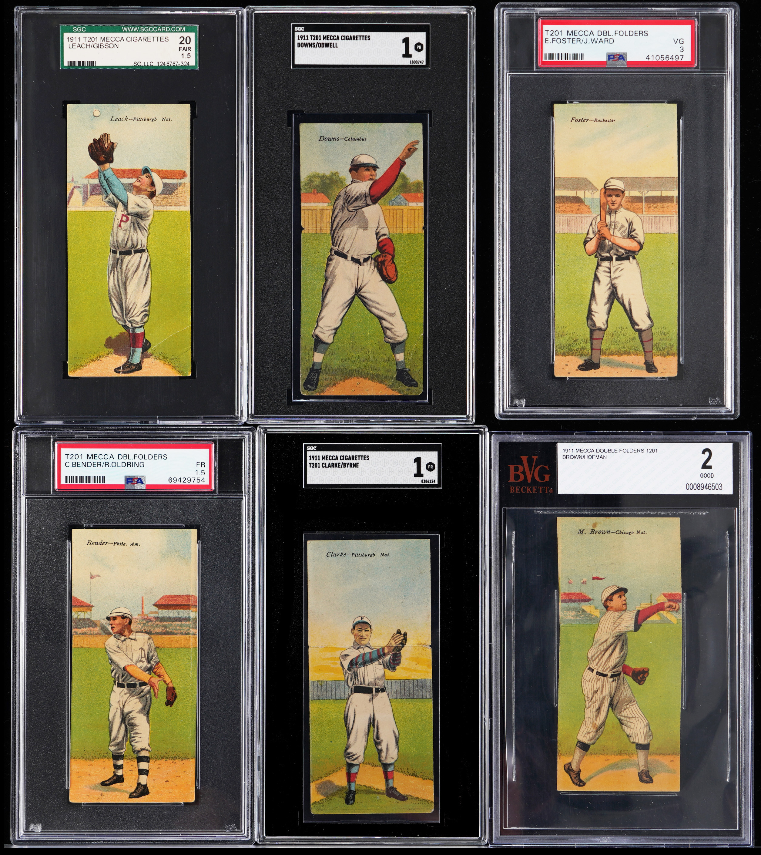 A six-pack of graded 1911 T201 Mecca Double Folders featuring a trio of Hall of Famers. Includes: PSA VG 3: Foster/Ward; BVG GOOD 2: M. Brown/Hofman; PSA FAIR 1.5: Bender/Oldring; SGC FAIR 1.5: Leach/Gibson; SGC POOR 1: (2 cards) with Clarke/Byrne and Downs/Odwell.