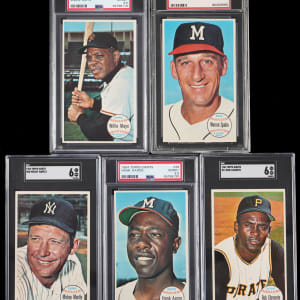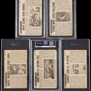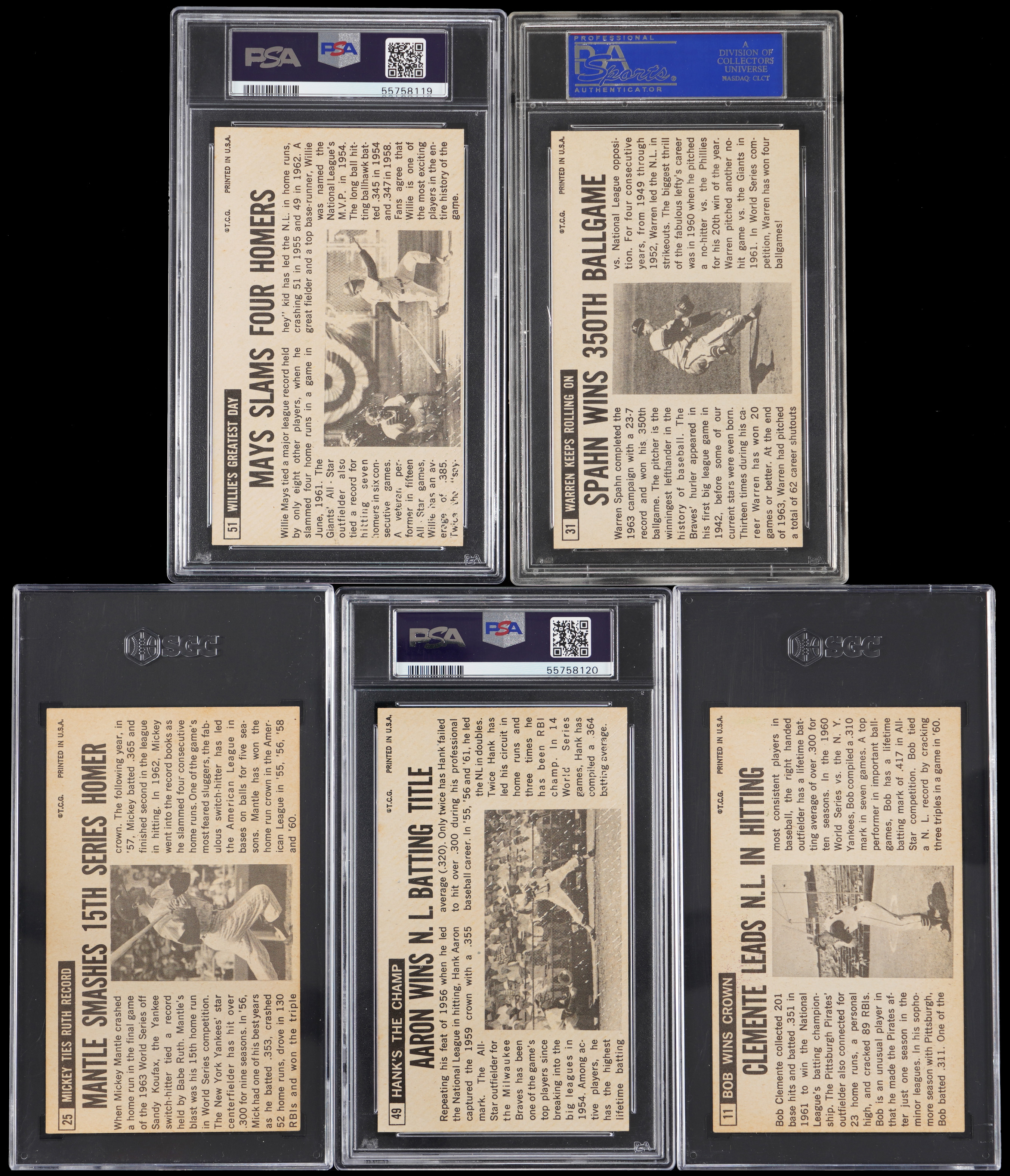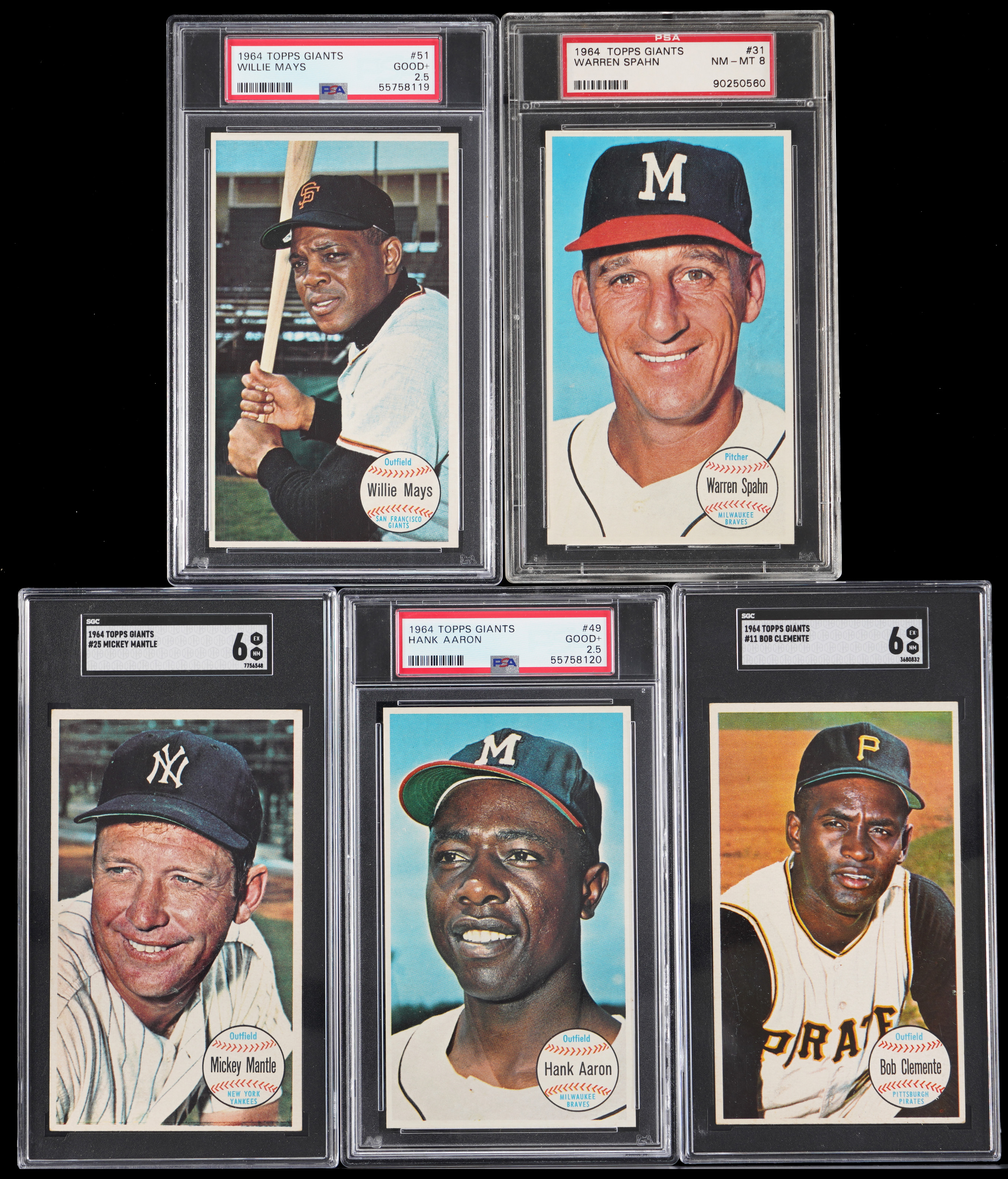 Core group of five 1964 Topps Giants Hall of Fame graded cards. Includes: PSA NM-MT 8: #31 Spahn; SGC EX/NM 6: (2 cards) with #11 Clemente, #25 Mantle; PSA GOOD+ 2.5: (2 cards) with #49 Aaron and #51 Mays.
