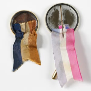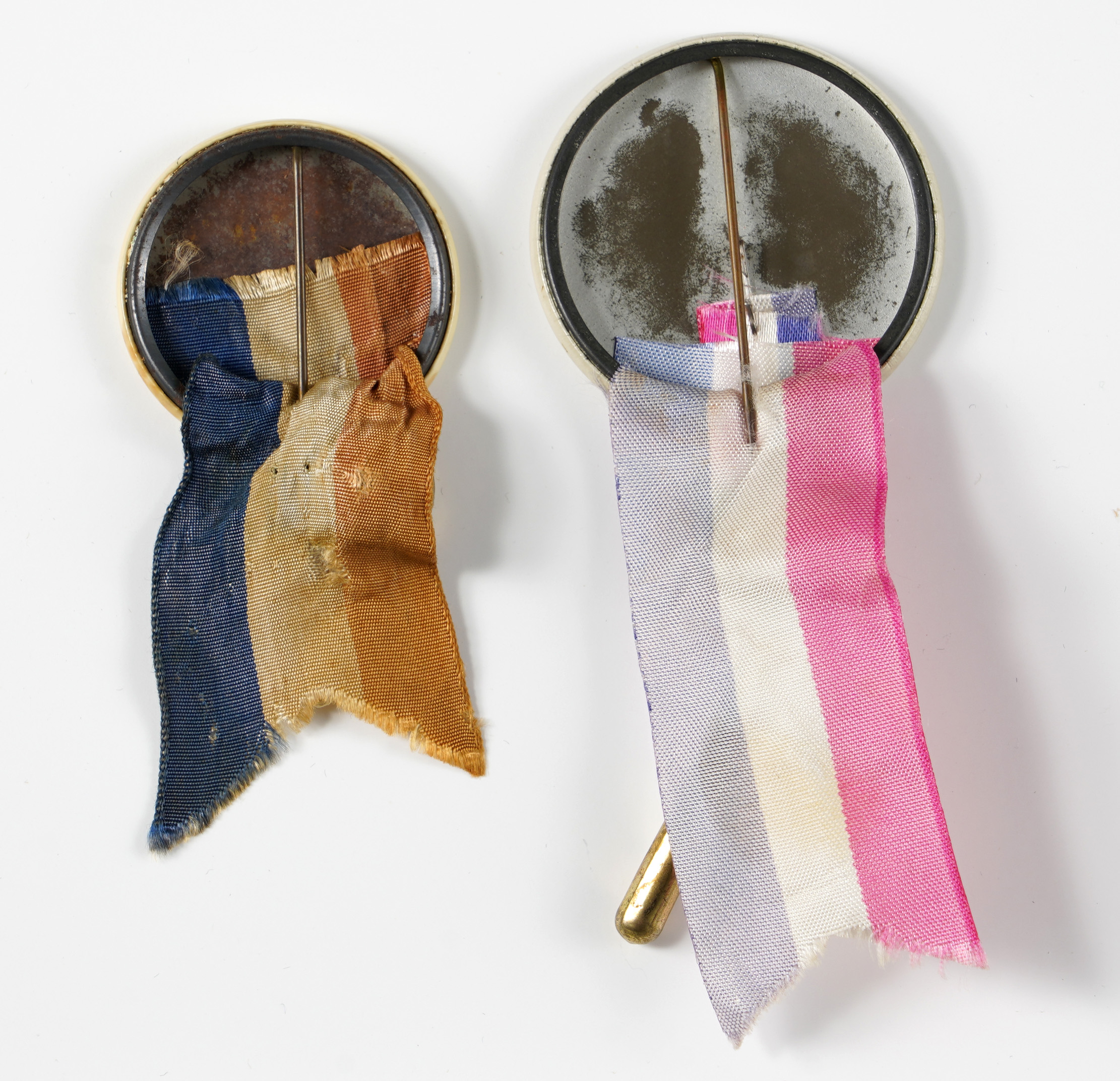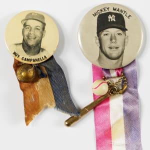 Pin the winning bid to this pair of 1950s PM10 Hall of Famer pins. The subjects are all-time greats Mickey Mantle and Roy Campanella, who were both active at the time of issue. Attached with a somewhat faded red, white and blue ribbon, and plastic bat and baseball charms, the Mantle pin is EX, with a slight indentation above the letter "a" of his surname. The Campanella pin rates as VG-EX due to minute surface cracks of an unobtrusive nature. The attached ribbon shows considerable signs of age/wear, while the gold metal baseball charm displays a good deal of integrity.