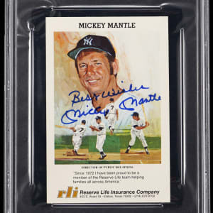 Charismatic New York Yankees Hall of Famer Mickey Mantle was a natural for endorsements, and he leant his approval to an unimaginable number of products and services. Mantle proved his worth as an advertising pitchman, rising to the challenge of making a mundane life insurance company sound good. Served up is proof of his high wattage appeal, in the form of this signed circa 1980s Reserve Life Insurance Company promotional card. Mantle is depicted flashing a big smile on the obverse of this 4" x 6" card, which lists his career summary and stats on the reverse. Mantle has signed resolutely on the obverse with a "Best Wishes" greeting, by means of a blue felt-tip pen.