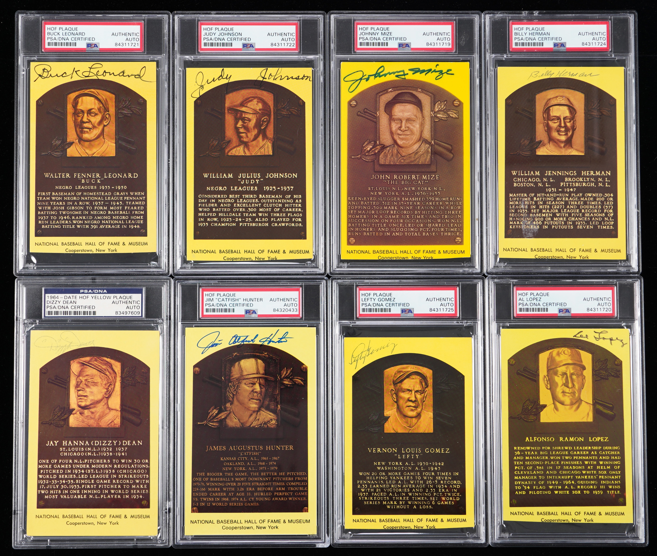 Yellow Hall of Fame plaque postcards (12), all in individual PSA/DNA holders with Authentic Autograph designations: "Dizzy" Dean (d.1974), Jim "Catfish" Hunter, "Lefty" Gomez, Al Lopez, "Buck" Leonard, "Judy" Johnson, Johnny Mize, Billy Herman, Monte Irvin, Joe Sewell, "Happy" Chandler, "Jocko" Conlan;