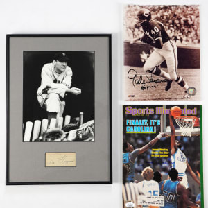 Pie Traynor 3-inch cut signature framed in 15 x 10 ½ display along with a 7x9 inch black and white photo of the Hall of Famer. The (“7-8”) strength signature comes with Full LOA from PSA/DNA.
