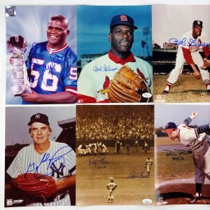 Signed color 8x10 NR-MT photos (8) with Auction LOA from James Spence/JSA: Robin Roberts “HOF 76,” Billy Williams, Gaylord Perry, Orlando Cepeda (HOF Induction photo), Bob Gibson, Frank Robinson, Gale Sayers “HOF 77.”, Lawrence Taylor