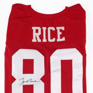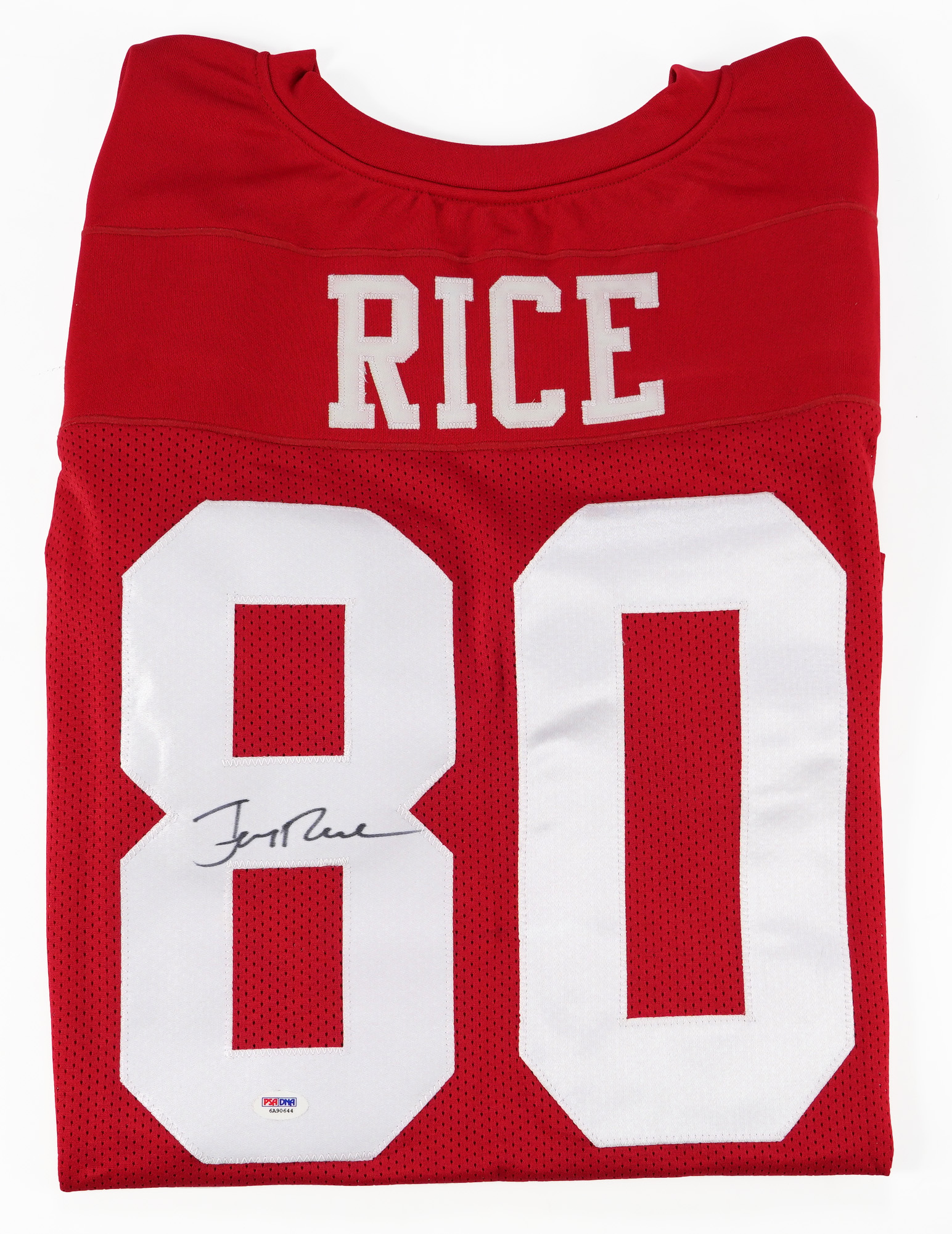 Jerry Rice signed XL replica jersey with “Rice 80” and signature on the “8” grading (“8-9”). Comes with Sticker and COA from PSA/DNA.