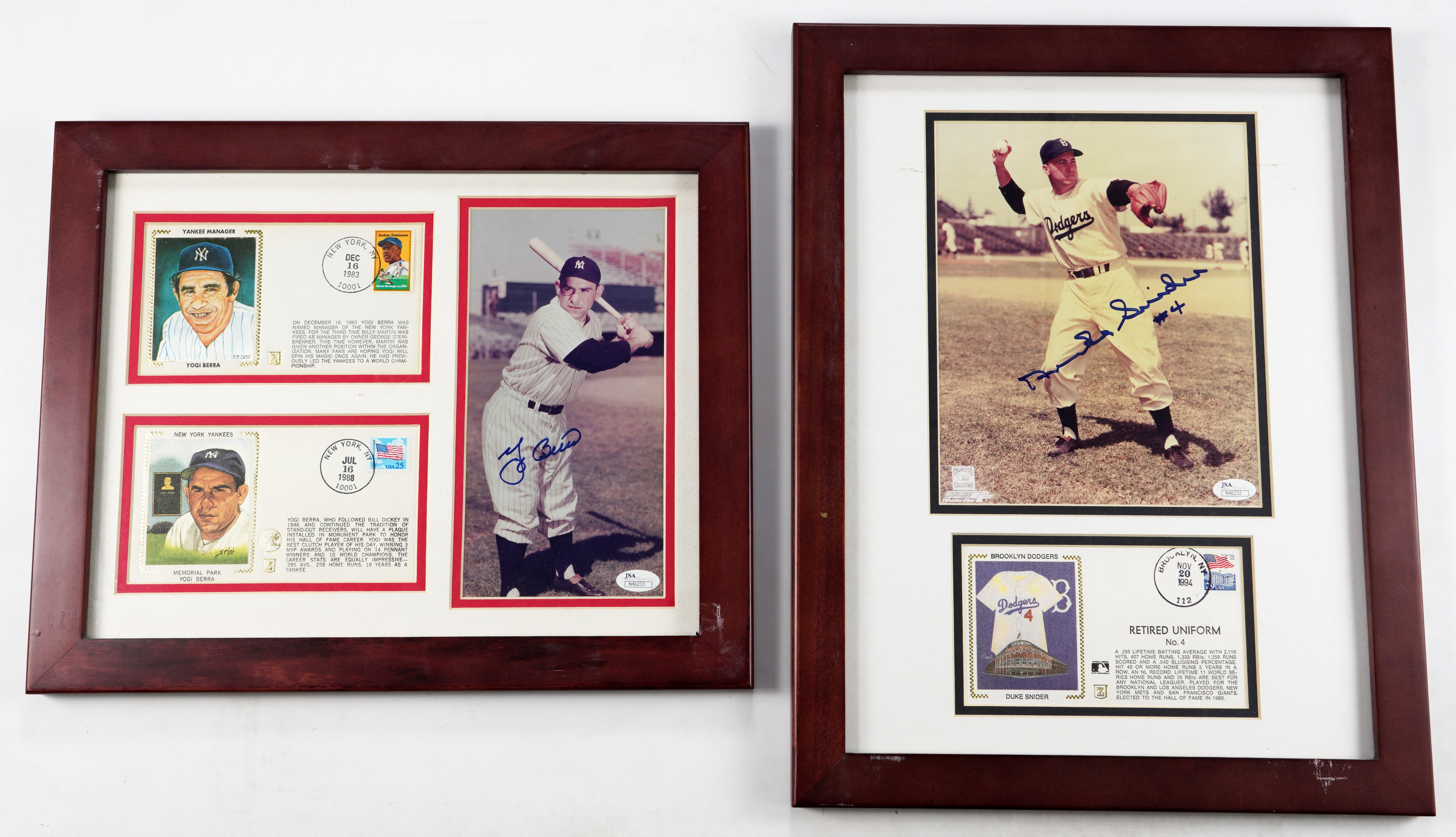 Duke Snider “4” signed (“8-9”) 8x10 photo in 14x18 display framed with Duke Snider “Retired Uniform” First Day Cover dated November 20, 1994. Sticker and Basic Cert. from James Spence/JSA.