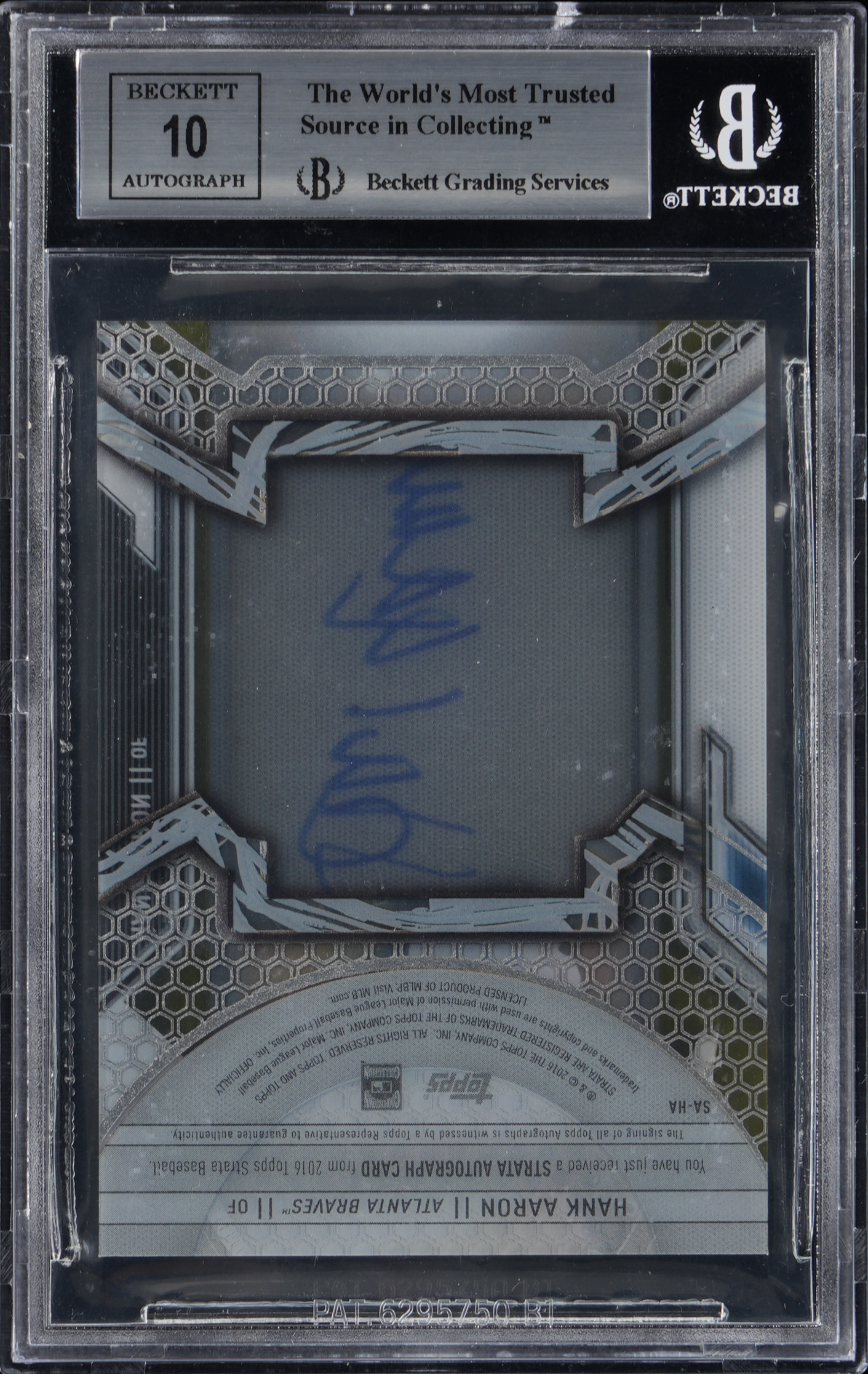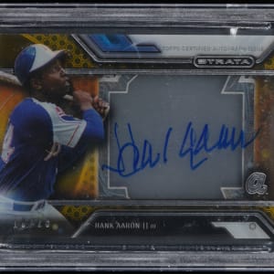 Graded MINT 9 by BGS with a "10" Autograph grade. Serially numbered #19/25. Home run champ Hank Aaron placed his royal signature on the offered 2016 Topps Strata modern insert. This Autographs gold parallel of the Atlanta Braves Hall of Famer is penned "on-card" and has earned the following sub-grades: Centering: 9.5; Corners: 9; Edges: 9 and Surface: 8.5.