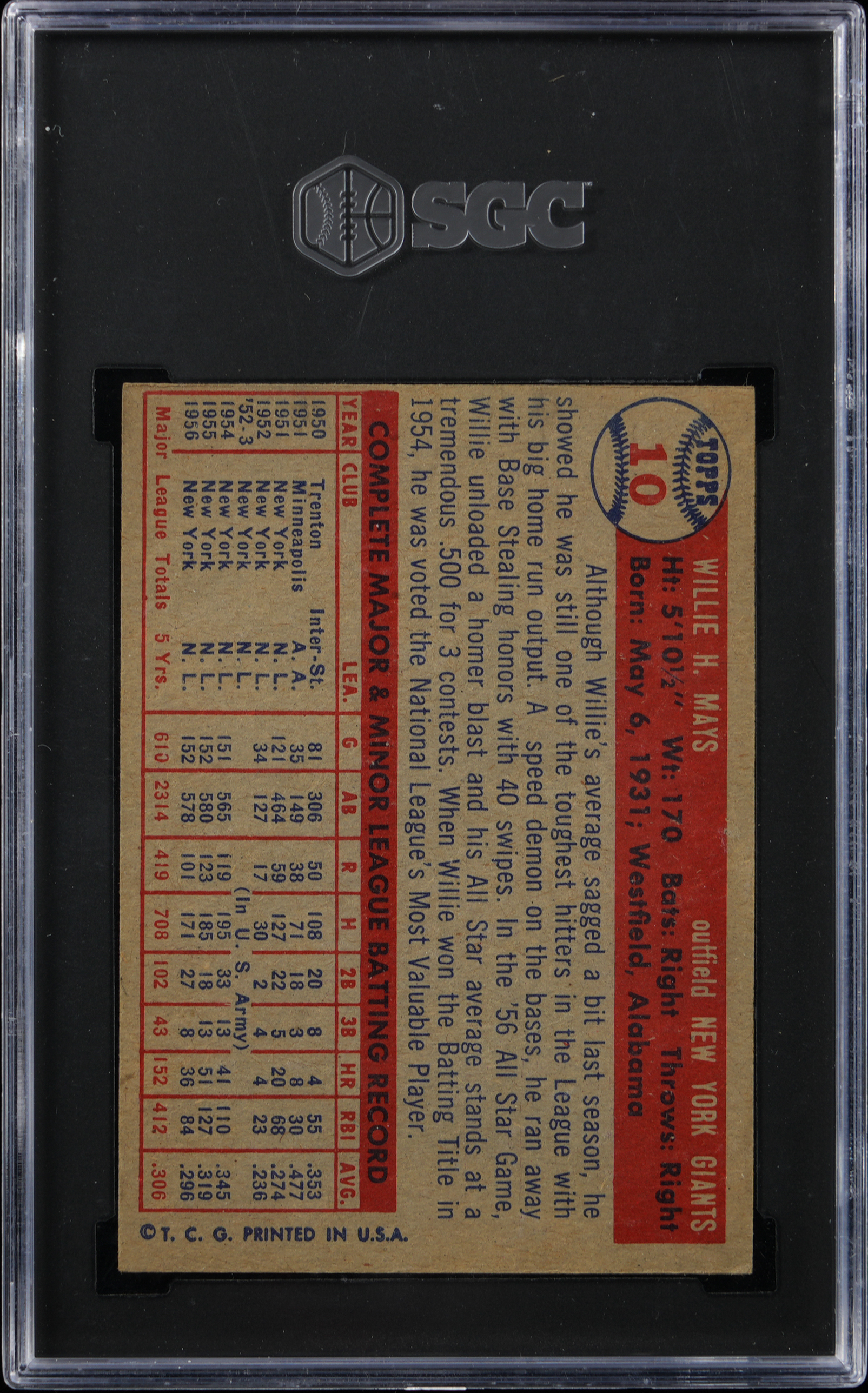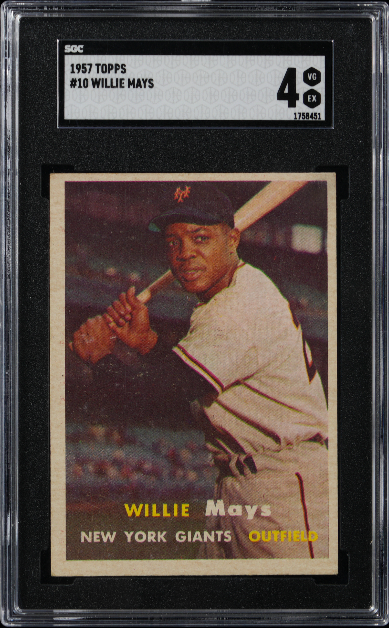 Graded VG/EX 4 by SGC. Willie Mays' New York Giants finale is captured on the offered 1957 Topps #10 gum card.
