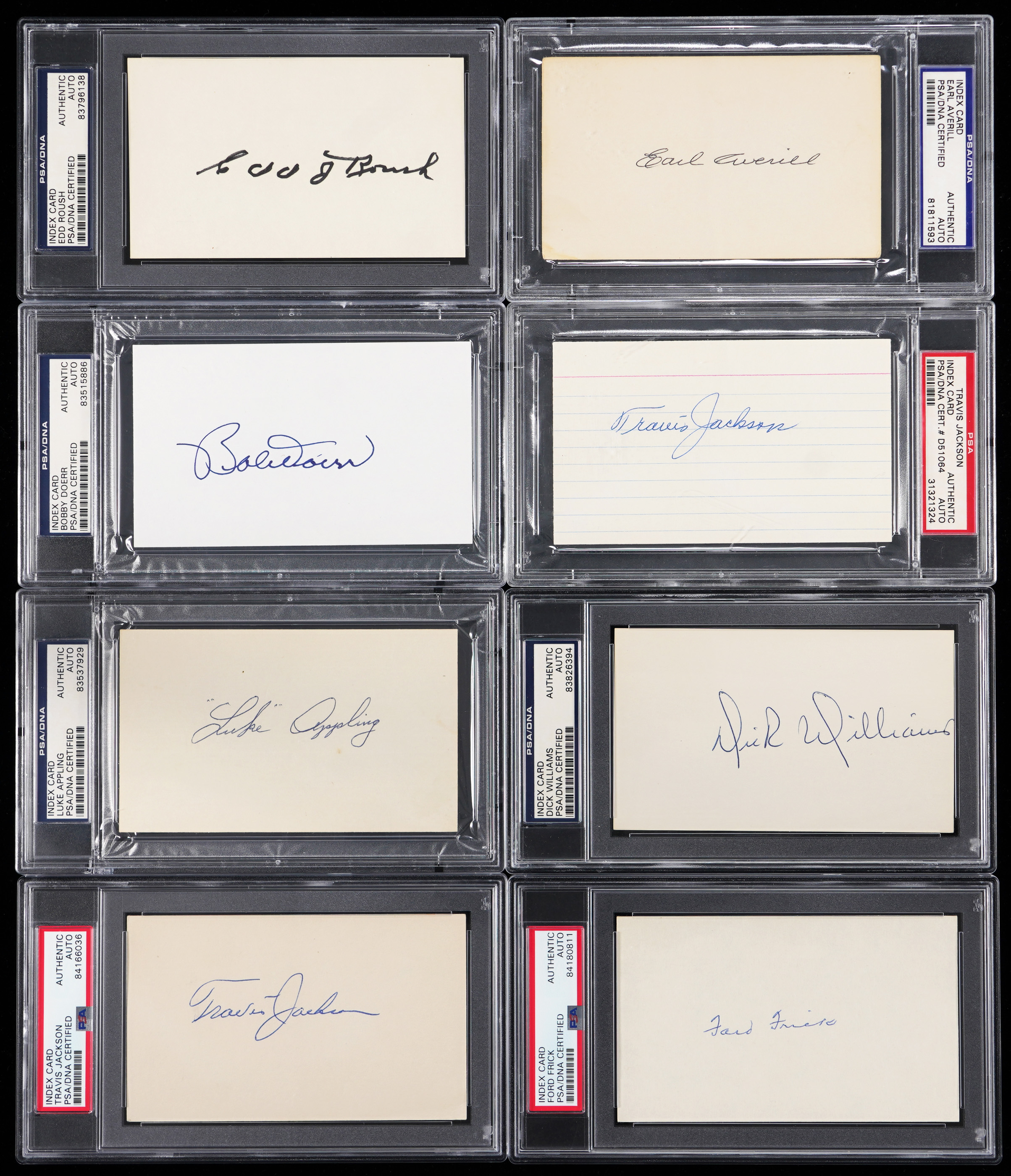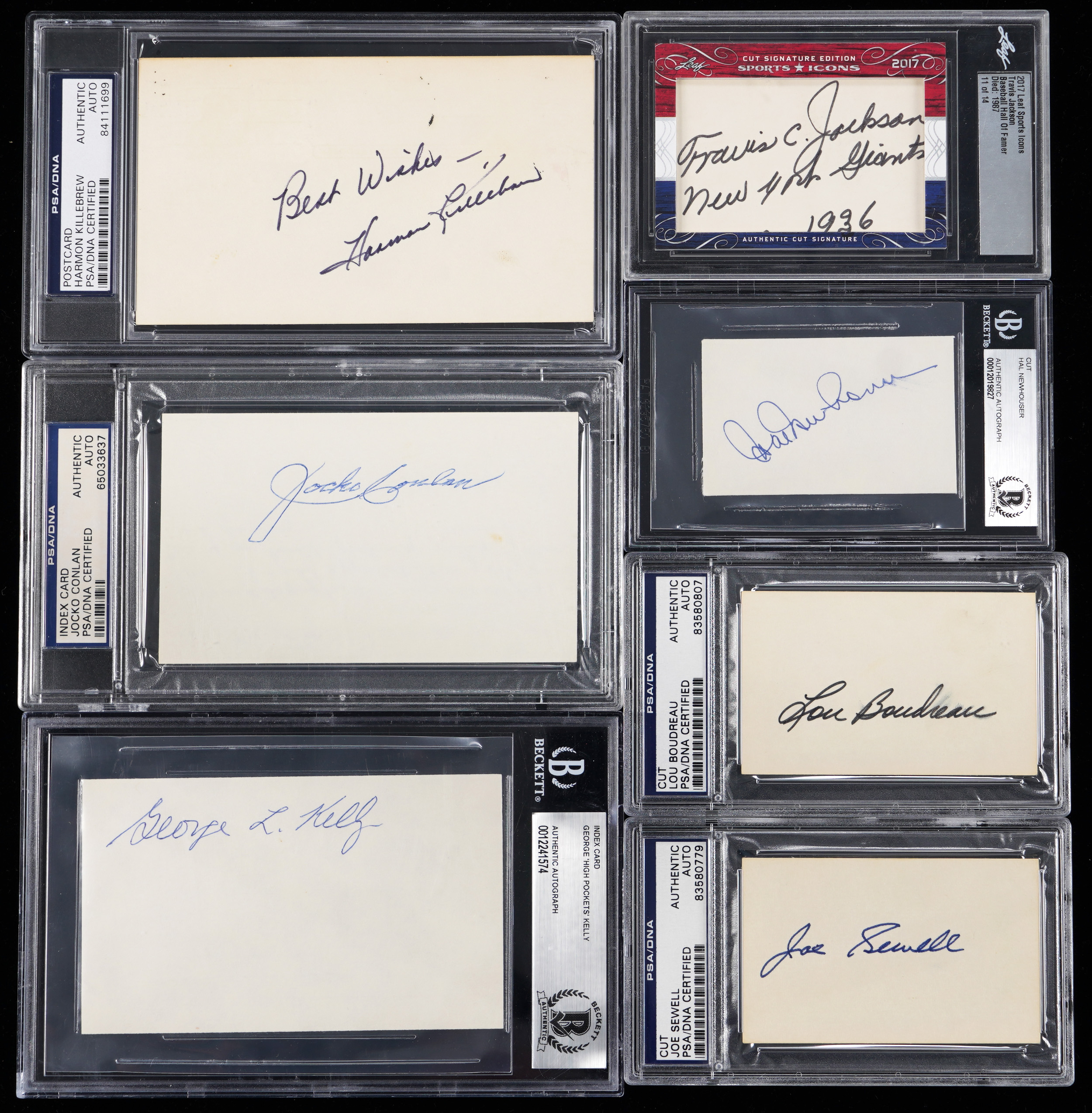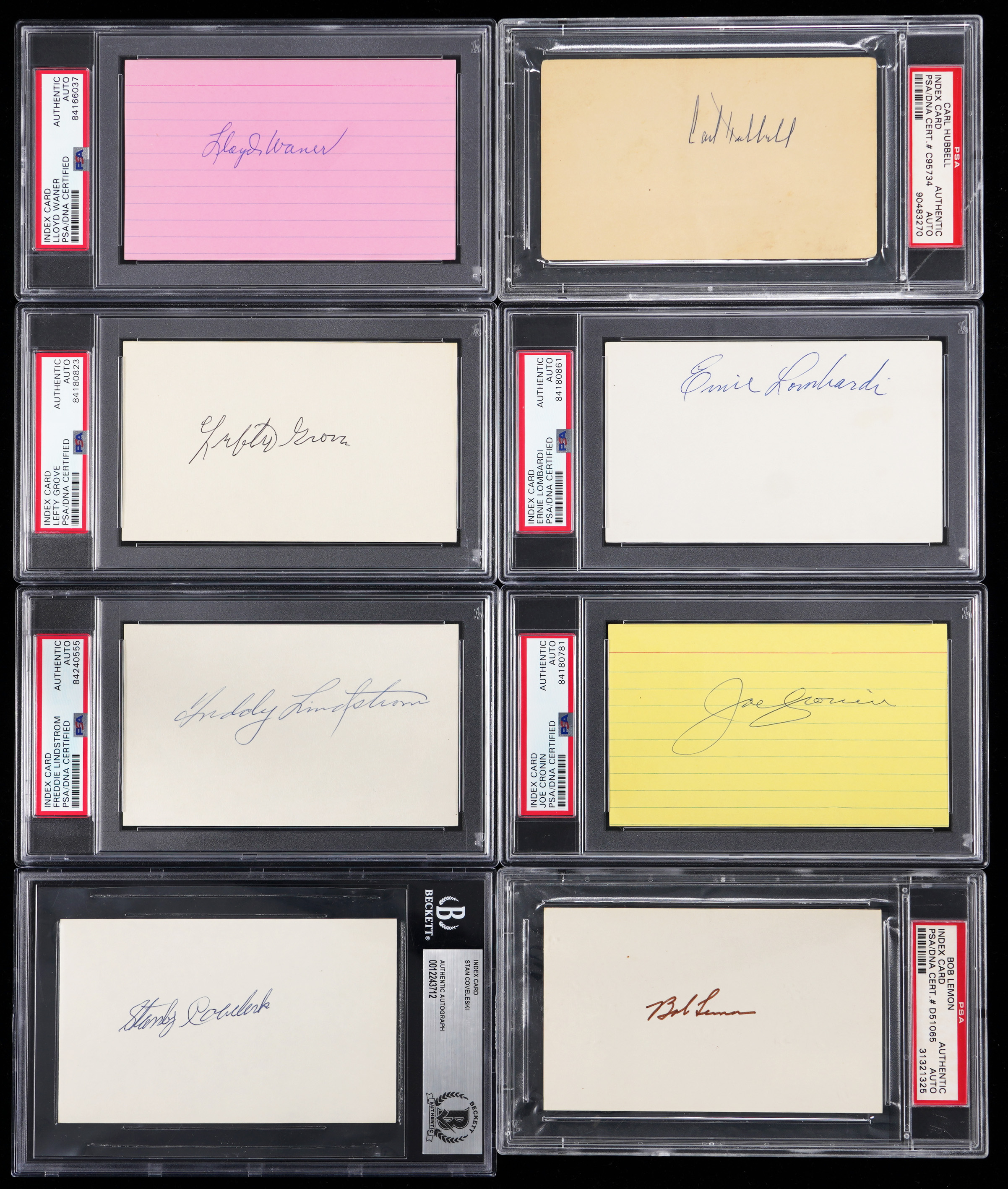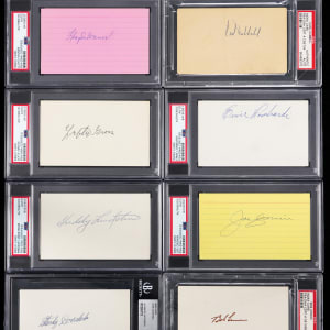Hall of Famers (23) have each signed one of these index cards (18) and cuts (4), plus (1) postcard. All have been encapsulated and found authentic by grading services. The items are Excellent or better and the signatures average (“8-9”).
