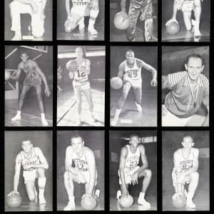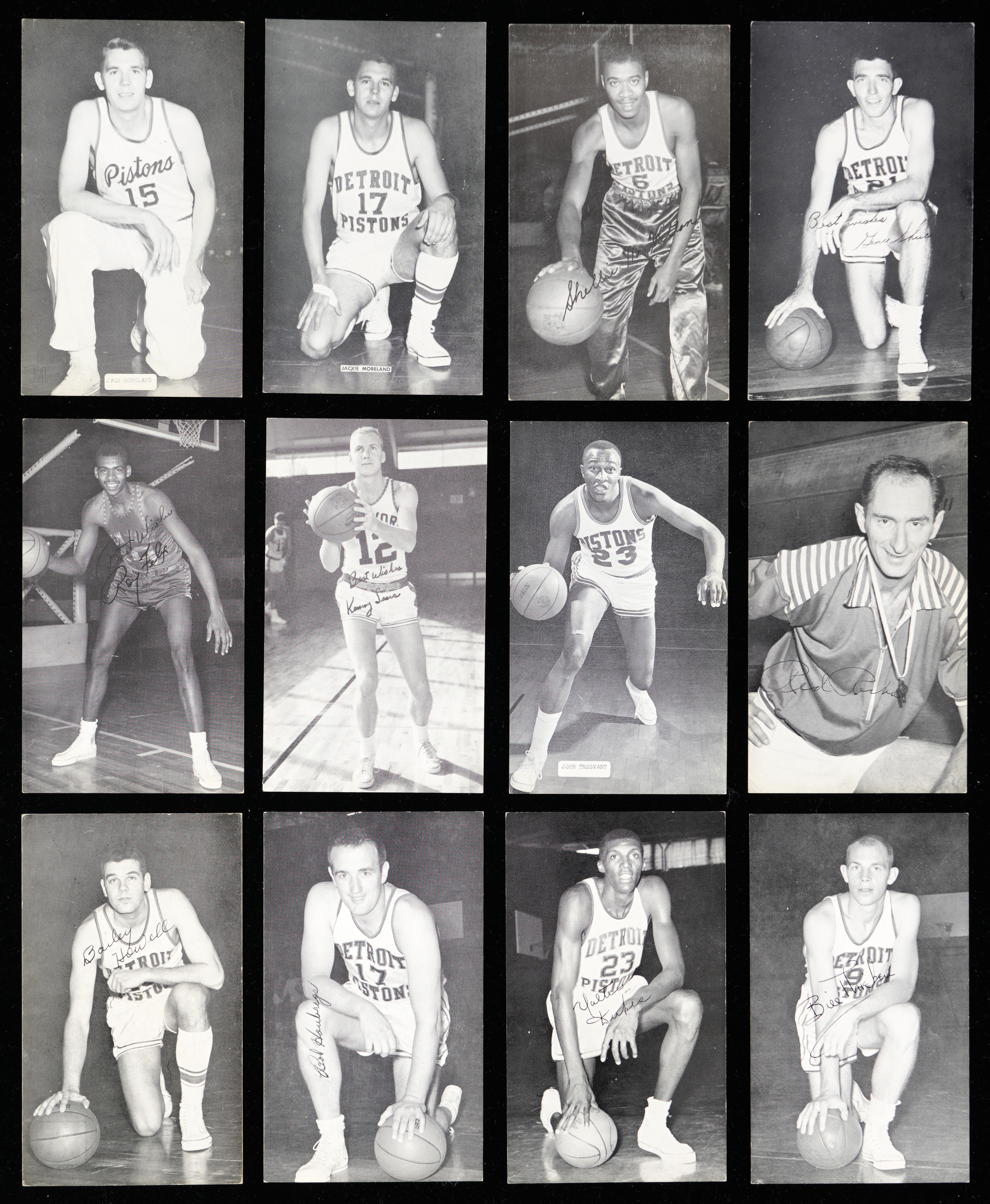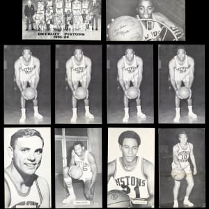 Other Detroit Pistons: (59 postcards) with Butcher, (4) Cable, (2) Dees, Dischinger, Dove, (6) Dukes, (3) Farley, Fox, (5) Holup, (3) Houbregs, (4) Jordon, (4) Lloyd, (4) McMillion, Miles, (4) Moreland (two different poses), Niemann, (3) Noble, Rocha, (4) Shue, Strawder, (4) Thielsen, Tresvant;