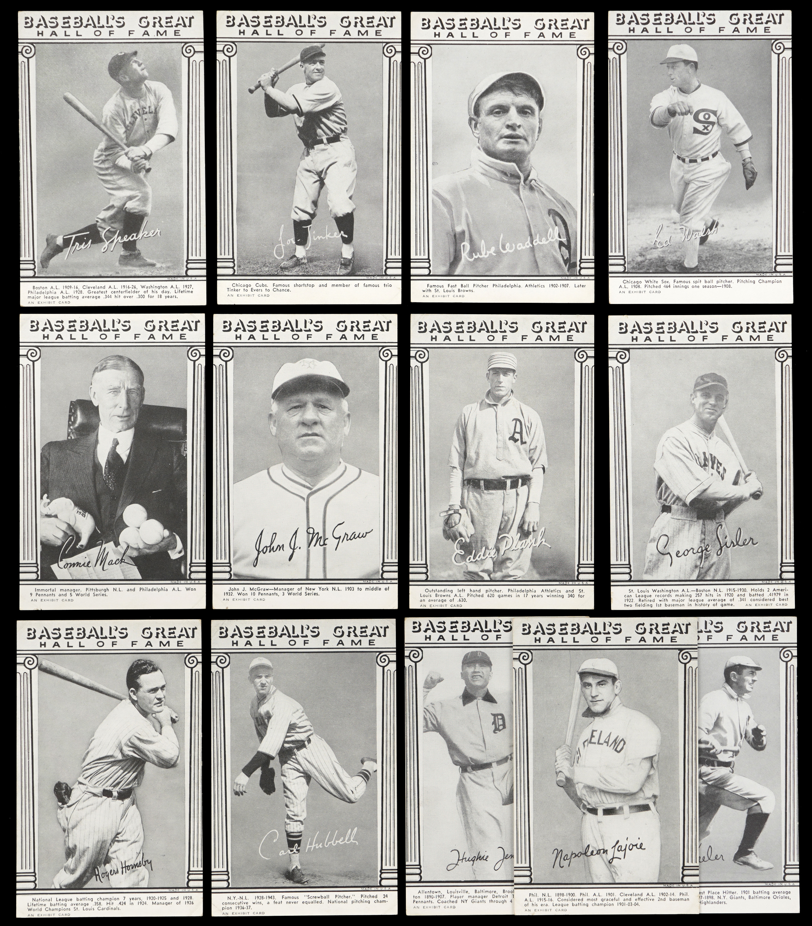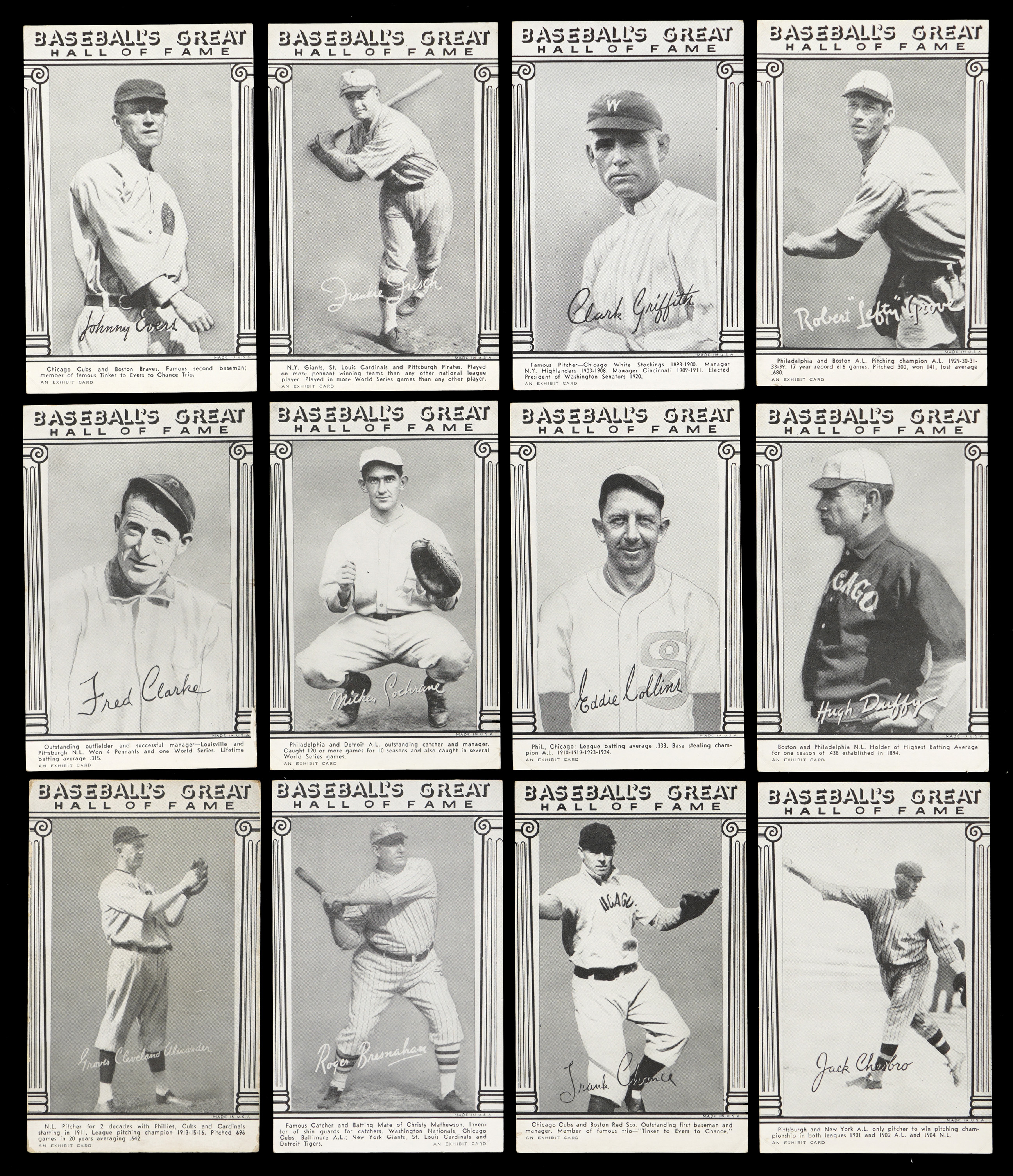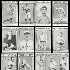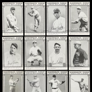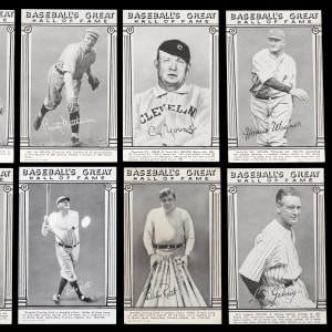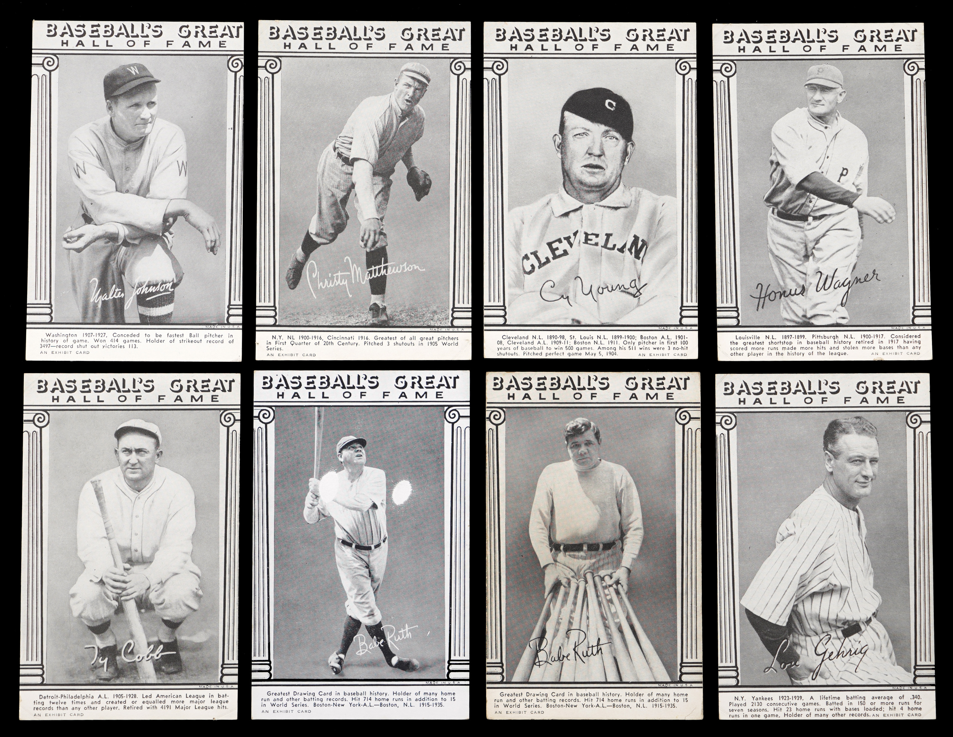 Those legends who found their way into Cooperstown by 1948 are celebrated on the offered Baseball’s Great Hall of Fame Exhibits set of (33) cards. This mid-grade edition averages (VG to VG-EX) condition with album mounting indentations found on most corners. Keys include: Cobb (VG), Gehrig (VG), W. Johnson (VG-EX), Mathewson (VG), Ruth (VG-EX, print marks, Batting), Ruth (GD, Standing with Bats), Wagner (VG) and C. Young (VG).