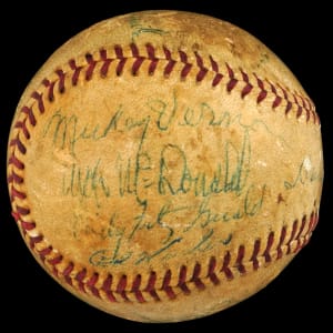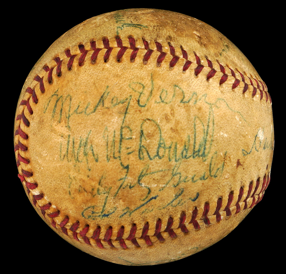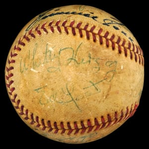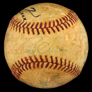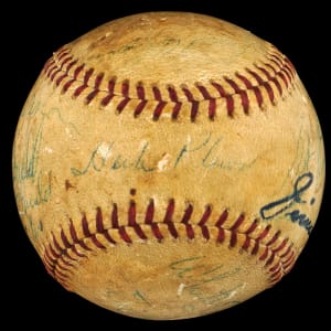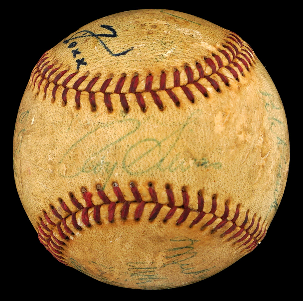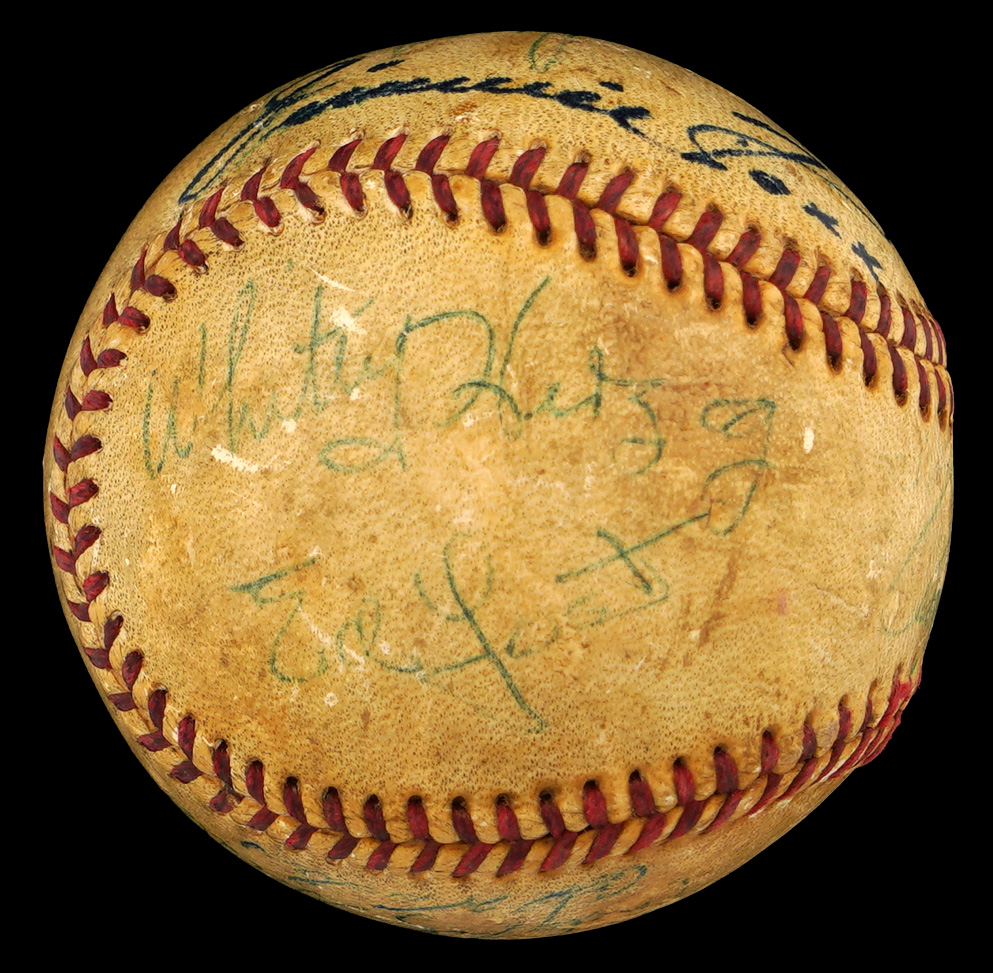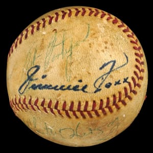 "Double X" marks the spot for a great collecting treasure, with this Jimmie Foxx signed baseball. Though the factory labeling is no longer discernible, there are several clubhouse signatures on this ball, including Mickey Vernon and Roy Sievers, suggesting the considerably toned ball dates to circa 1954-1955, when their careers overlapped with the Washington Senators. Foxx (d.1967) has provided the only genuine signature on this baseball, a bold and prominent signature on the north panel, that makes the clubhouse signatures pale in comparison. Elected to the Hall of Fame in 1951, Foxx ranks high up on the list of all-time greatest sluggers.