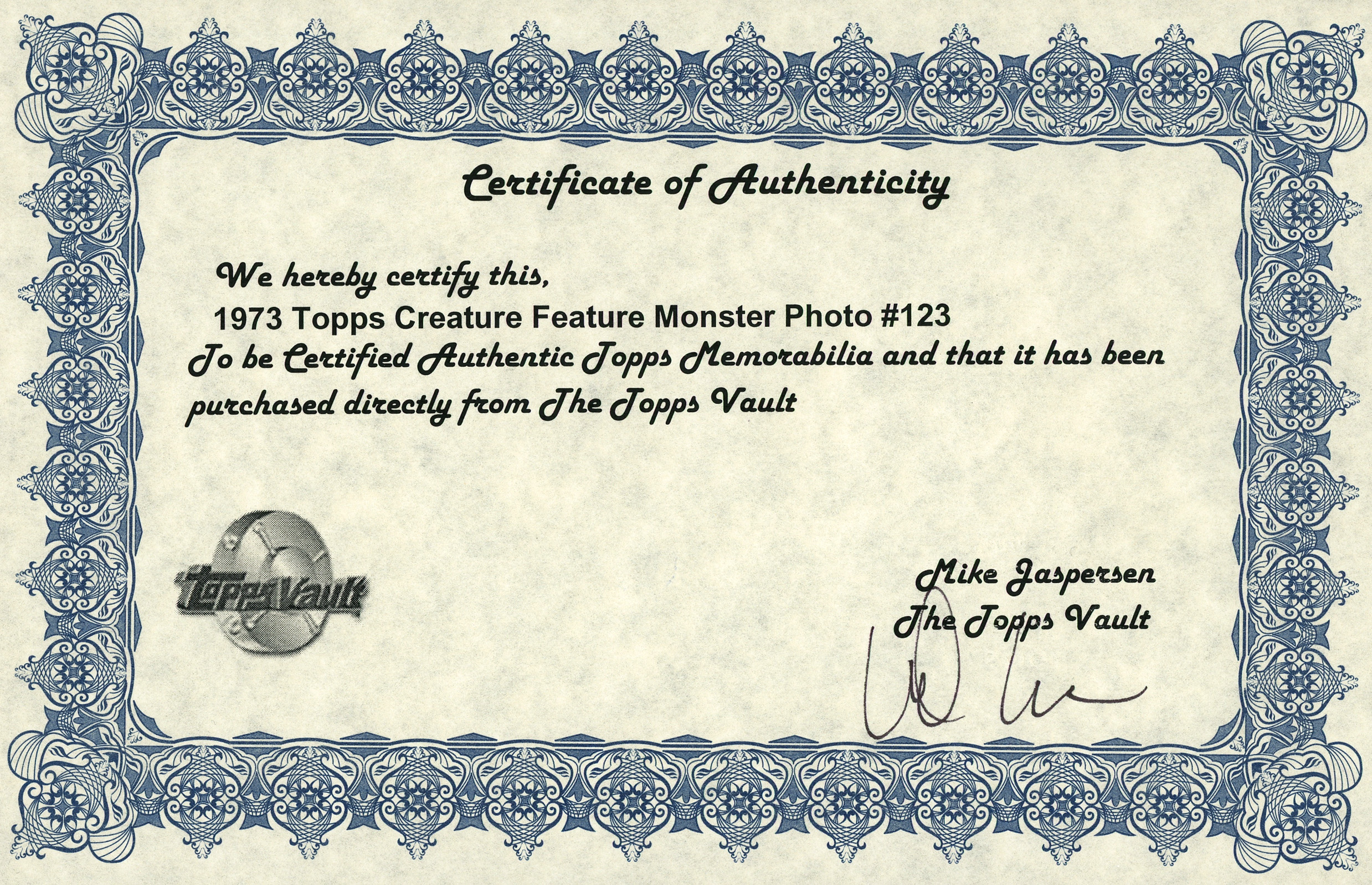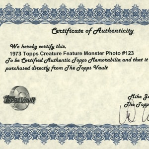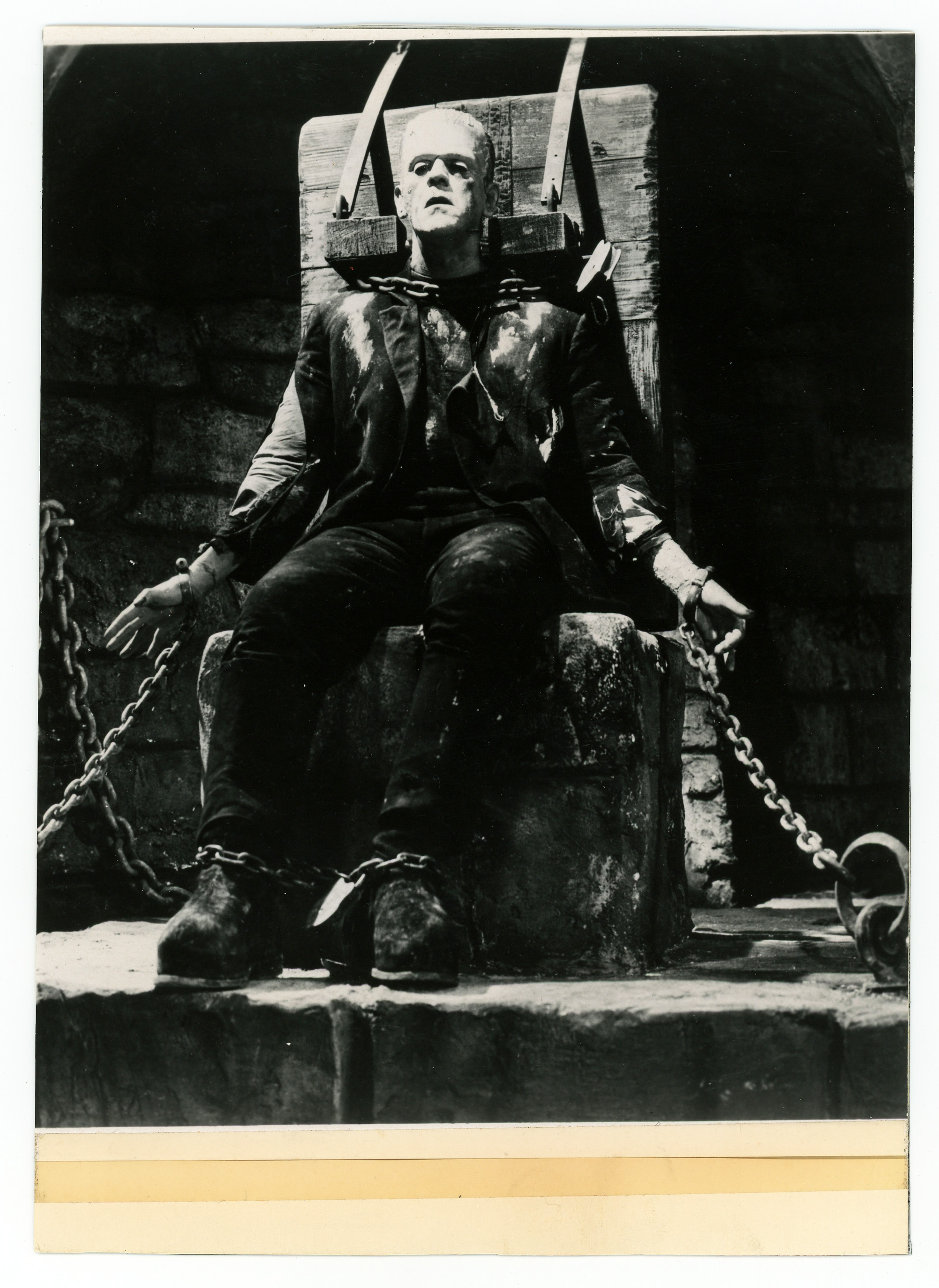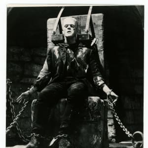 Outstanding original production photograph used to create card #123 of Frankenstein from the 1973 "Creature Feature/You'll Die Laughing" series issued by Topps. The glossy photograph, which measures 6.25 x 8.75 inches, features Frankenstein chained to a chair. It is an ideal depiction of the legendary monster, who is integral to this series appearing in multiple cards and on display boxes. The black-and-white image would be used to create the final issue card and features production notations on the reverse. It originates from the Topps Vault and is accompanied by a certificate of authenticity to that effect. Excellent condition overall.