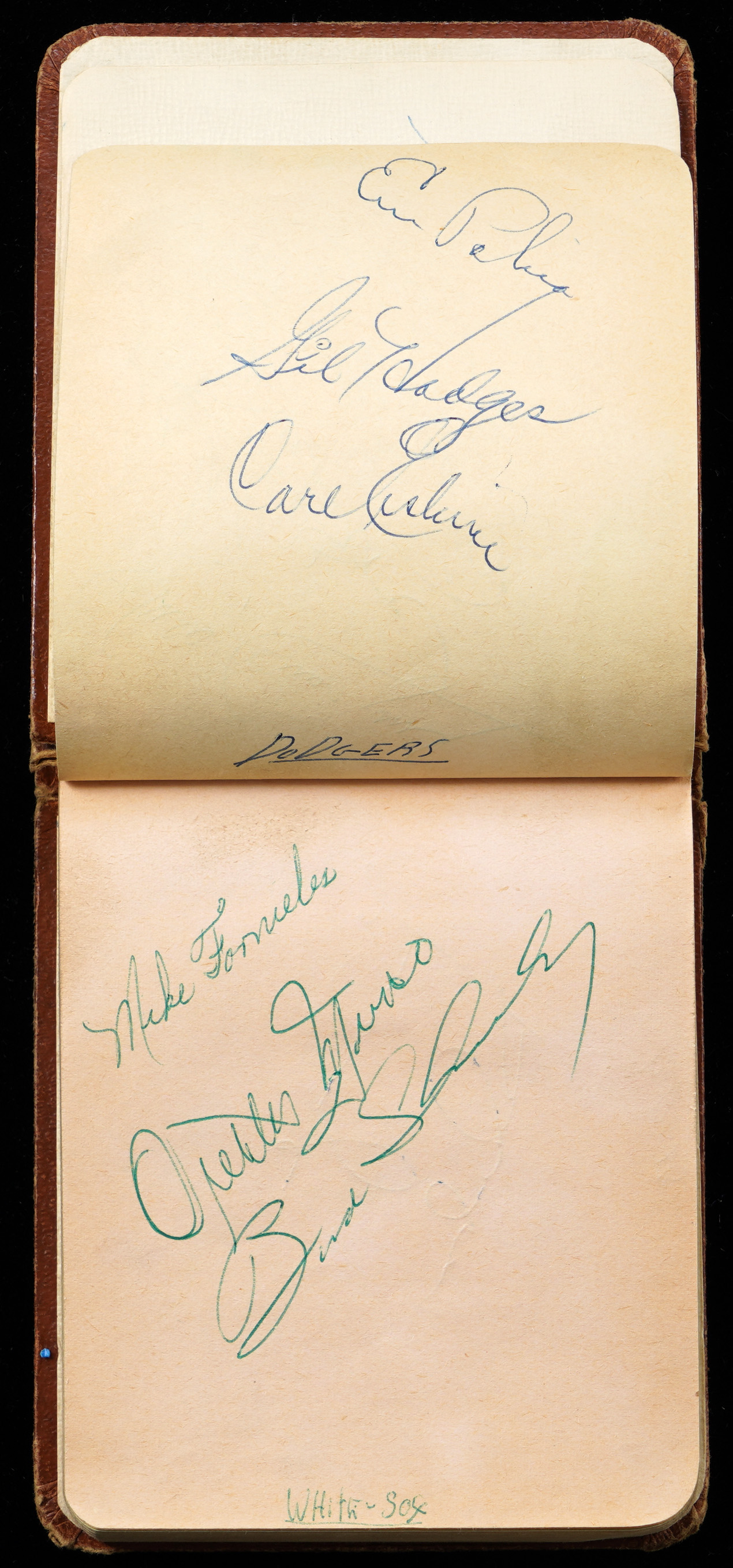 A tremendous lineup of (180+) Hall of Famer and star signatures is had, with this circa 1953 autograph album. Kudos to the determined fan who assembled this fine collection more than seventy years ago, as there's plenty of big names in the mix. The signatures are of generally better quality, and the album remains intact, which a great look of period authenticity. The great majority of the subjects, if not all, are deceased, and a good number are considered tough acquisitions. Though this collection is comprised with mostly different signatures, some duplication is noted.