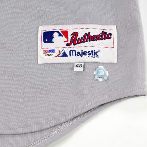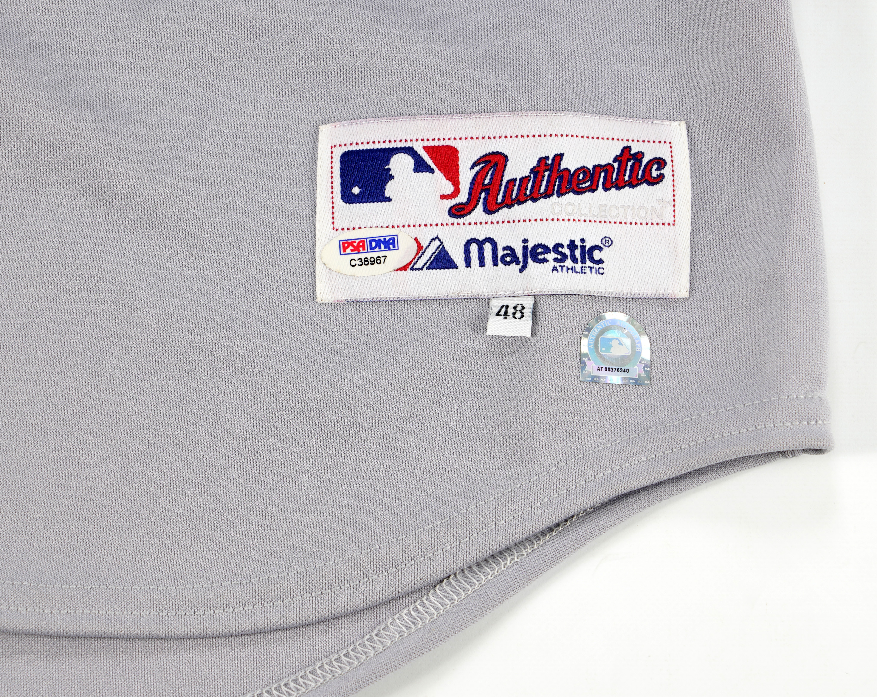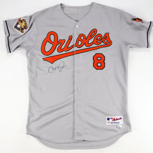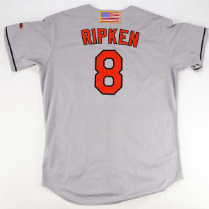 This size 48 MLB Authentic Majestic Baltimore Orioles Road grey jersey has “Ripken 8” on the back with American flag patch at the neck. The left shoulder has the "Oriole" patch. The right shoulder has “100 Seasons - American League – 1901-2001” Centennial patch, and the front of the jersey has “Orioles 8” with a large Cal Ripken Jr. signature (“8-9”). It has an MLB Hologram with a number too old to be on file. The PSA/DNA sticker on the tag is for autograph authentication.