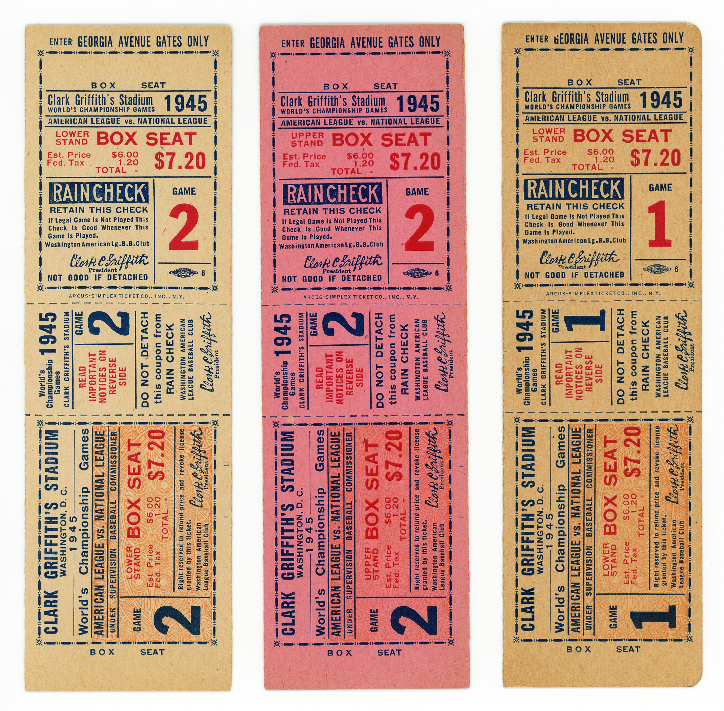 The 1945 Washington Senators were eliminated from the pennant race on the last day of the season, and the Detroit Tigers went to the World Series. That's how these (3) full unused tickets became phantoms. The three tickets for Game One (1) and Game Two (2) at Clark Griffith Stadium, Washington, DC are in EX to EX-MT condition with a $7.20 ticket price.
