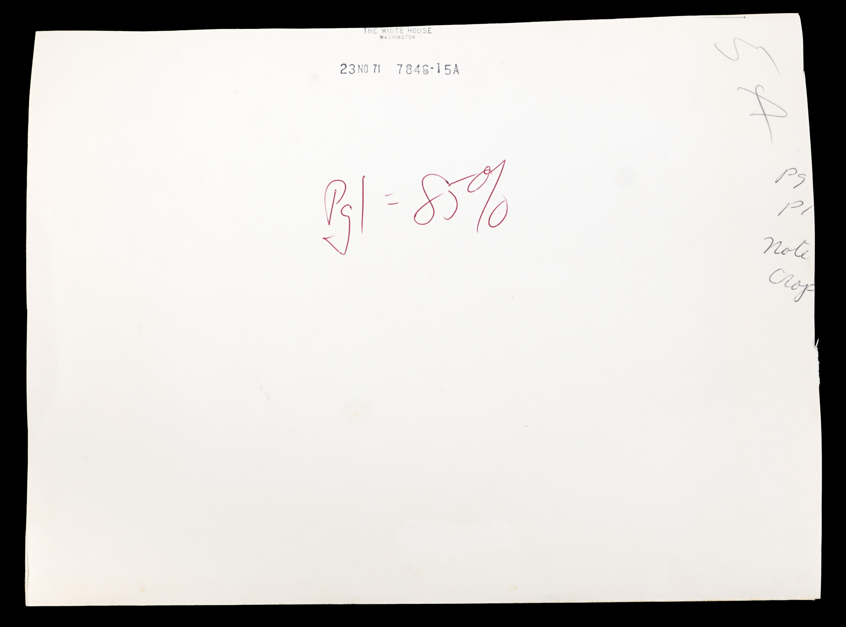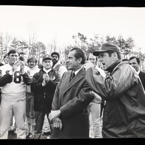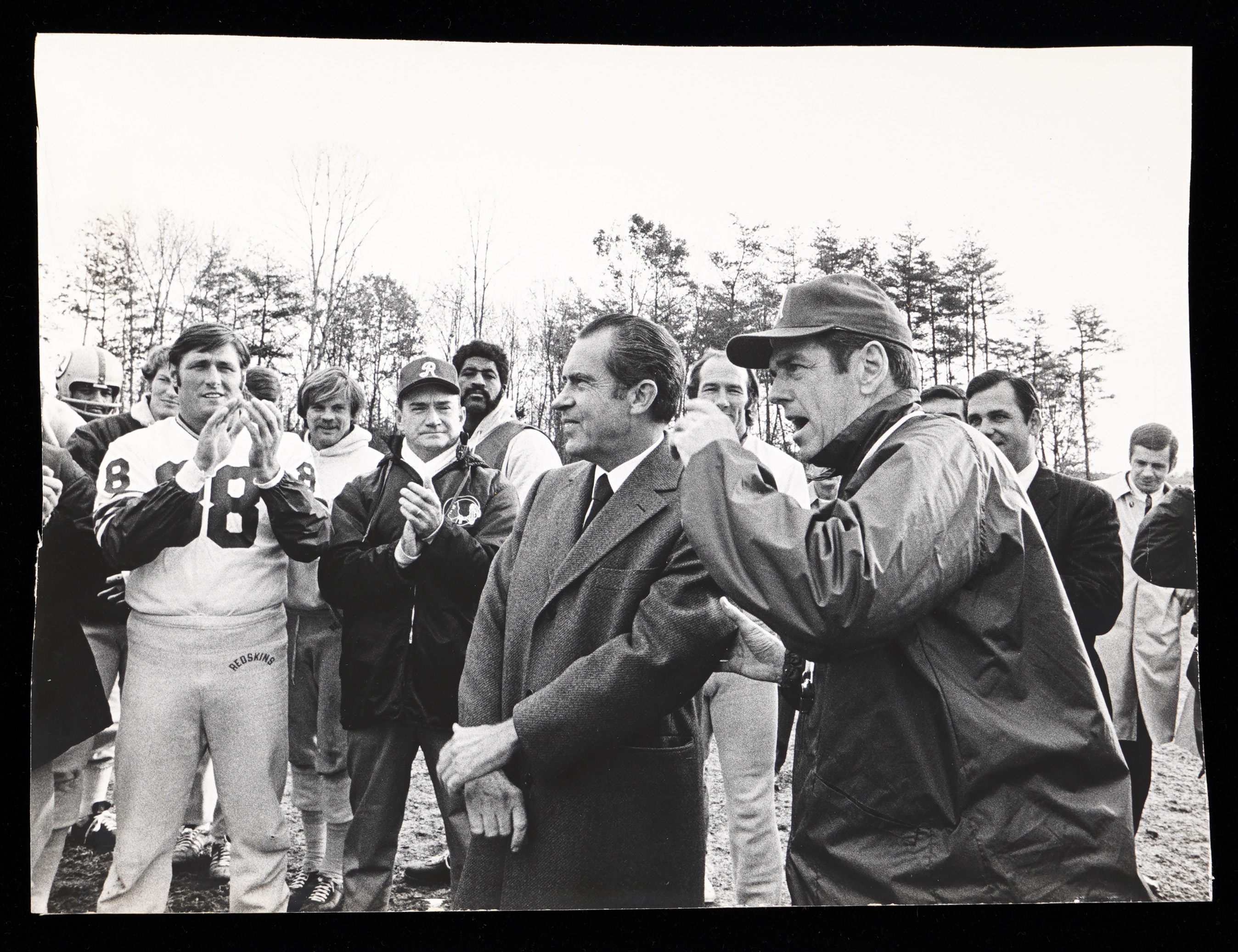 Football-Fan-in-Chief Richard Nixon comes into focus with this 1971 Washington Redskins photograph. Sized at 12" x 9", this borderless photograph is stamped on the reverse with a White House credit, and the date "11 NO 23". Written notations on the reverse suggest this shot was used for publication. The setting was a Redskins practice as they were prepping for a visit to newly opened Veterans Stadium, for a game against the Philadelphia Eagles on 11/28. Seen with Nixon are head coach George Allen and quarterback Billy Kilmer, who were both in their first season with Washington. The Redskins hadn't made it to the postseason since 1945, and perhaps Nixon was good luck, as they finished their 1971 campaign with a record of 9-4-1, good for a Wild Card Playoff berth. More likely it was Allen's capable direction. A few light creases are noted near the left and right edges, but otherwise this vintage photograph remains clean and sturdy, with nice gloss and abundant display appeal.