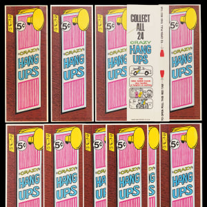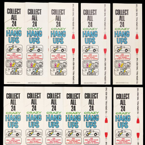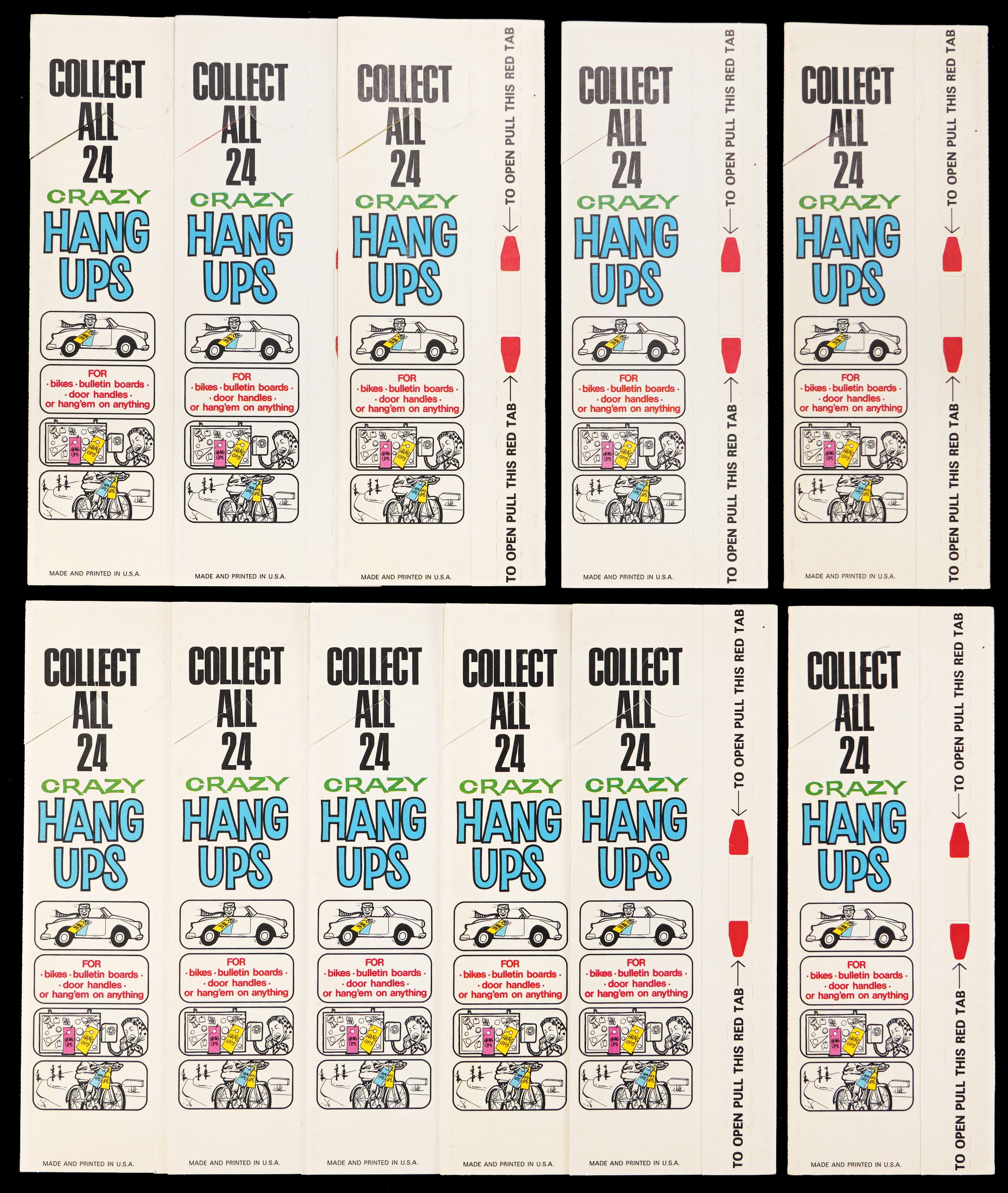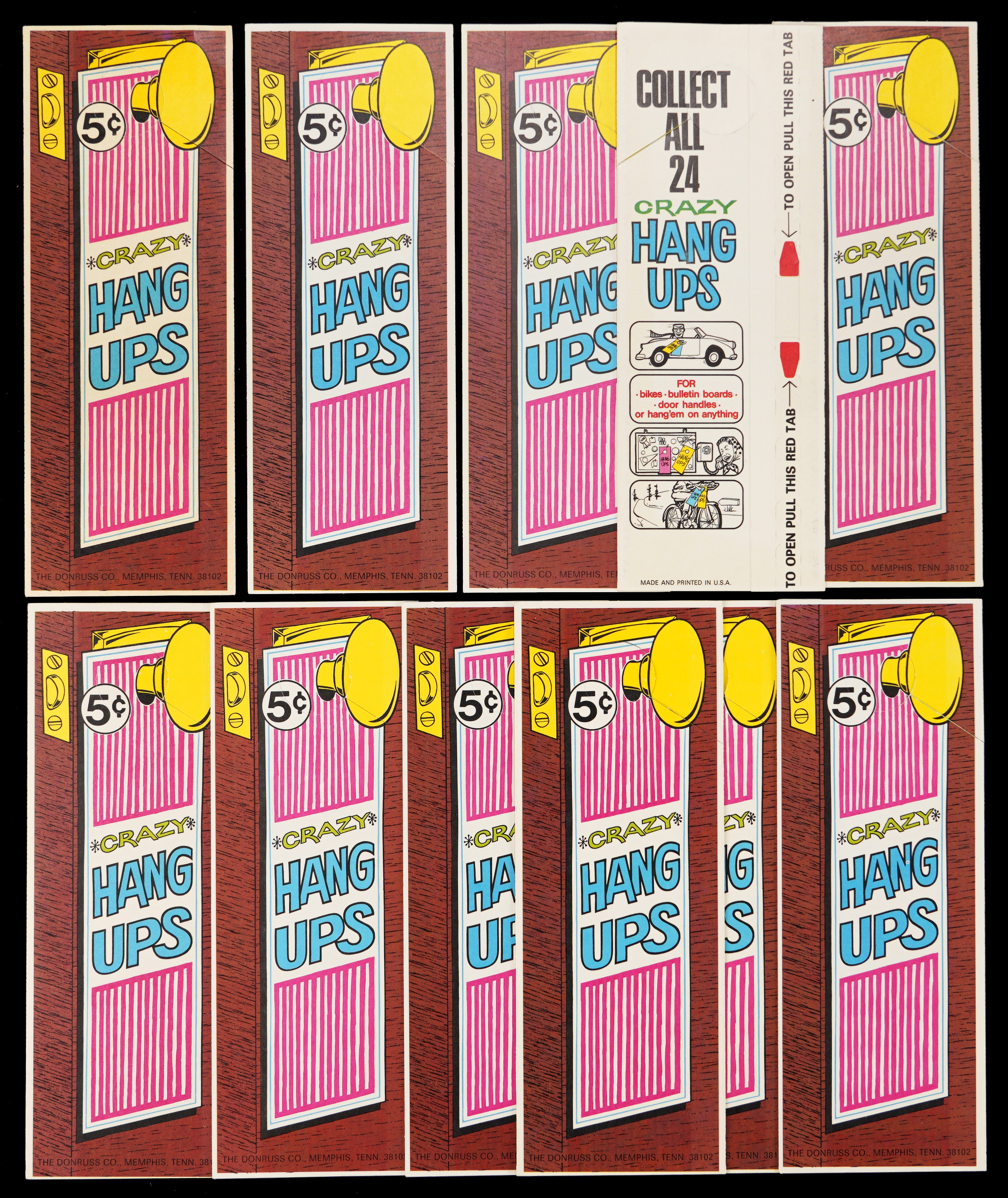 Zany collection of (11) 1967 Donruss Crazy Hang Ups unopened packs. These lengthy 5-cent packages are incredibly scarce and measure 10-3/8 x 3-3/4" with the packs being secured by a pull tab. This offbeat series featured funny and irreverent knee-slappers that were printed on large-sized cards that were designed to be placed on door knobs, car rearview mirrors, bicycle handle bars or anywhere with a hook.