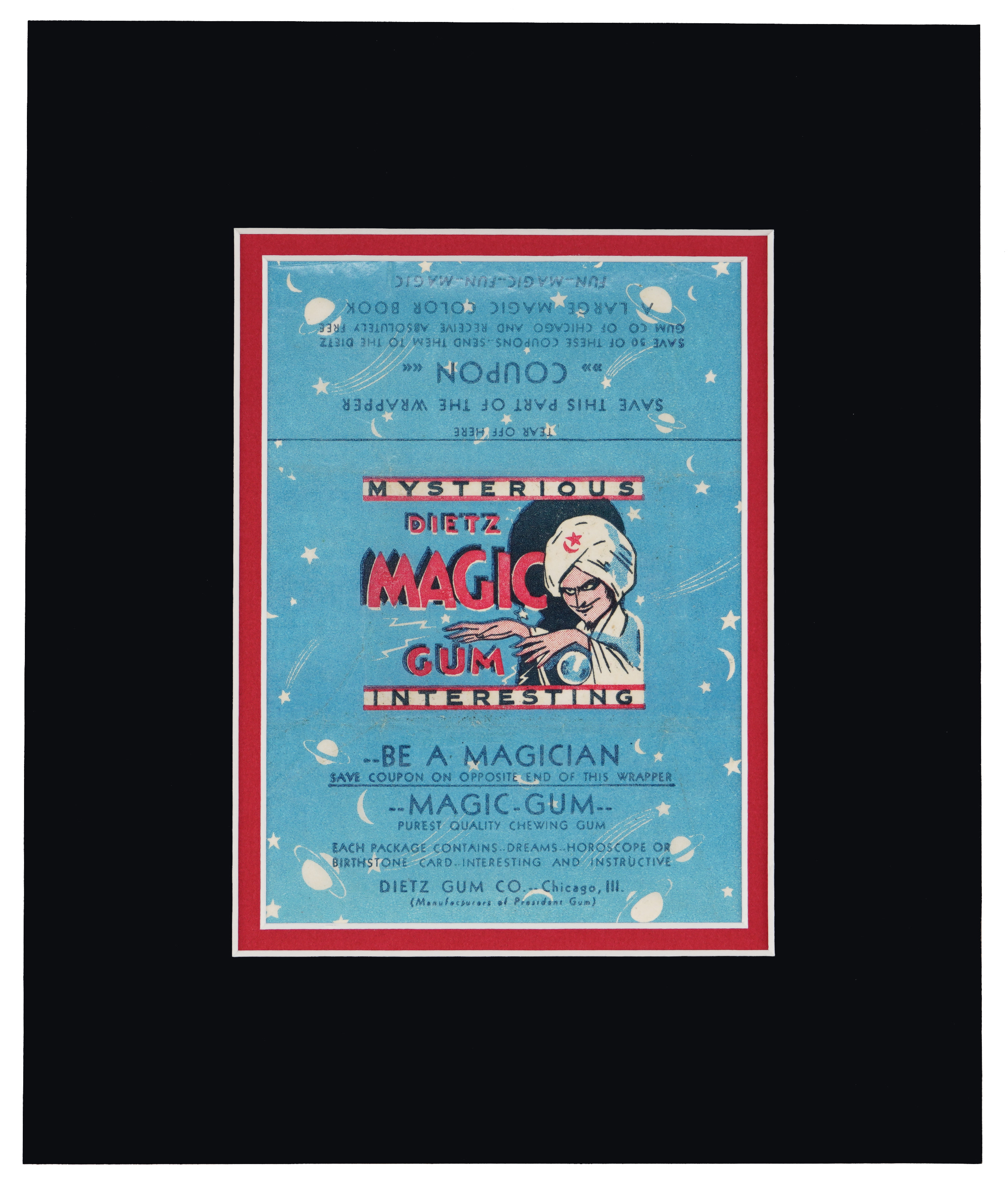 Mesmerizing 1930s Dietz Gum Co. Magic Gum wax pack wrapper. This spellbinding exemplar is incredibly scarce and once held a "dreams-horoscope or birthstone card. Interesting and instructive." Secured in a black velvet matte with overall 9 x 10-1/2" dimensions. The visual portion presents high-grade with compelling fortune teller imagery that is both "mysterious" and "interesting." The condition of the hidden portion affixed to the matting is unknown and we can't determine if it can be removed safely.
