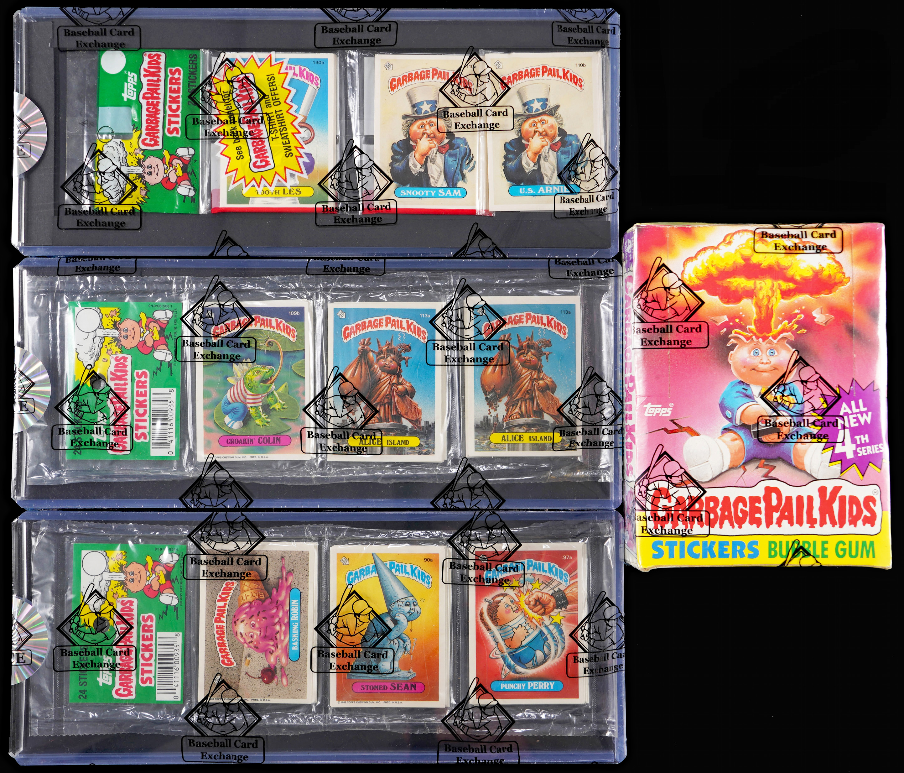 The irreverence of the Topps Garbage Pail Kids franchise is truly mind-blowing with these four 1986 unopened items. Includes: 1-3.) (3) 1986 Topps Garbage Pail Kinds Series 3 unopened racks (24 stickers per) and 4.) 1986 Topps Garbage Pail Kids Series 4 unopened wax box (Purple Cloud, without prices). Each item comes shrink-wrapped by Baseball Card Exchange (owned by Steve Hart, the foremost expert on unopened material).