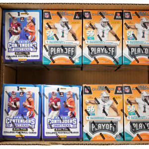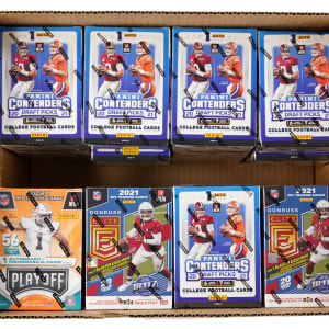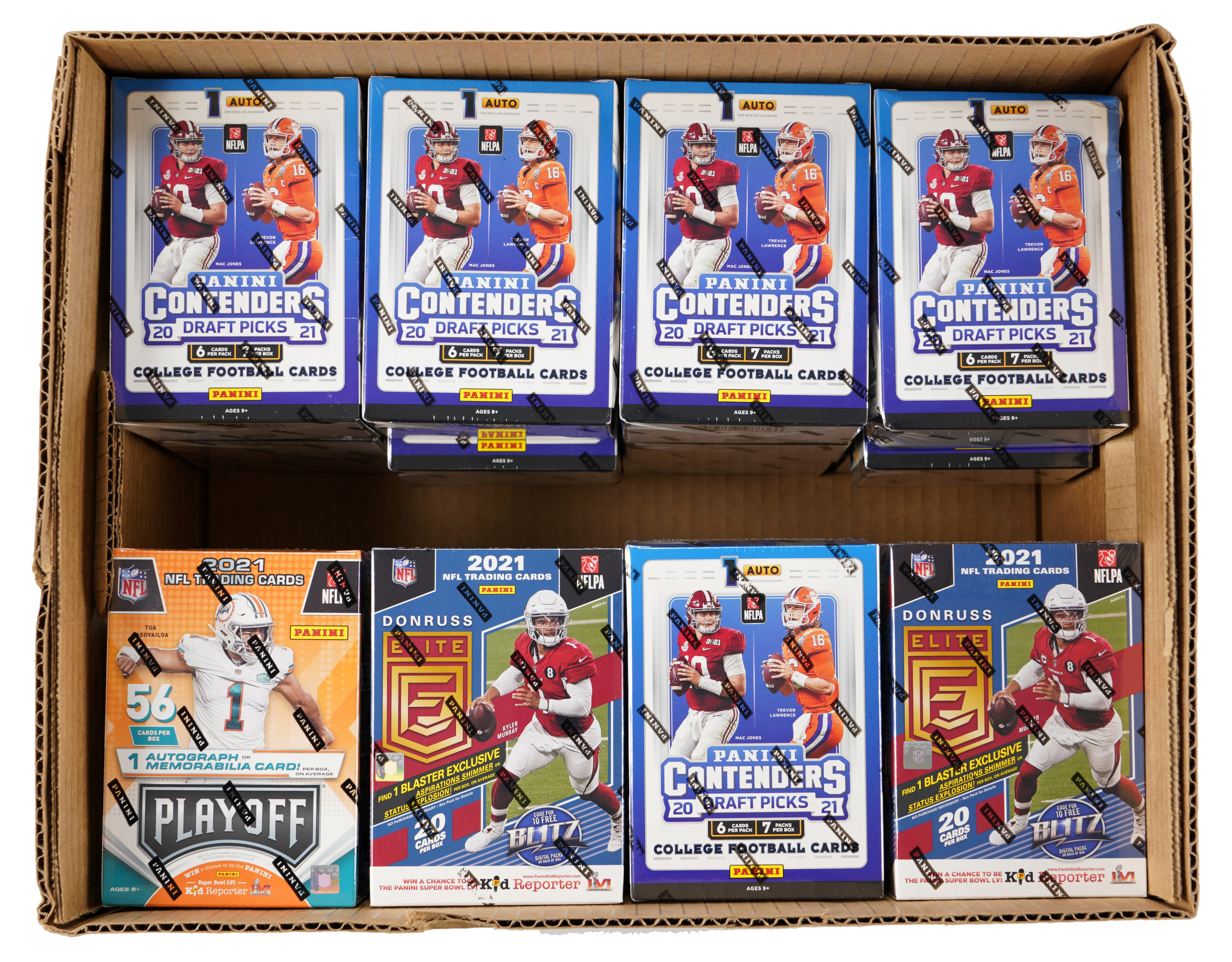 Blitz the bidding competition for these two dozen 2021 Panini Football product unopened blaster boxes. Find blaster exclusives, tough parallels, tiered subsets and certified auto/game-used memorabilia inserts at varying odds. Keynote rookies seeded throughout these products include: Ja'Marr Chase, Nico Collins, Travis Etienne Jr., Trevor Lawrence, Micah Parsons, Amon-Ra St. Brown, DeVonta Smith and several others! Includes: (8) Donruss Elite with (4) 5-card packs per; (11) Panini Contenders with (7) 6-card packs per and (5) Playoff with (7) 8-card packs per (one autograph or memorabilia card). The size/weight of this item requires that there will be an additional shipping charge for this lot.