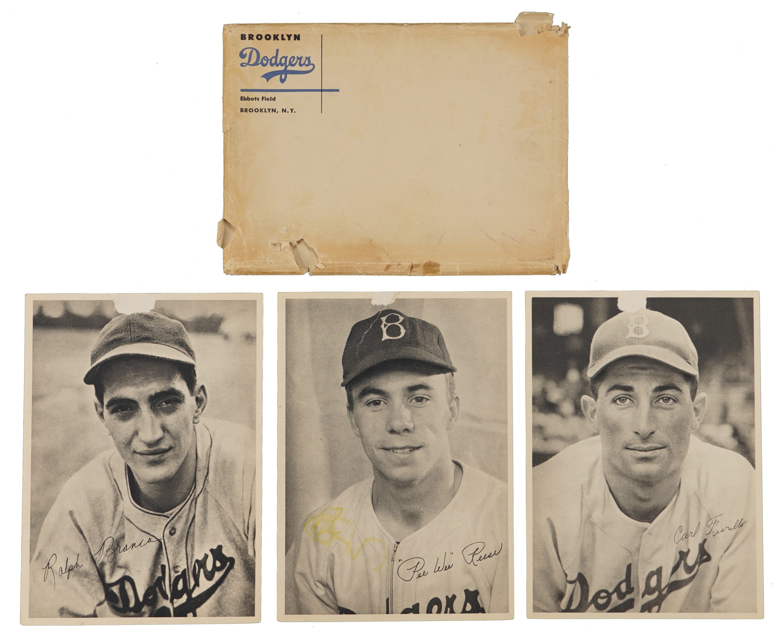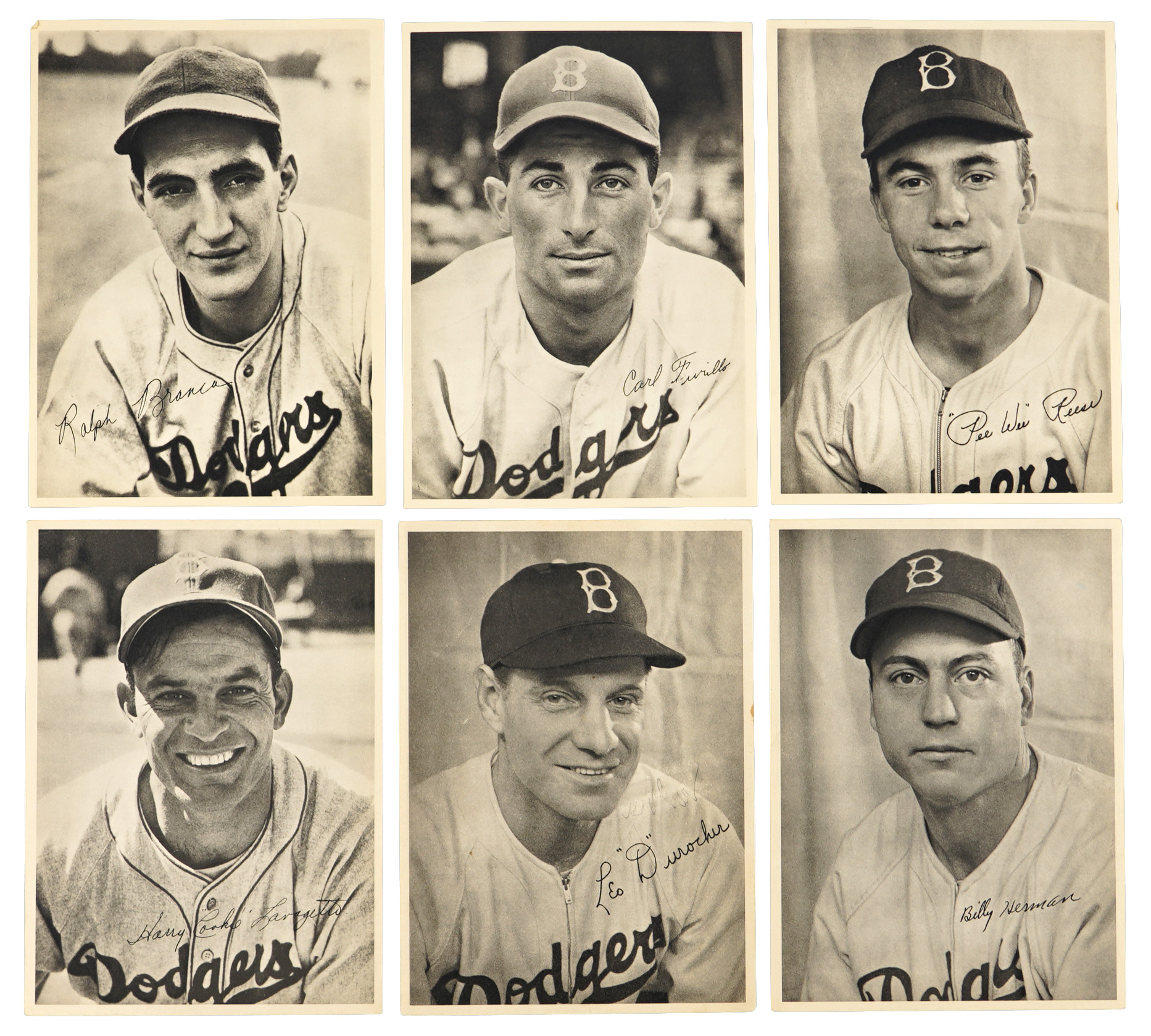 1946 Brooklyn Dodgers Picture Pack set: (25/25 photos, average EX-MT, plus 12 dupes averaging PR due to paper loss and moderately worn original mailer including slight tearing) with (2) Branca RC (one EX, one PR, paper loss), Durocher (FR, erased writing), (2) Furillo RC (one EX-MT, one PR, paper loss), Herman (EX-MT), Lavagetto (EX), (2) Reese (one EX-MT, one PR, paper loss), (2) Reiser (one EX, one PR, paper loss);
