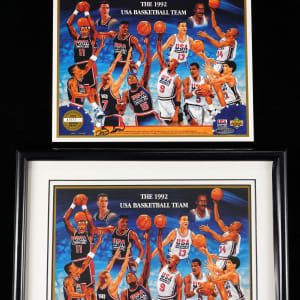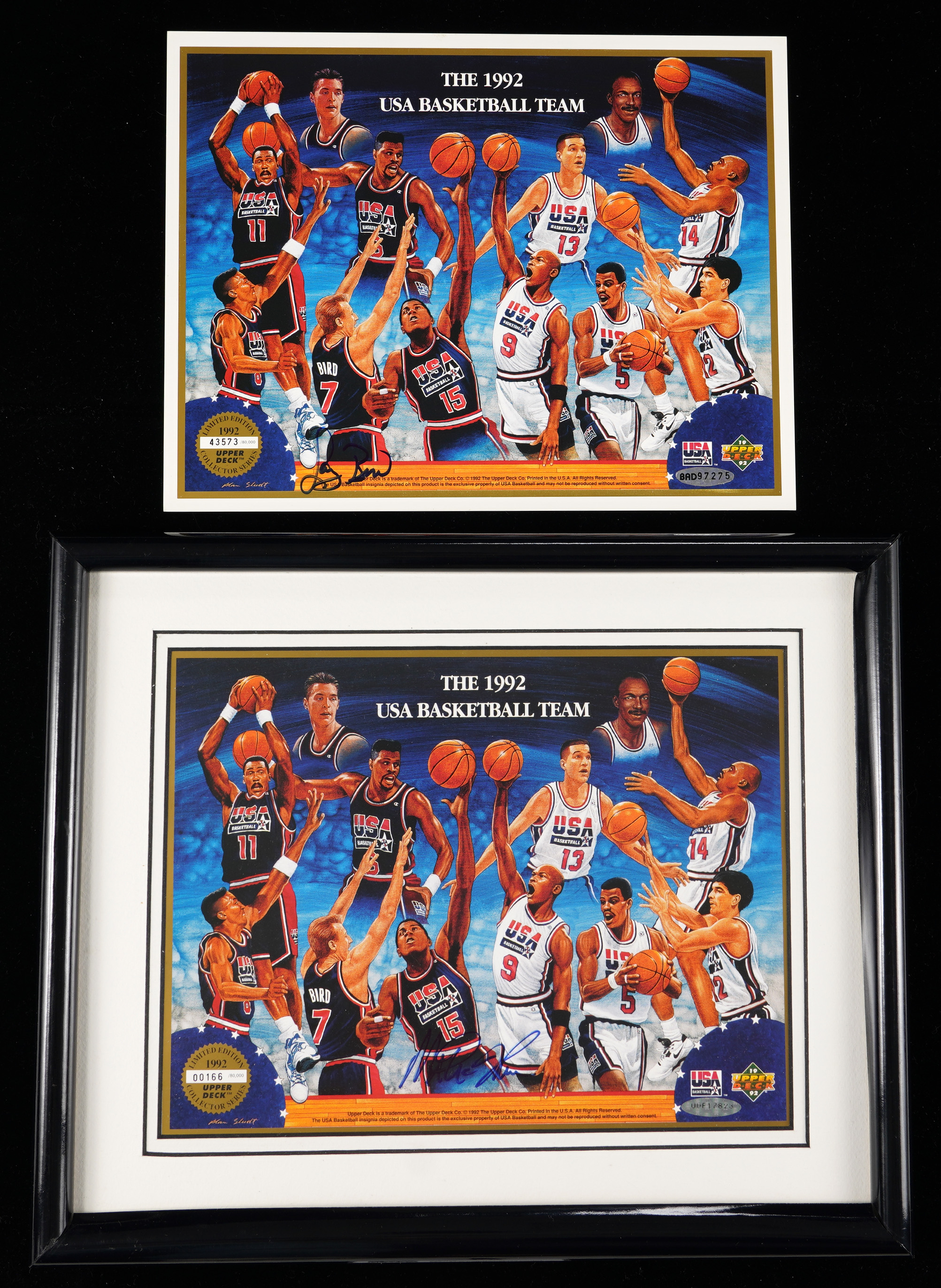 The classic rivals, Larry Bird and Magic Johnson, have each signed by their image in these (2) 1992 USA Basketball Team “Dream Team” Limited Edition 1992 Upper Deck 8x10 artwork. The Larry Bird is numbered 43573, while the Magic Johnson is numbered 00166. Both autographs grade (“8-9”). The Magic Johnson has been framed to14x12.