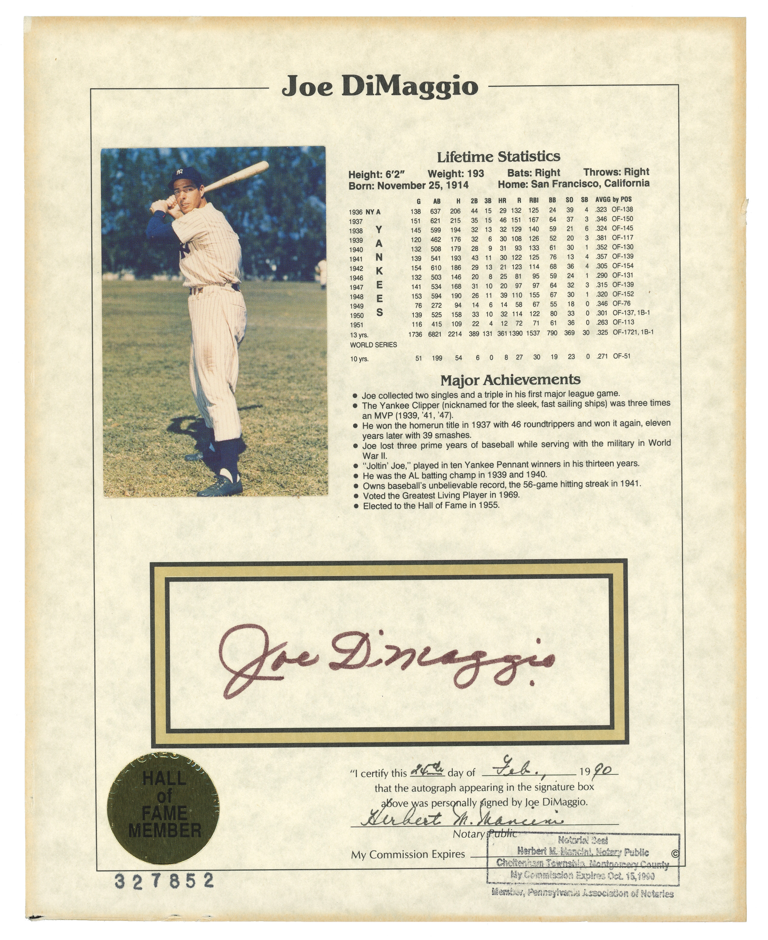 Joe DiMaggio’s remarkable achievements are proclaimed on this signed 8" x 10" Hall of Fame stat sheet. While viewing DiMaggio’s batting record and career highlights is an interesting way to spend your time, it’s the big fat DiMaggio signature at bottom, that will give you good reason to spend your money. Also seen on this “made for display” piece, is a batting pose photograph, a Notary Public signature and seal dated 2/24/90, and a gold sticker making the announcement “Hall of Fame Member”.