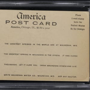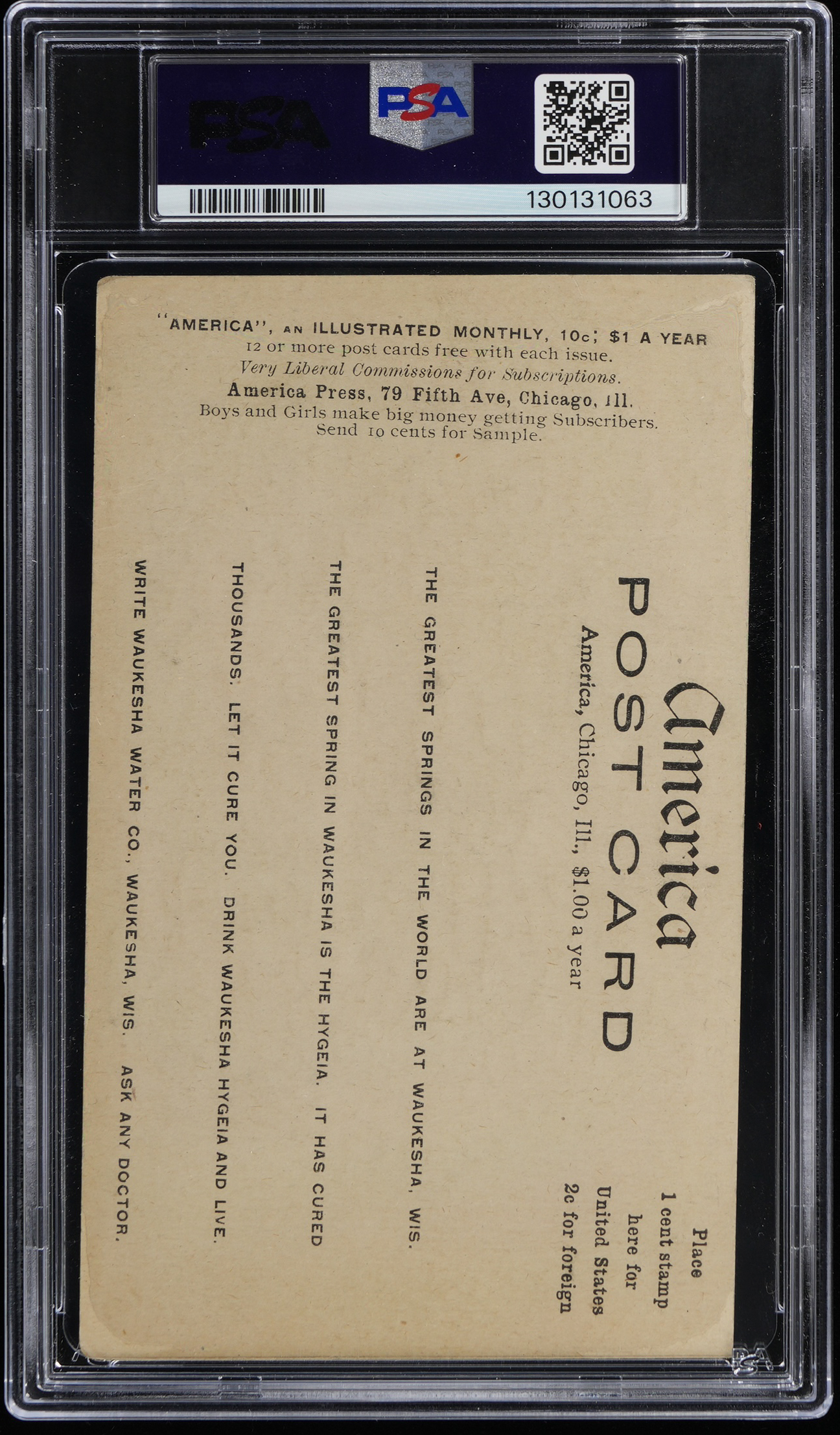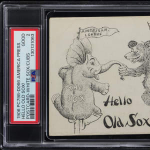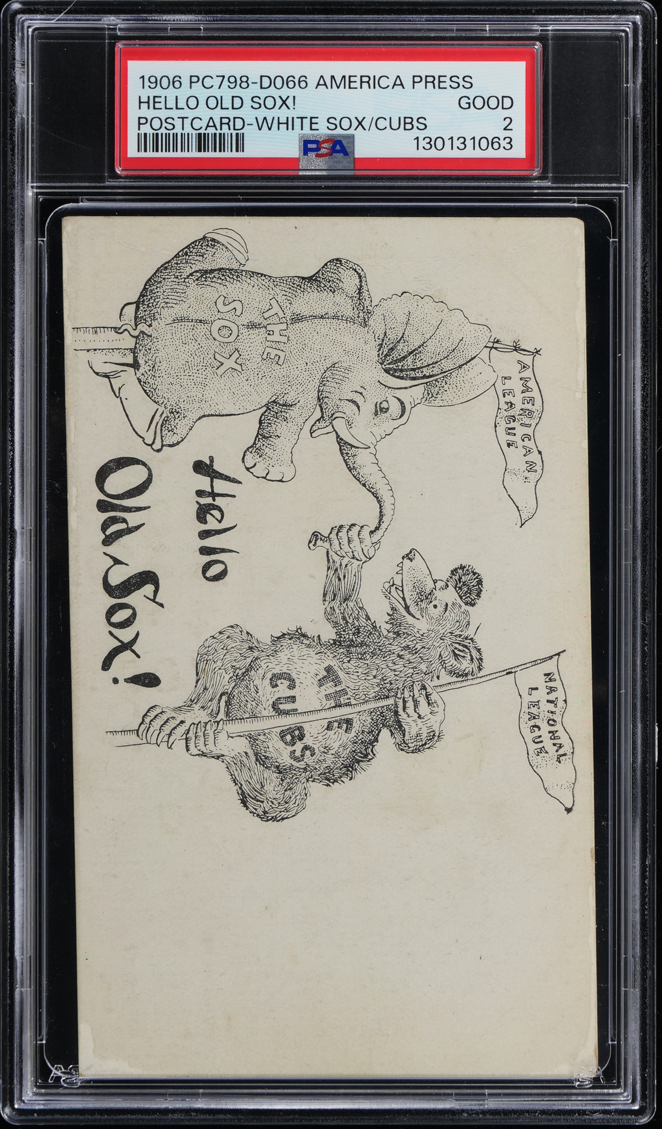 Only Graded Example! Graded GOOD 2 by PSA. "Windy City" historians will undoubtedly treasure the offered 1906 PC798-D066 Chicago White Sox vs. Chicago Cubs postcard. Published by America Press of Chicago while referencing Waukesha Water Co. of Wisconsin, this designation entitled "Hello Old Sox!" represents the first World Series pitting two franchises from the same city and the only meeting between the Chicagoland teams (the White Sox emerged victorious 4-2 games to capture the 1906 Fall Classic). This near impossible correspondence piece has survived the past 129 years in fine condition. The antique illustration picturing the Cubs mascot (National League) shaking the trunk of the White Sox elephant (American League) is both amusing and eye-catching. Despite creasing along the upper left corner (when viewed horizontally), limited perimeter wear and scant surface soiling, this museum quality piece has definitely withstood the test of time! The reverse black text referencing the Waukesha company's attributes is problem-free and absent of any writing or postmark.
