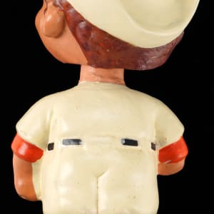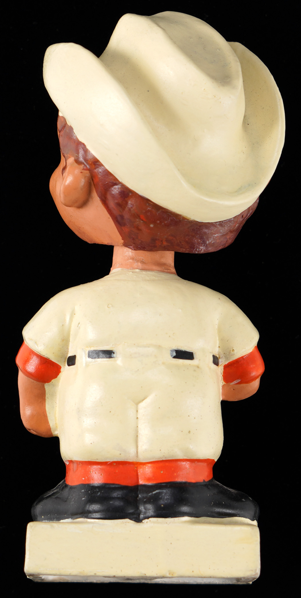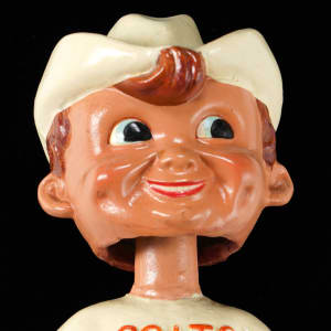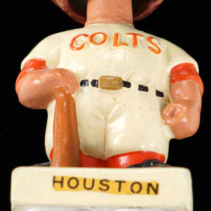 Be quick on the draw to take down this 1960s Houston Colt .45s white square base bobblehead. Considered a tougher example, this pint-sized mascot from the early 1960s is drenched in display appeal. However, it appears the head opening has been painted over, and there are a couple of short hairline cracks below the right ear. Despite these relatively minor conditions, this piece is still very handsome, showing Ex+ details, with pleasing paint and decal integrity.