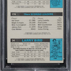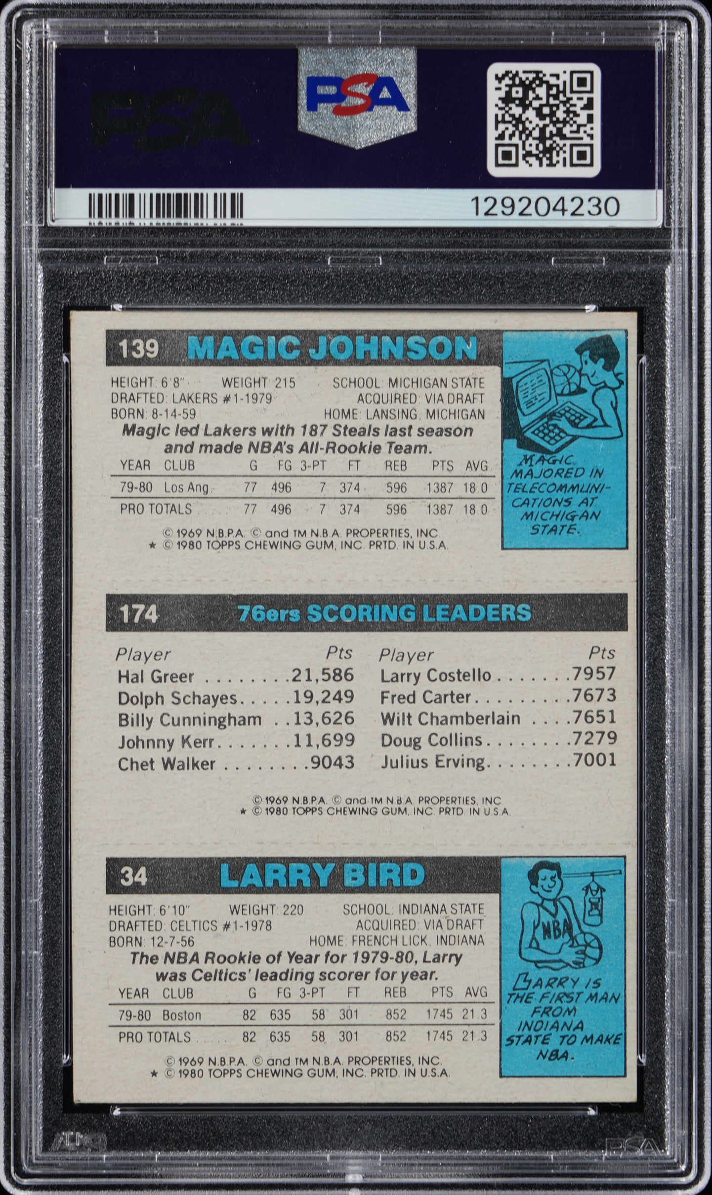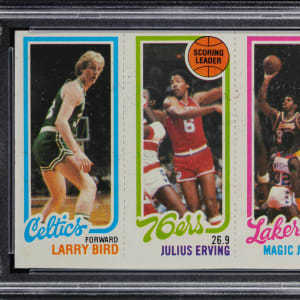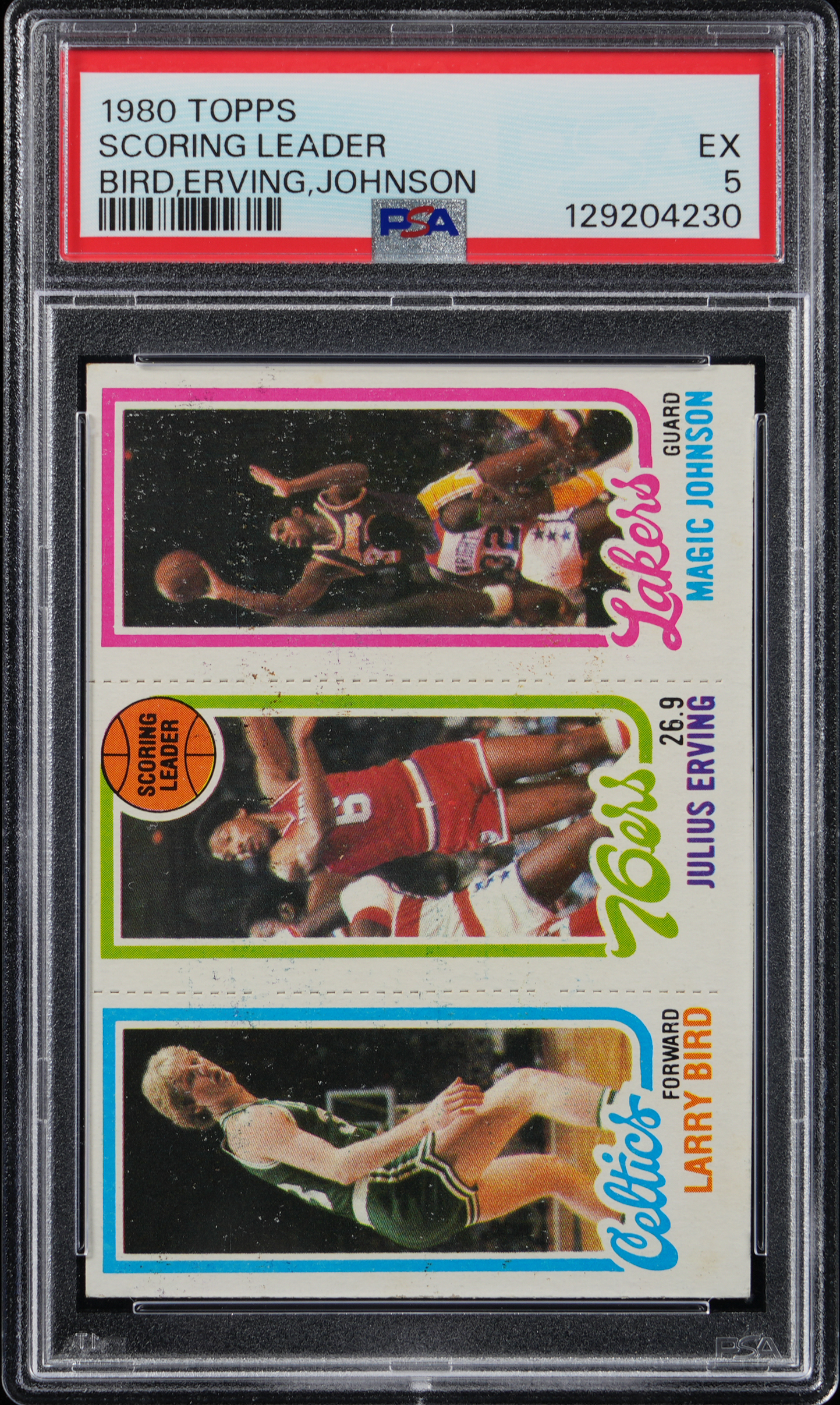 Graded EX 5 by PSA. Premium 1980-81 Topps Basketball Larry Bird/Julius Erving Leader/Magic Johnson rookie combination. One of the most important sports cards of the decade!
