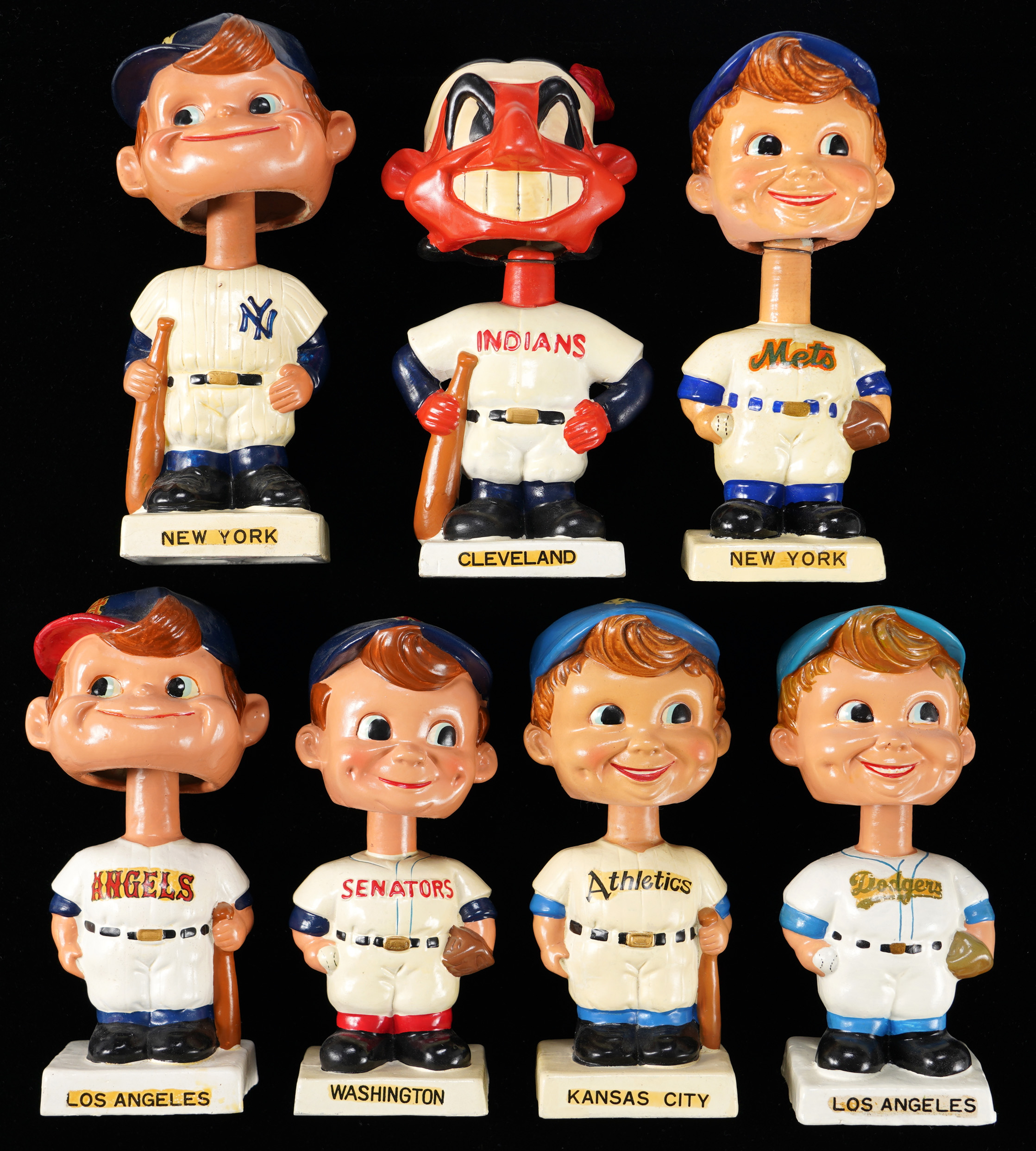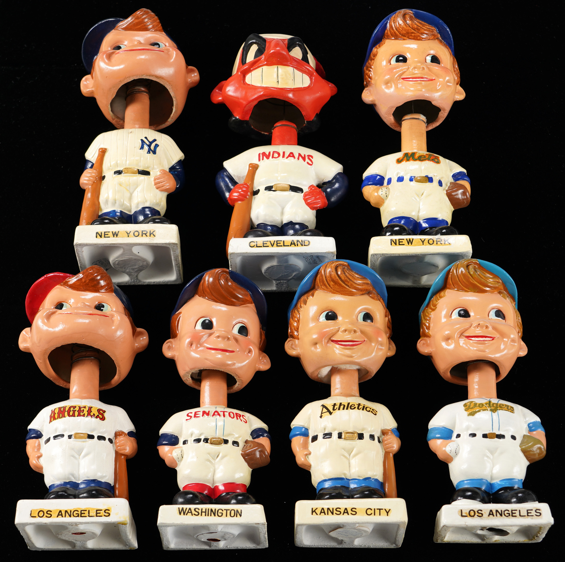MLB expansion was in full swing in the early 1960s, and the Japanese import bobblehead line was growing right along with the game. A healthy part of this souvenir growth spurt arrives, with the presentation of this 1961-1963 square white base bobblehead selection (7). These cheerful icons represent seven different MLB squads, including the 1961-1962 champions New York Yankees, perennial contenders and 1963 champions the Los Angeles Dodgers, Cleveland Indians mascot “Chief Wahoo”, several expansion teams, and the transplanted Kansas City Athletics. Approaching full senior citizen status, these vintage figures are nicely preserved and retain plenty of display appeal.